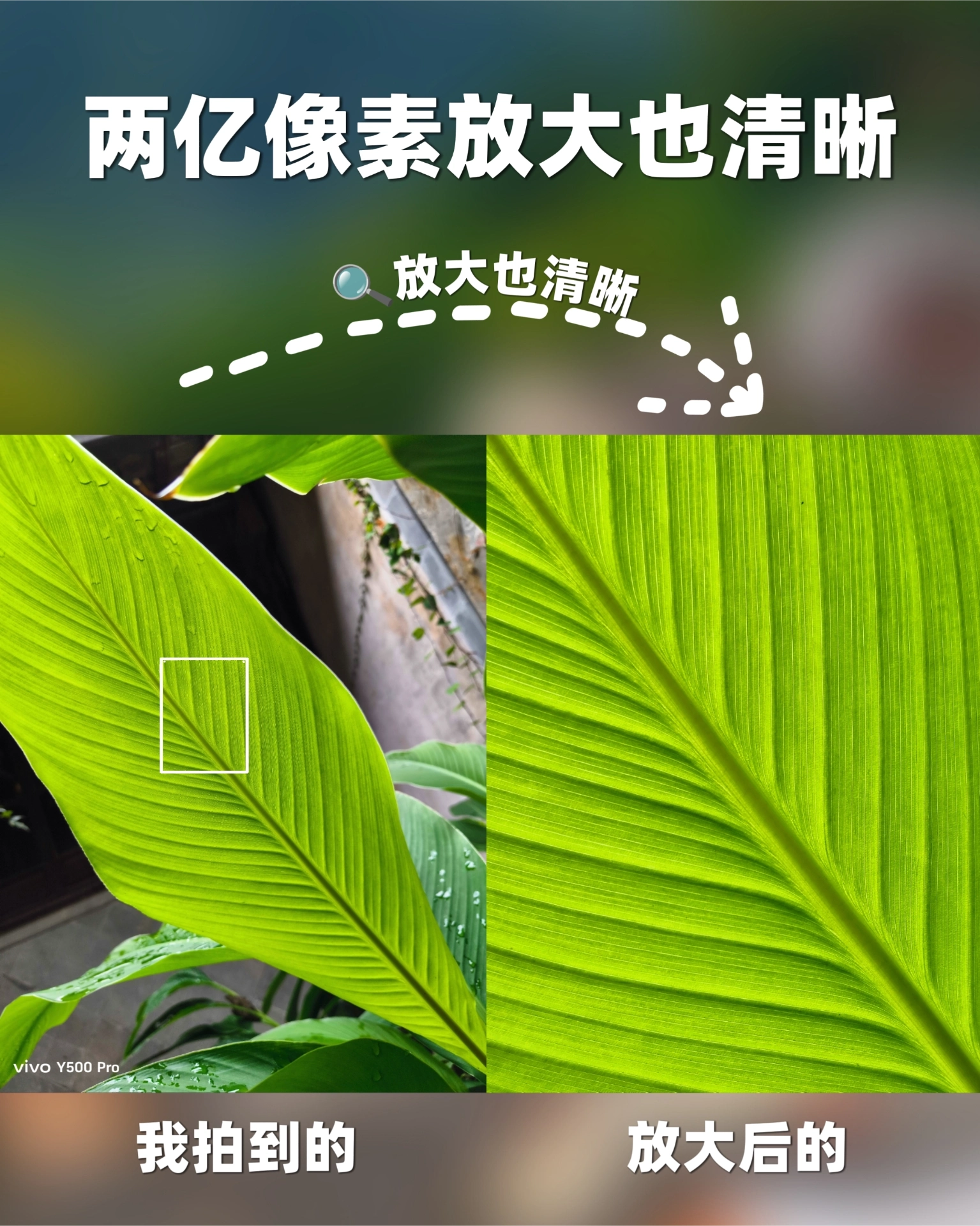 vivo Y500 Pro这次真六边形战士了!既要又要还要……你想要的影像、续航、防水防摔等等,这次都给了! 📷2亿超清晰 放大有惊喜 🪽搭载三星HP5 大底传感器和自研OIS超级防抖,超清直出细节大片~照片只能“远观”?no!Y500 Pro“近观”表现力依旧在线,看我p3拍的叶子,纹理全都清晰可见!!(直接一整个惊艳到了🥰) 🪽长焦增强算法,至高可以拉到30倍的超清变焦!谁说距离远=拍不清...