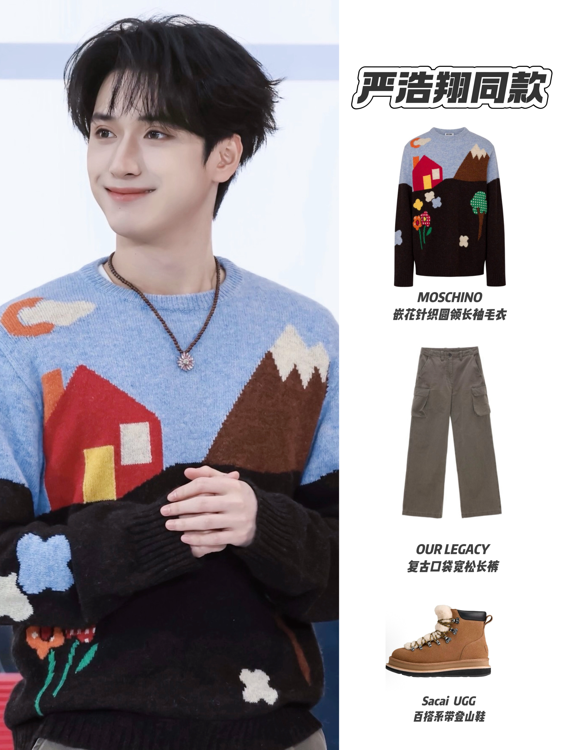 被严浩翔好六夜这套造型戳中!满满的元气少年感~ MOSCHINO童趣毛衣自带软萌氛围,搭配OUR LEGACY宽松工装裤,松弛又随性,Sacai UGG登山鞋的毛绒细节添了点软乎乎的少年气,整体清爽不拖沓,是元气又舒服的少年感范本😉