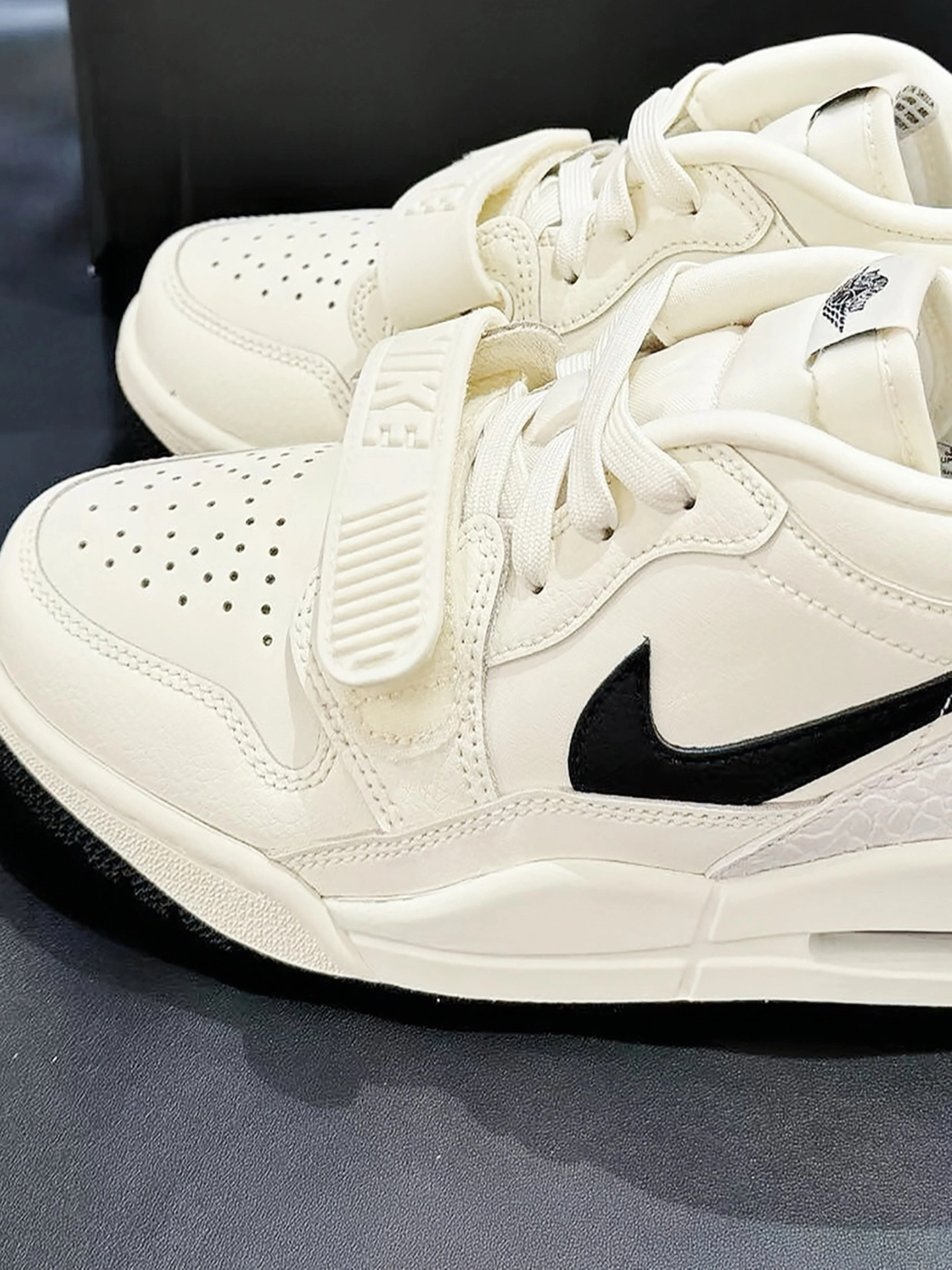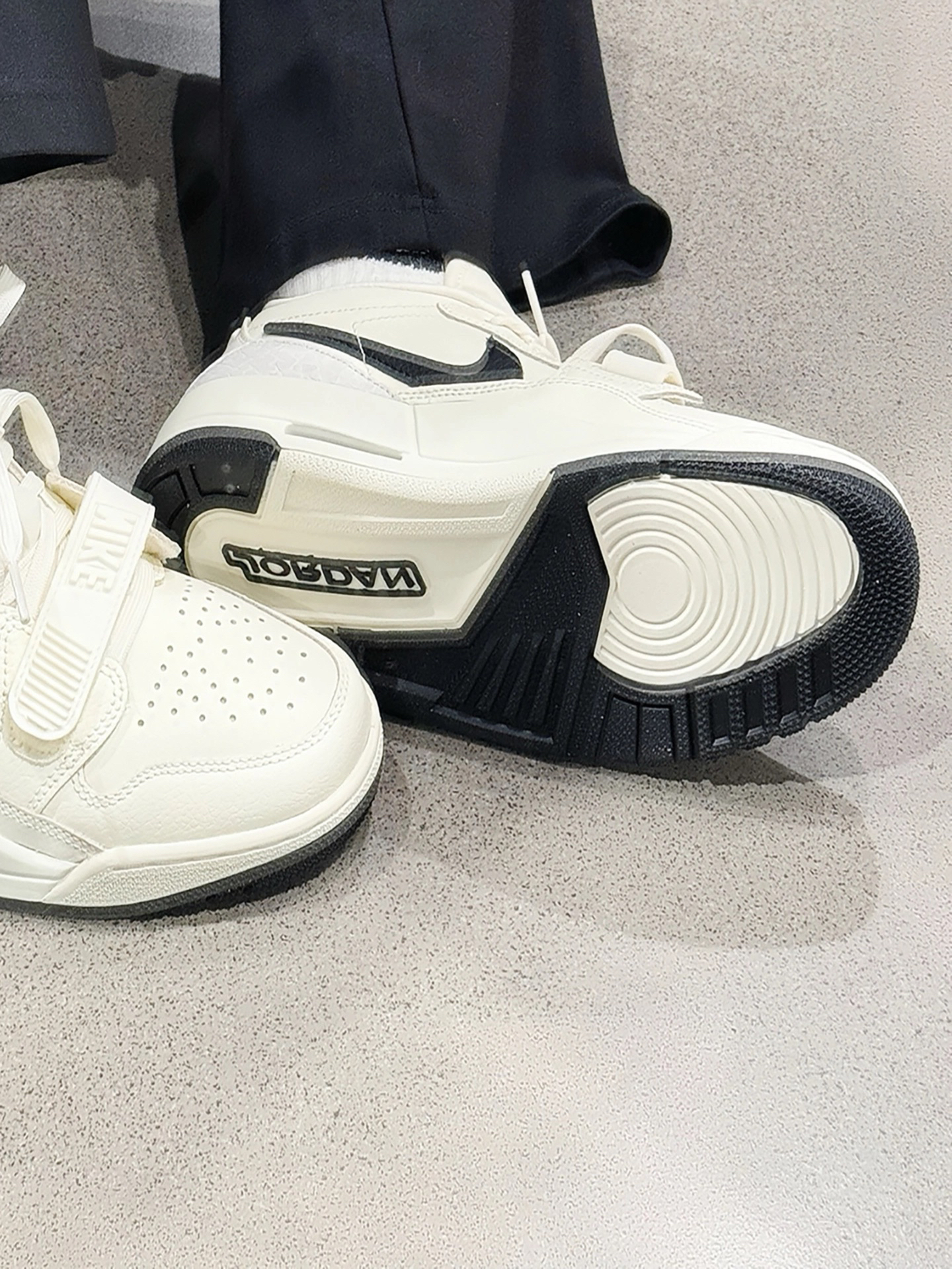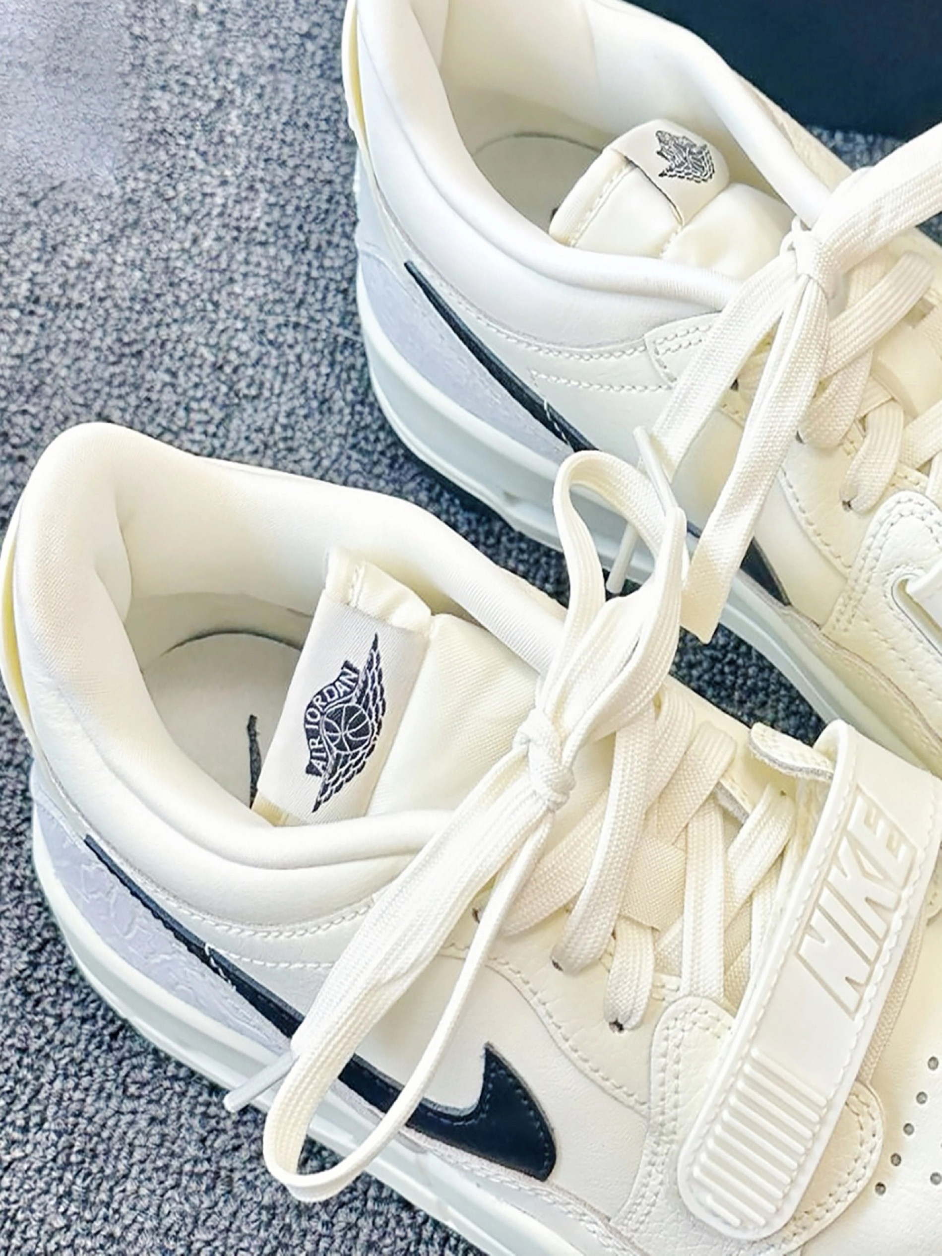 家人们,新入手的这双AJ真的绝了! 奶白色鞋面超百搭,怎么穿都好看。黑色钩子和后跟的特殊纹理,细节感满满 鞋面是好打理的皮革材质 搭配衣服也很好搭配穿个卫衣,休闲服,牛仔裤都很合适 刚入手的时候,我开心的穿着它在商场逛了一大圈,搭配身上穿的白色休闲服,整个人看起来很时尚,朋友也夸我选的鞋子好看。而且我穿着它走了一天,我感觉脚感很舒服,一点也不觉得累脚