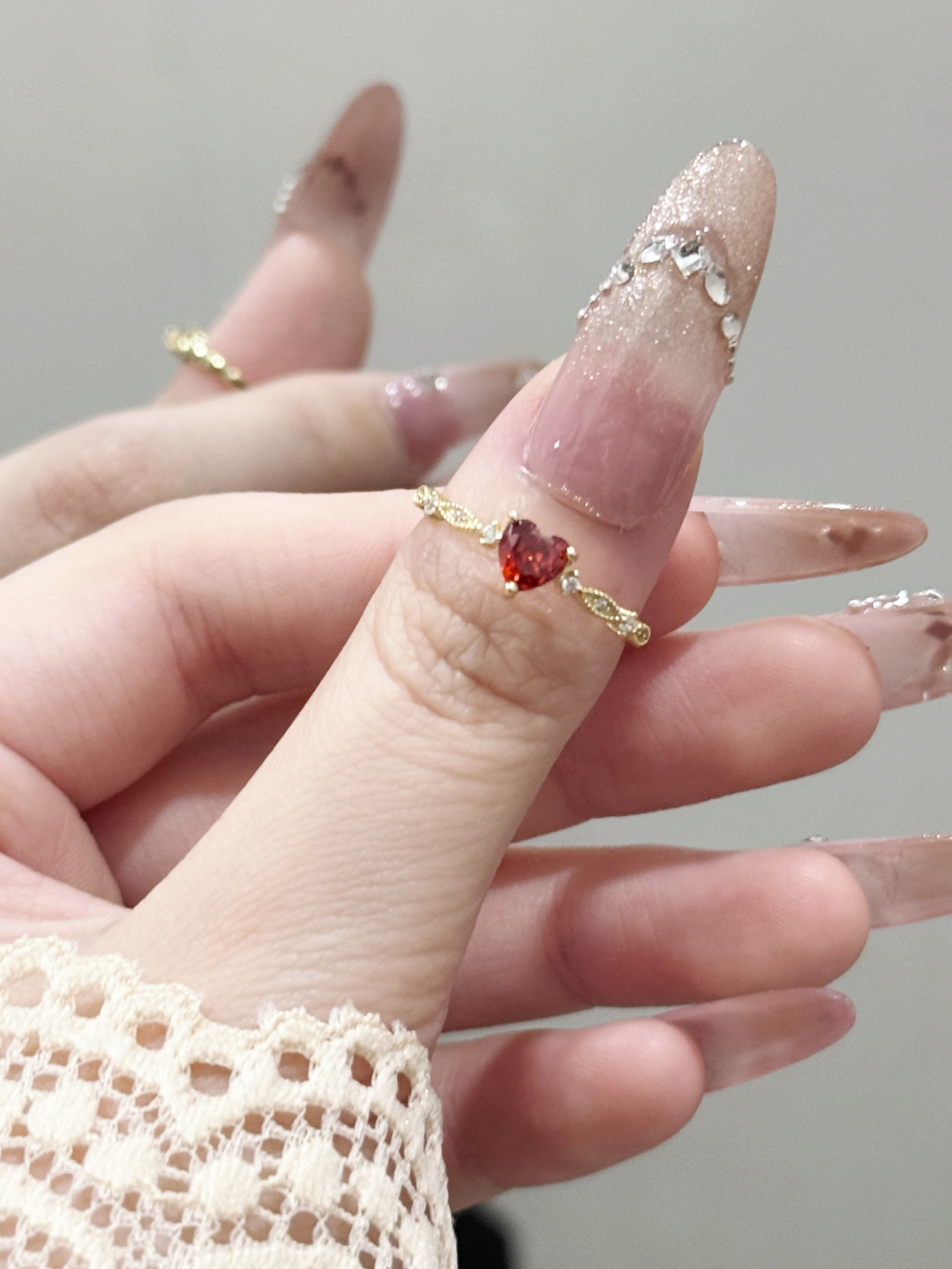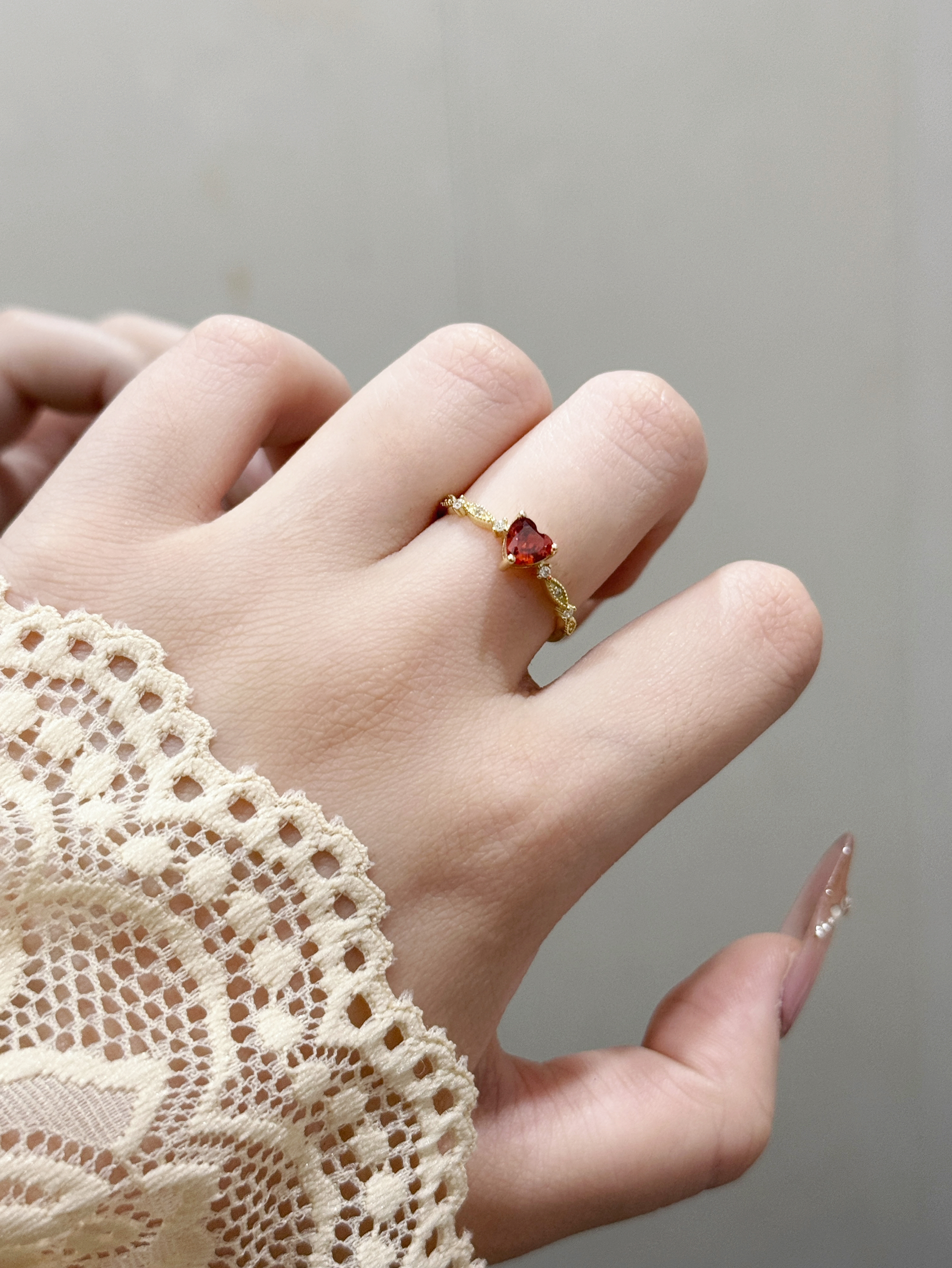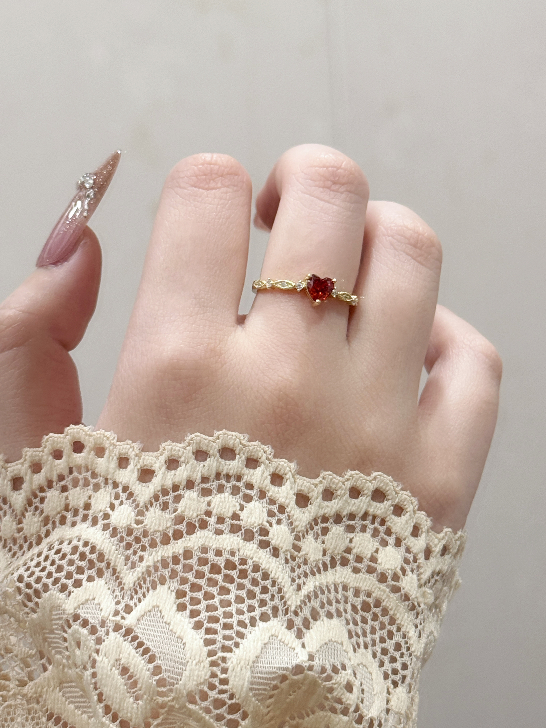 这枚红爱心锆石戒指真的长在我的审美点上了!细巧的金链戒身搭配一颗通透的红爱心锆石,旁边还缀着小碎钻,精致得不像话~戴在指尖超显手细,不管是搭美甲还是日常戴,都能悄悄提升精致感,甜妹必备的小心机配饰就是它啦