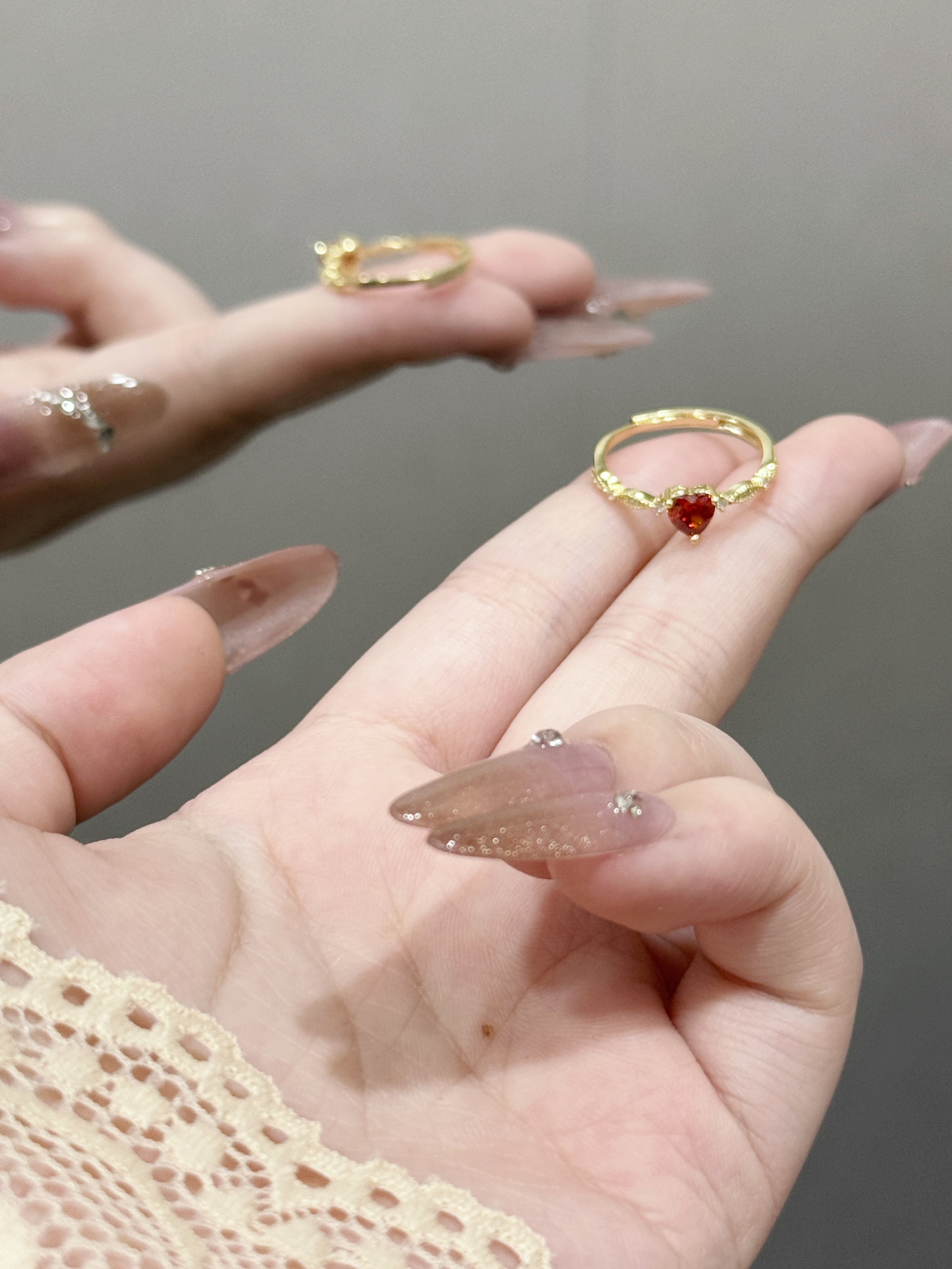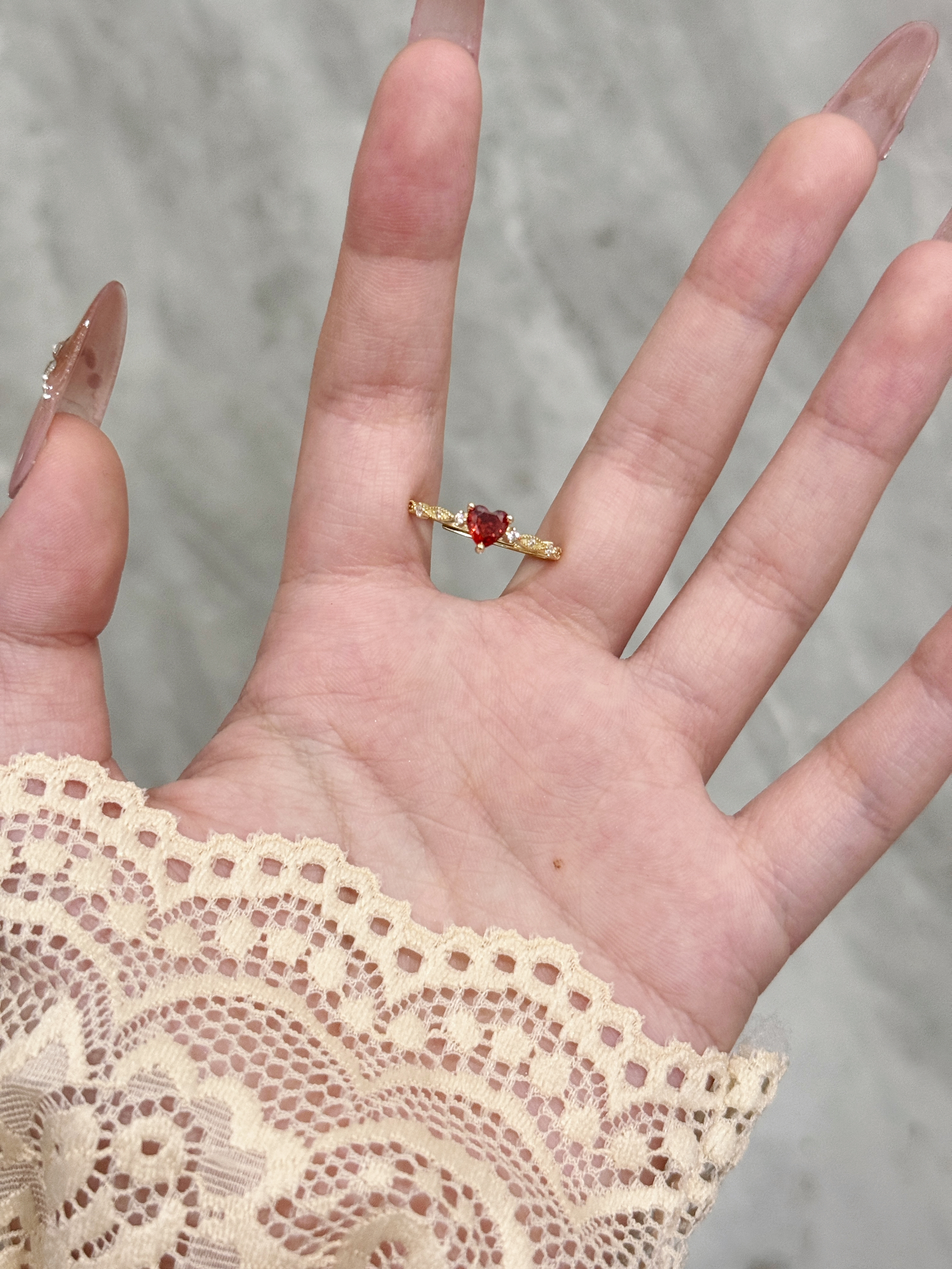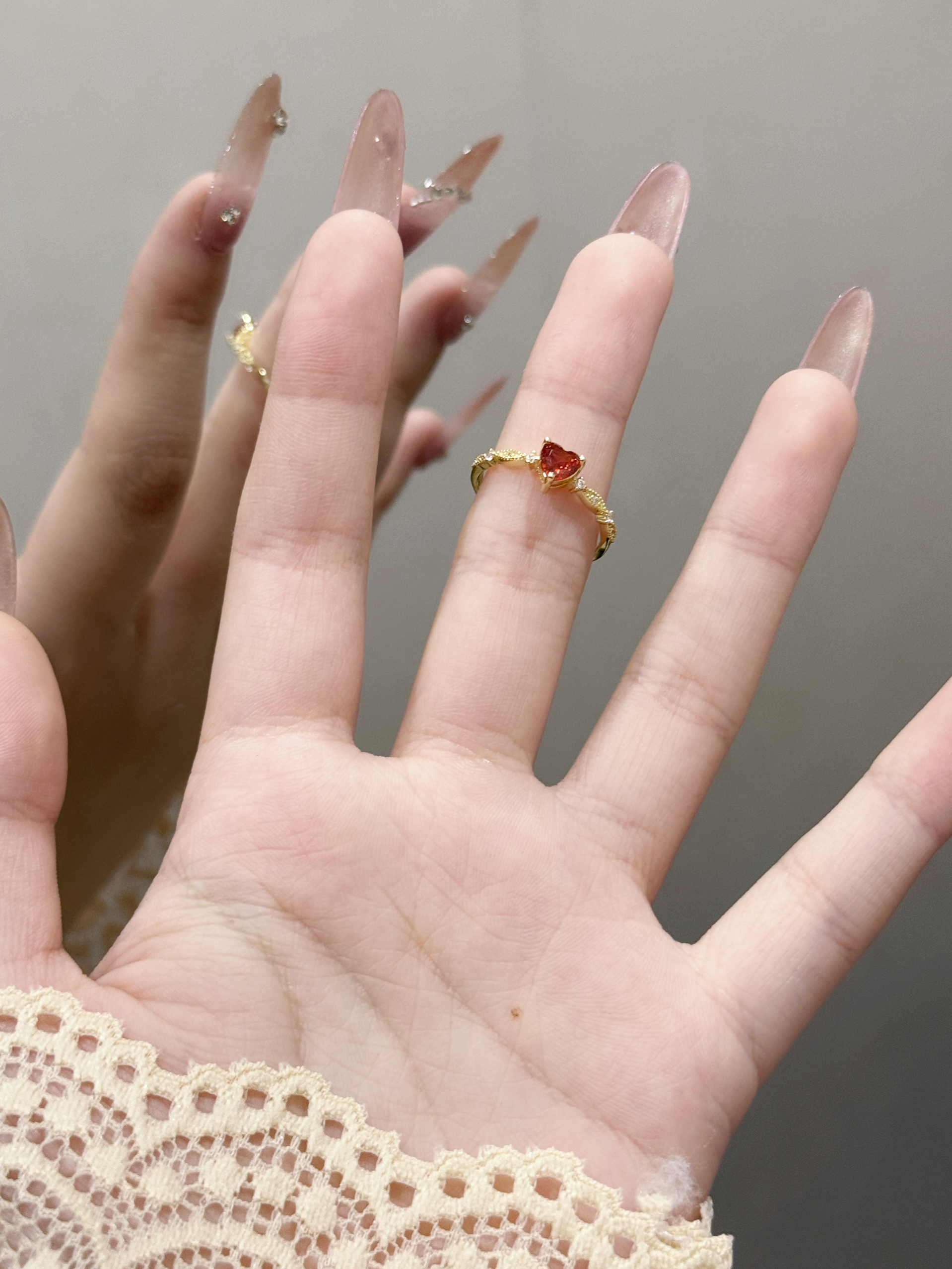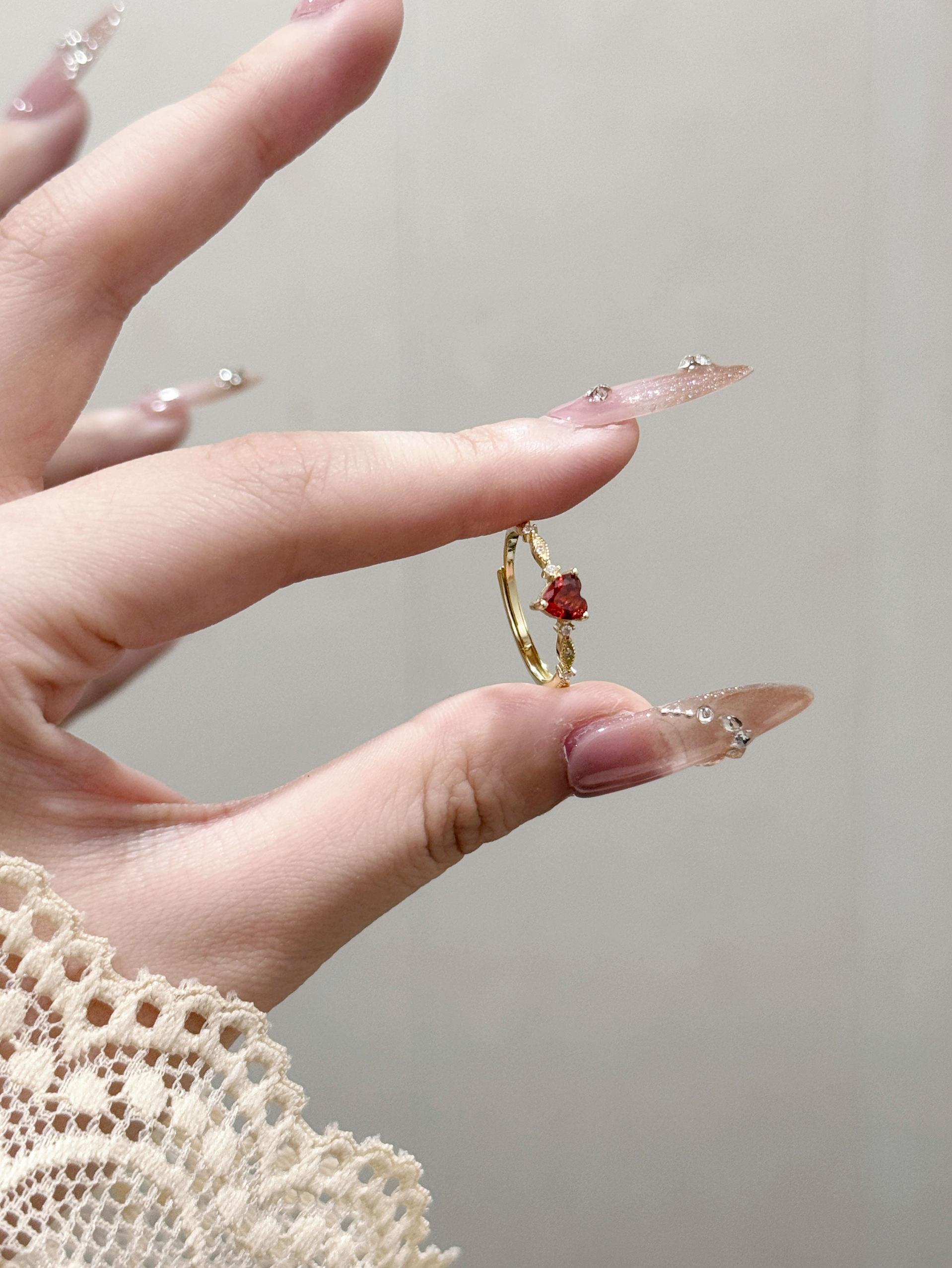 这枚红爱心锆石戒指真的长在我的审美点上了!细巧的金链戒身搭配一颗通透的红爱心锆石,旁边还缀着小碎钻,精致得不像话~戴在指尖超显手细,不管是搭美甲还是日常戴,都能悄悄提升精致感,甜妹必备的小心机配饰就是它啦