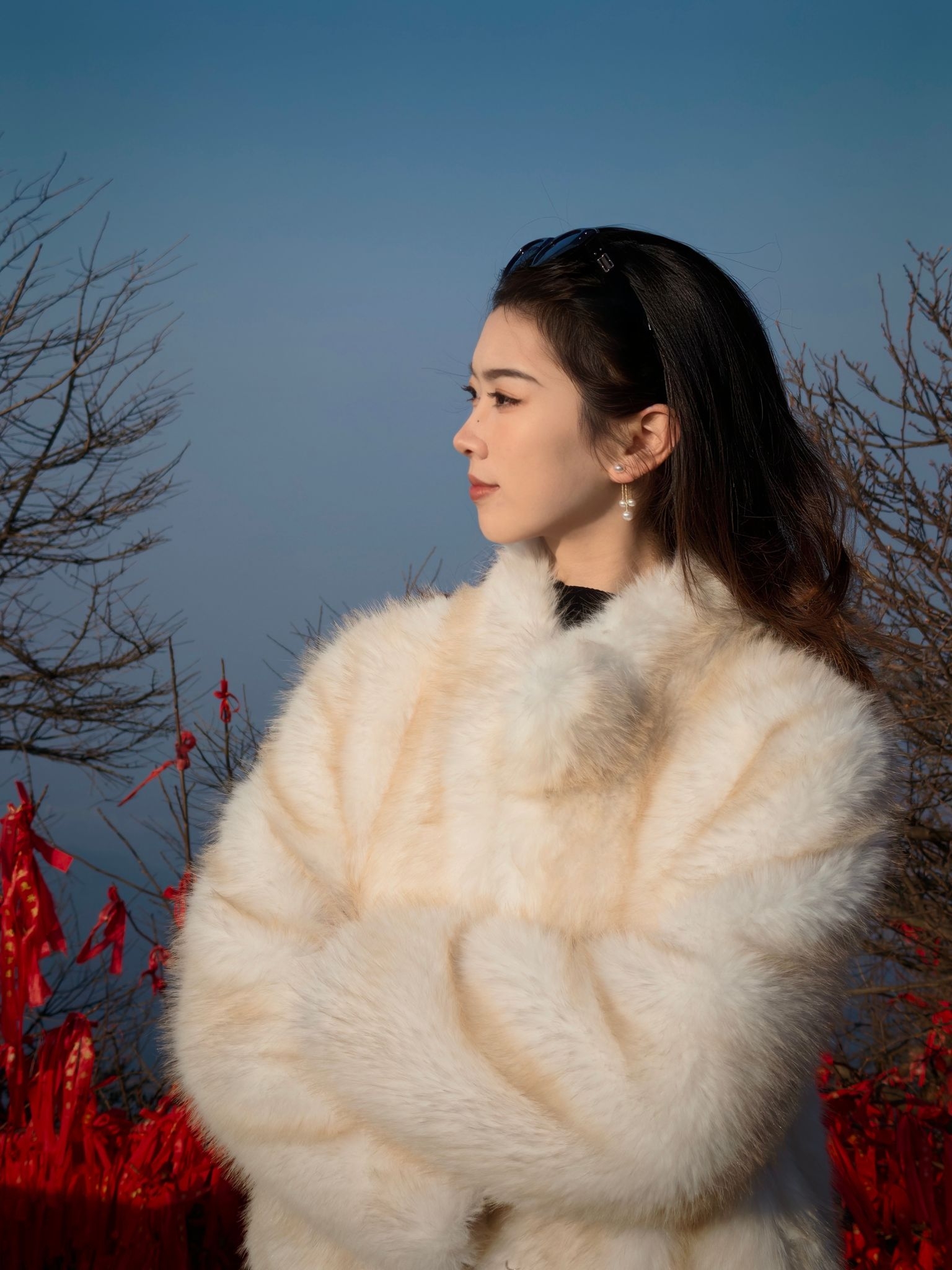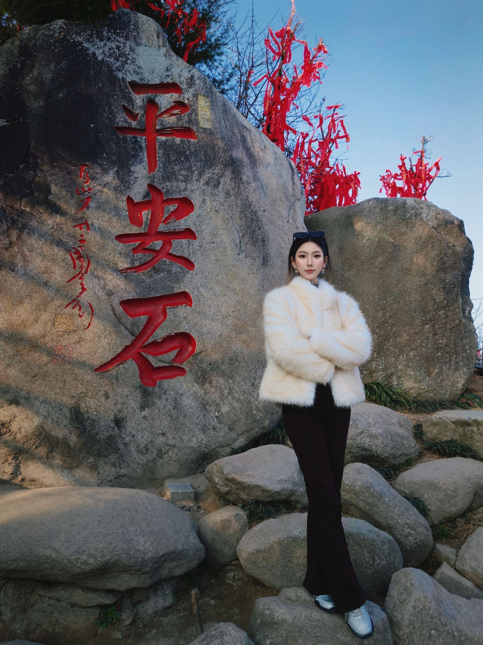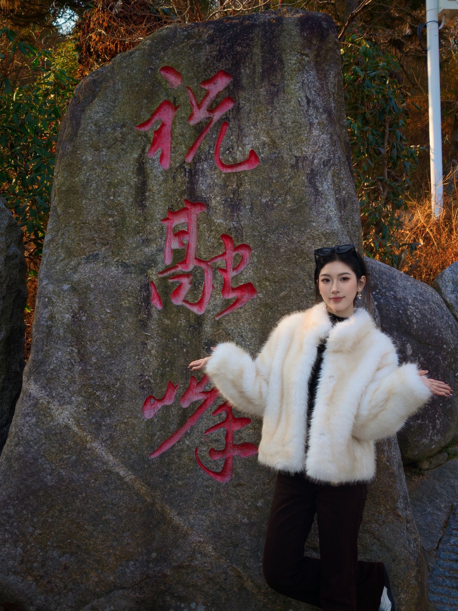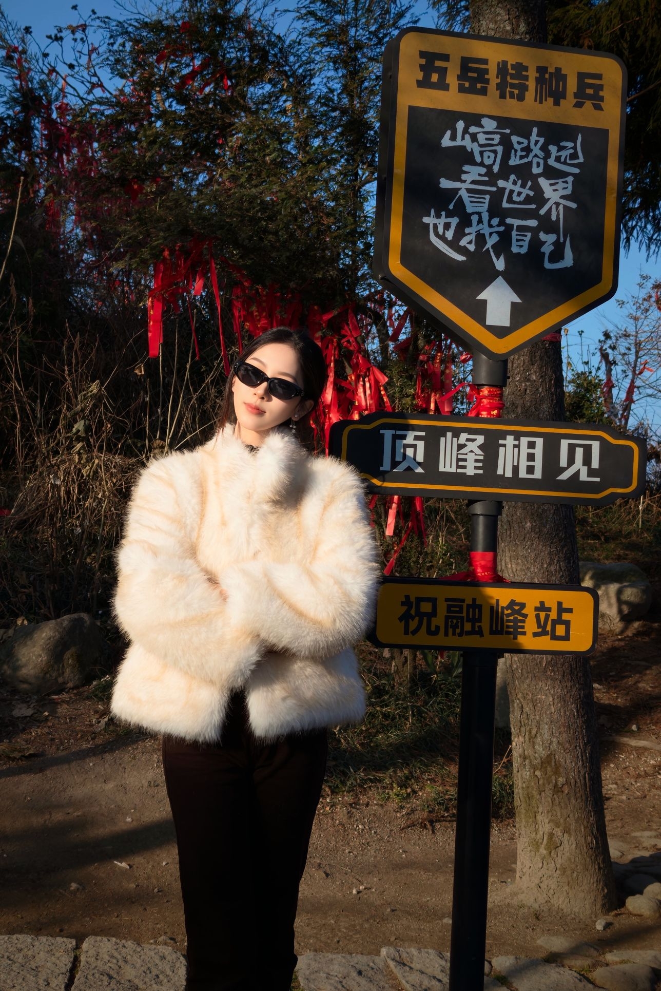 哈哈哈 穿着我的小皮草就是爬 一路走上去回头率超高 看着闲庭信步非常轻松啊 其实主包只是在穿的漂亮的时候包袱比较重 忍耐力超高哈 实则要累厥过去了 山上阳光足拍照的时候太阳晒衣服上 此衣更美到犯规 感觉在发光一样 超显贵气呀!