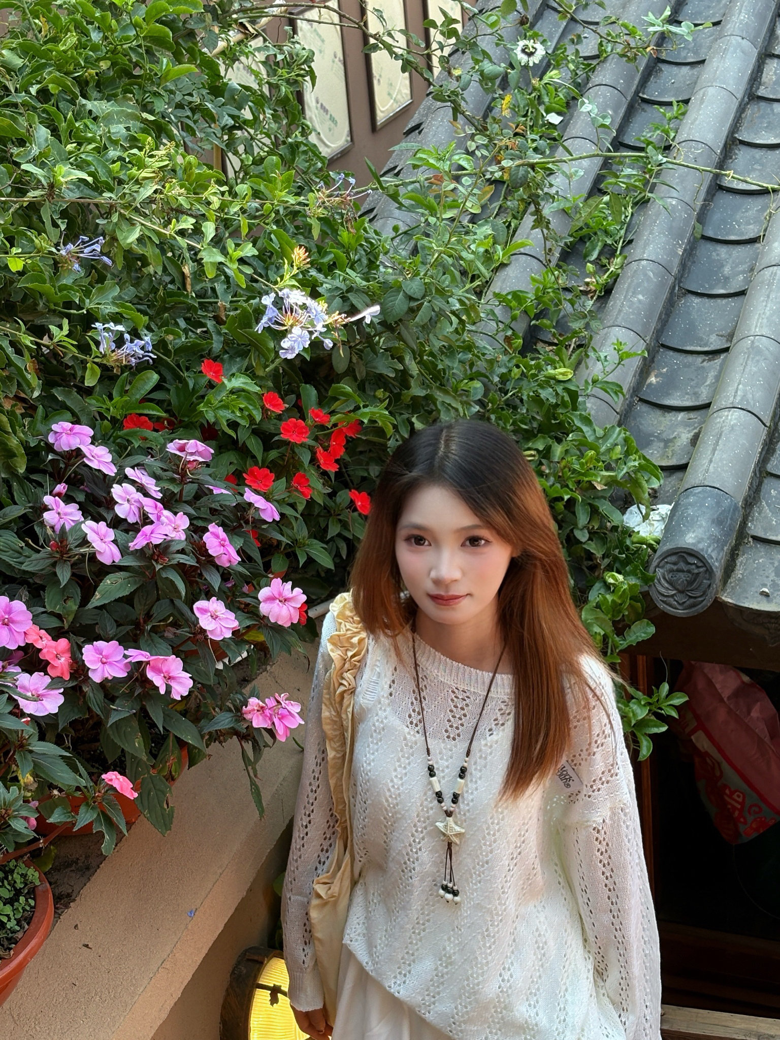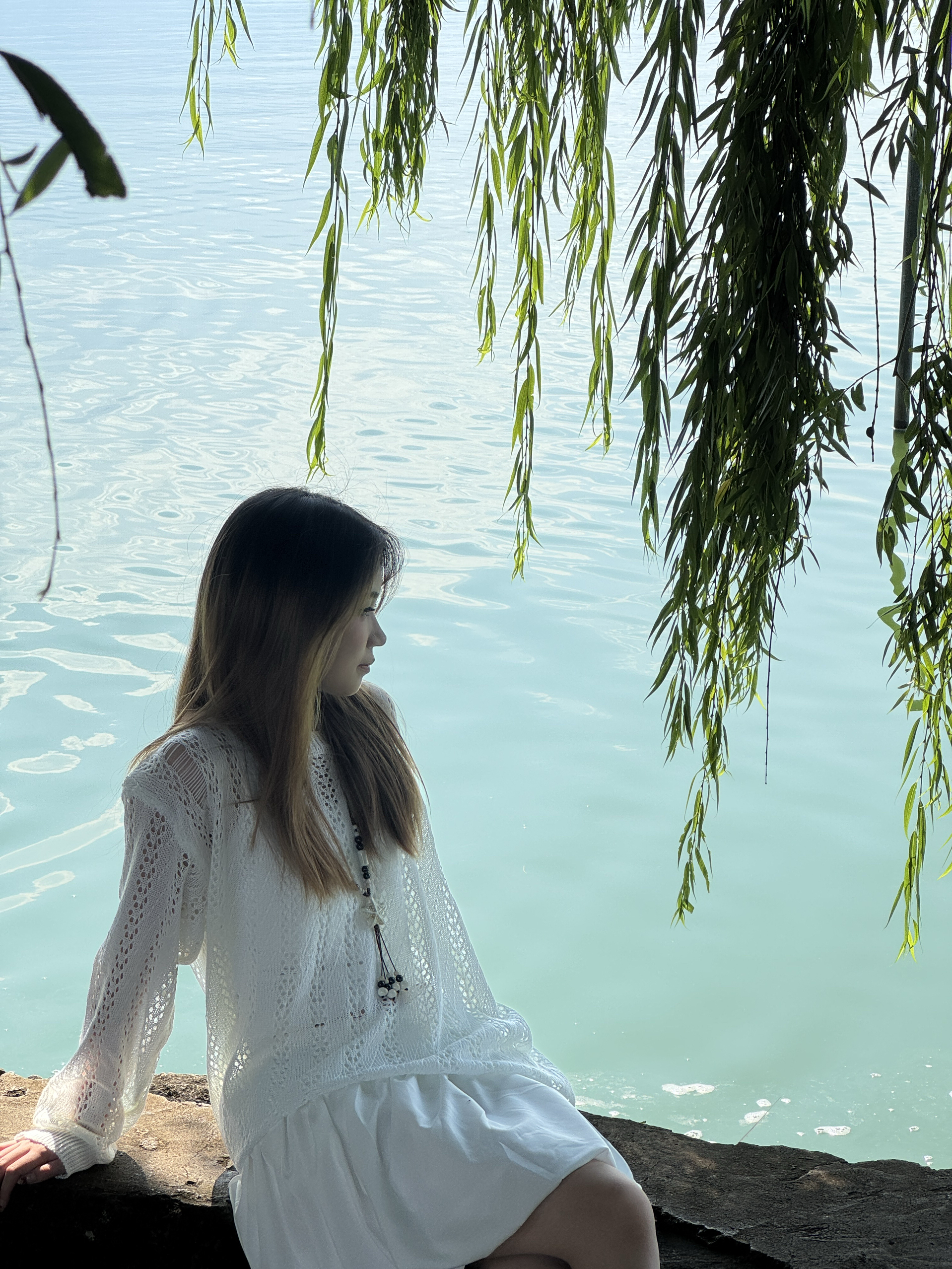 158小个子,这条裙摆刚好到膝盖上 拉高比例,镂空衫宽松不显壮 湖边拍照腿看着巨长