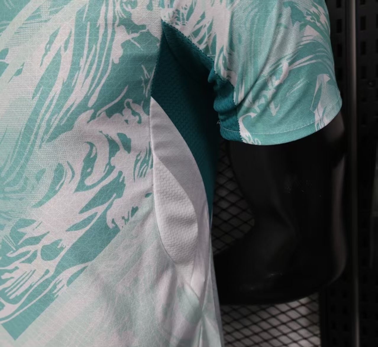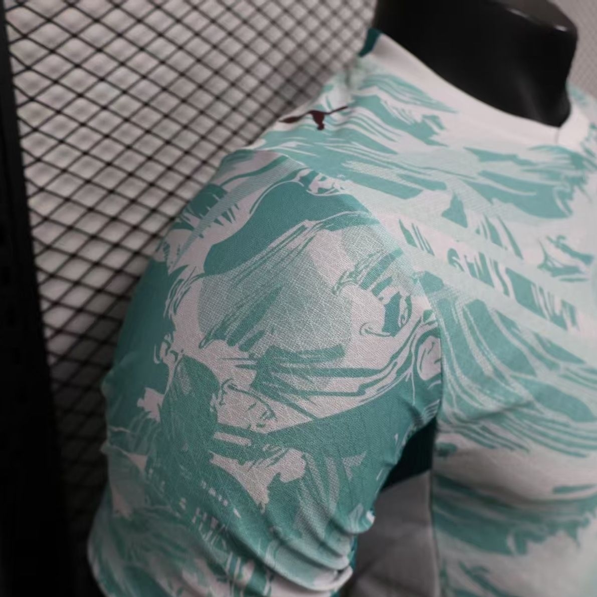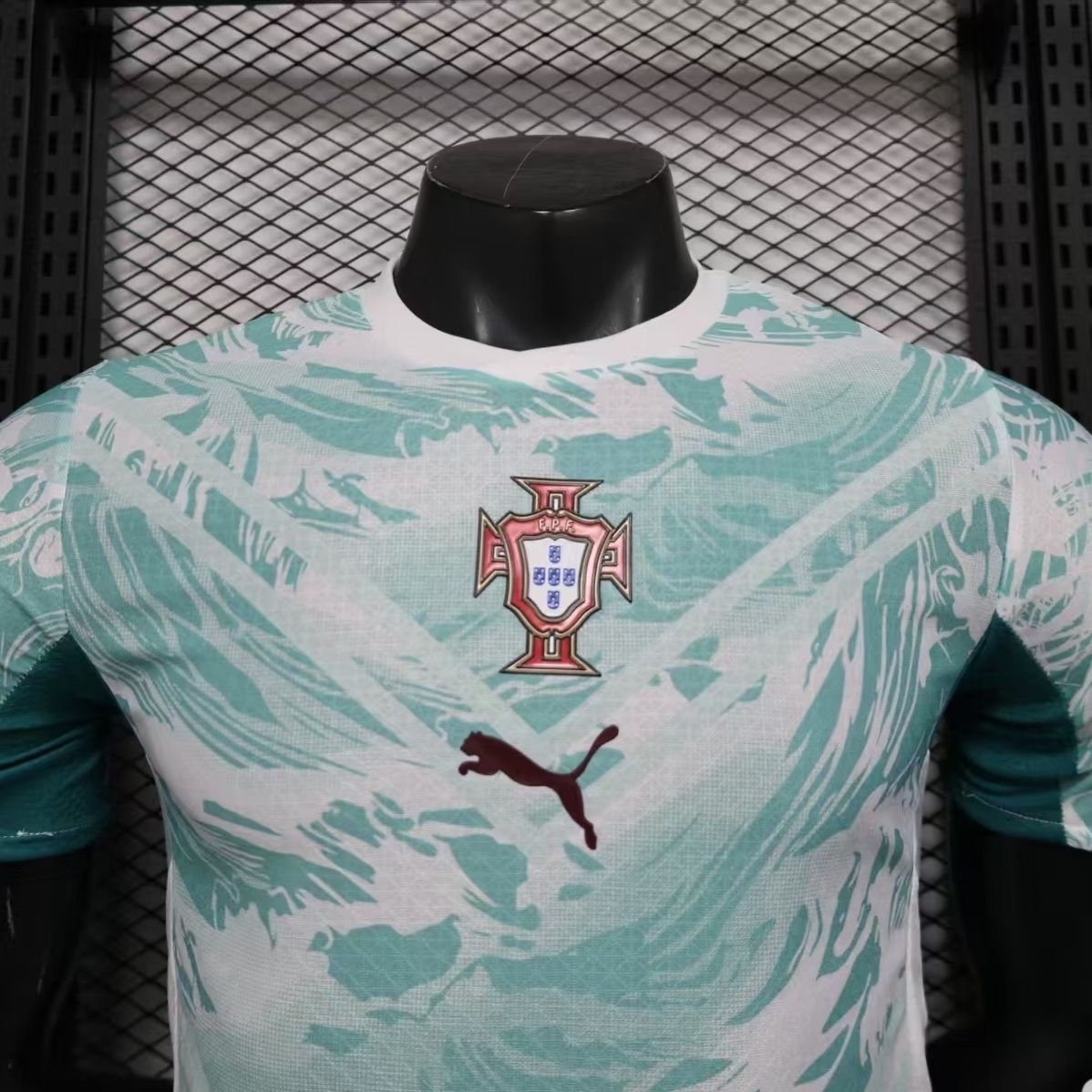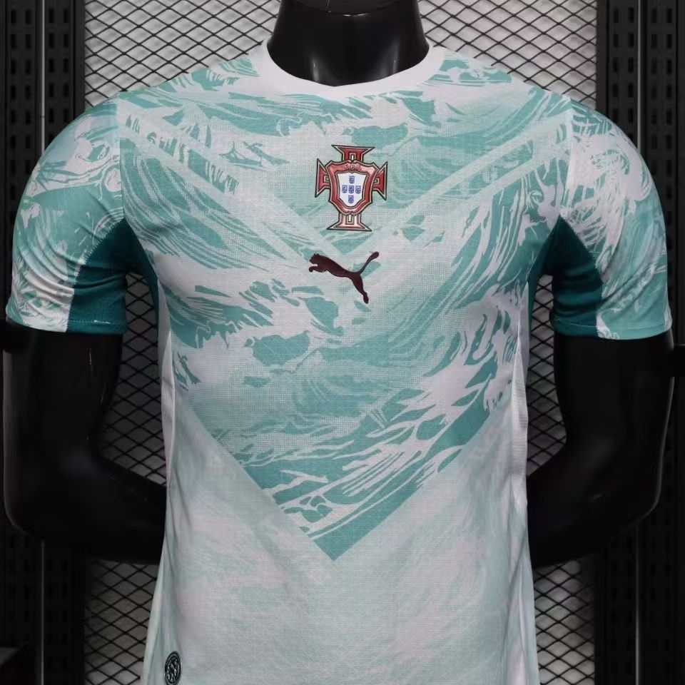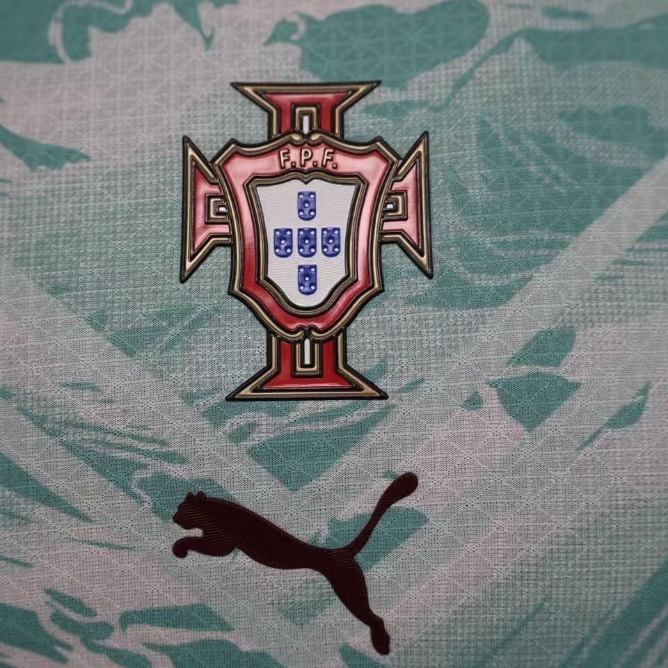 球衣以水蓝色为主色调,上半身饰有图案。胸部和腹部的V形剪裁巧妙地将不同深浅的浅绿色与白色融合在一起。领口为白色V形设计。葡萄牙国家队队徽位于胸前正中央,下方是深红色的PUMA标志。 #藏不住了我是球迷 #球员版球衣 #足球球衣 #足球服 #足球的魅力 #球衣 #唯有足球不可辜 #美加墨世界杯 #葡萄牙 #c罗