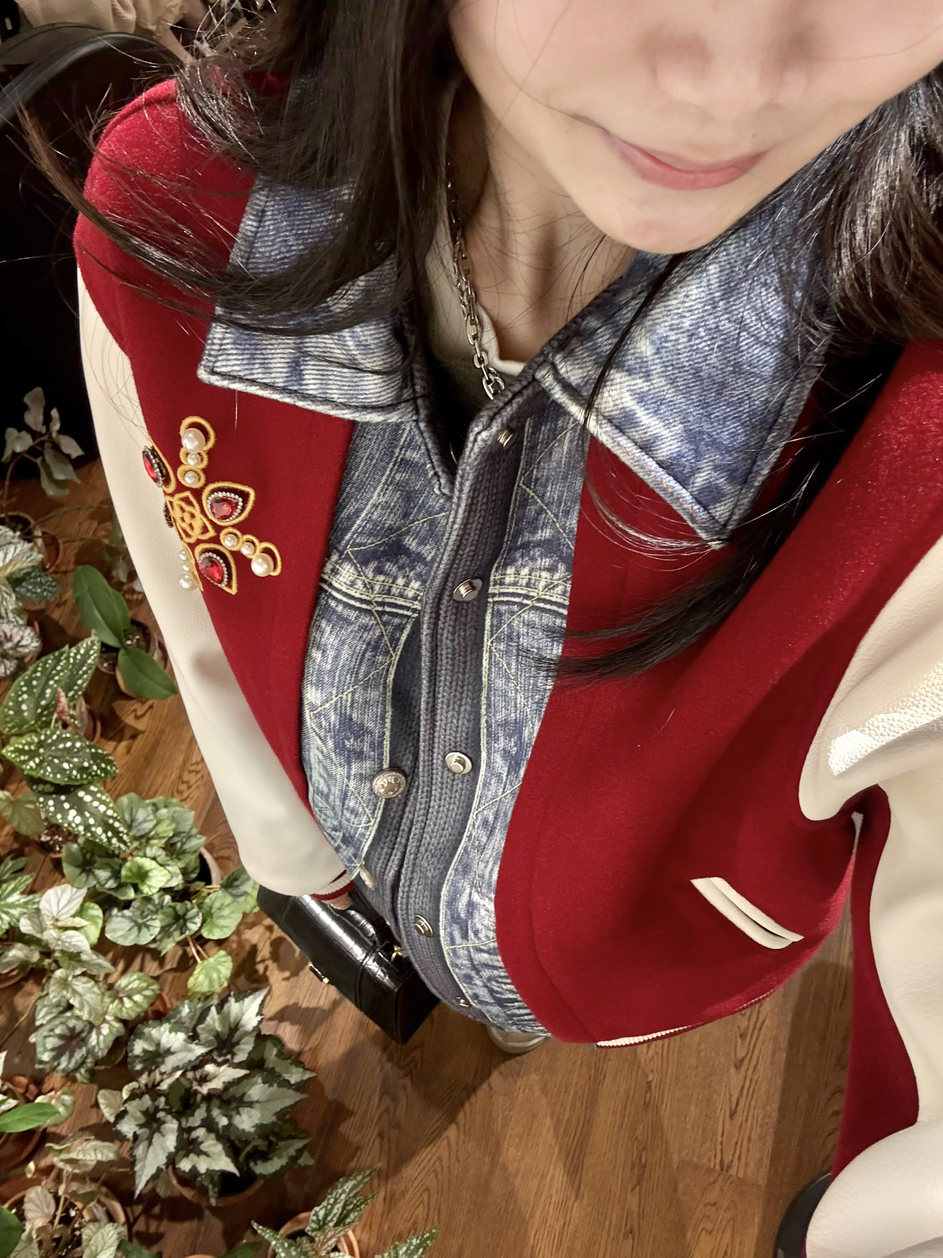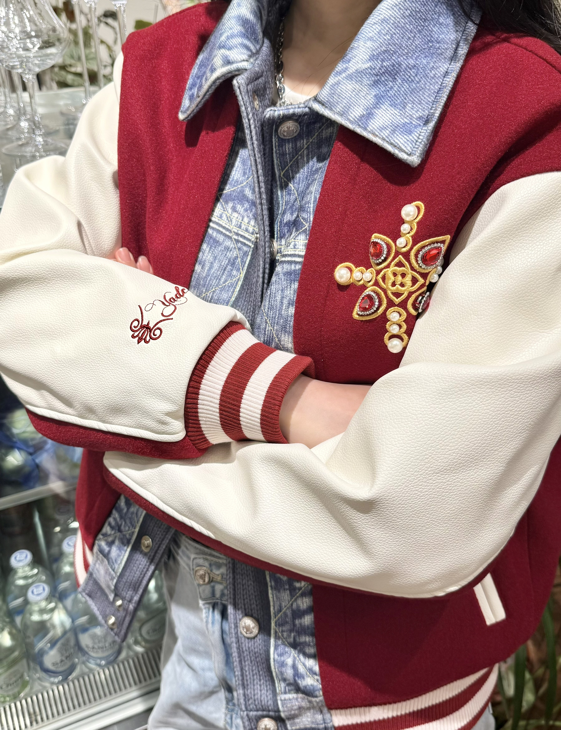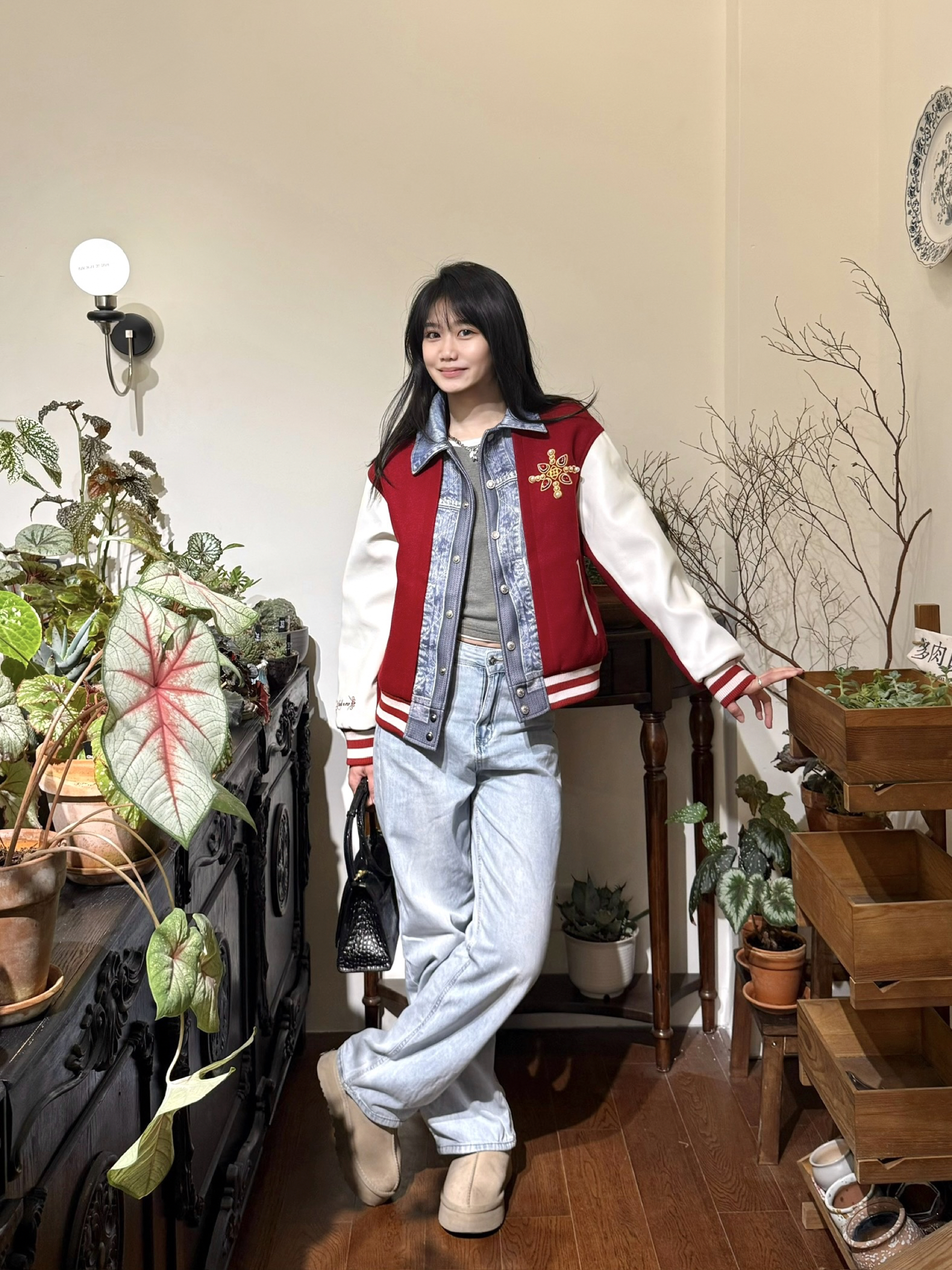 牛仔和棒球服元素 拼在一起 就很特别~ YADcrew 夹棉棒球服 这个天气穿刚刚好‼️ 红牛仔拼接配色 hin有层次感 钻饰珍珠细节也贼高级 下身做旧牛仔裤➕厚底鞋 美式街头感穿搭也是拿捏住咯!