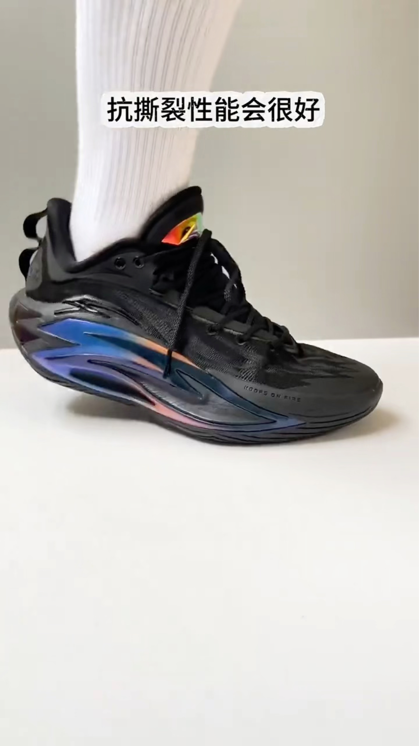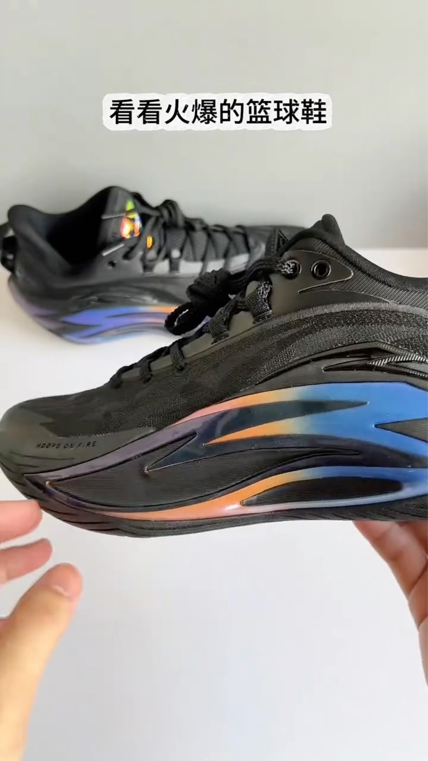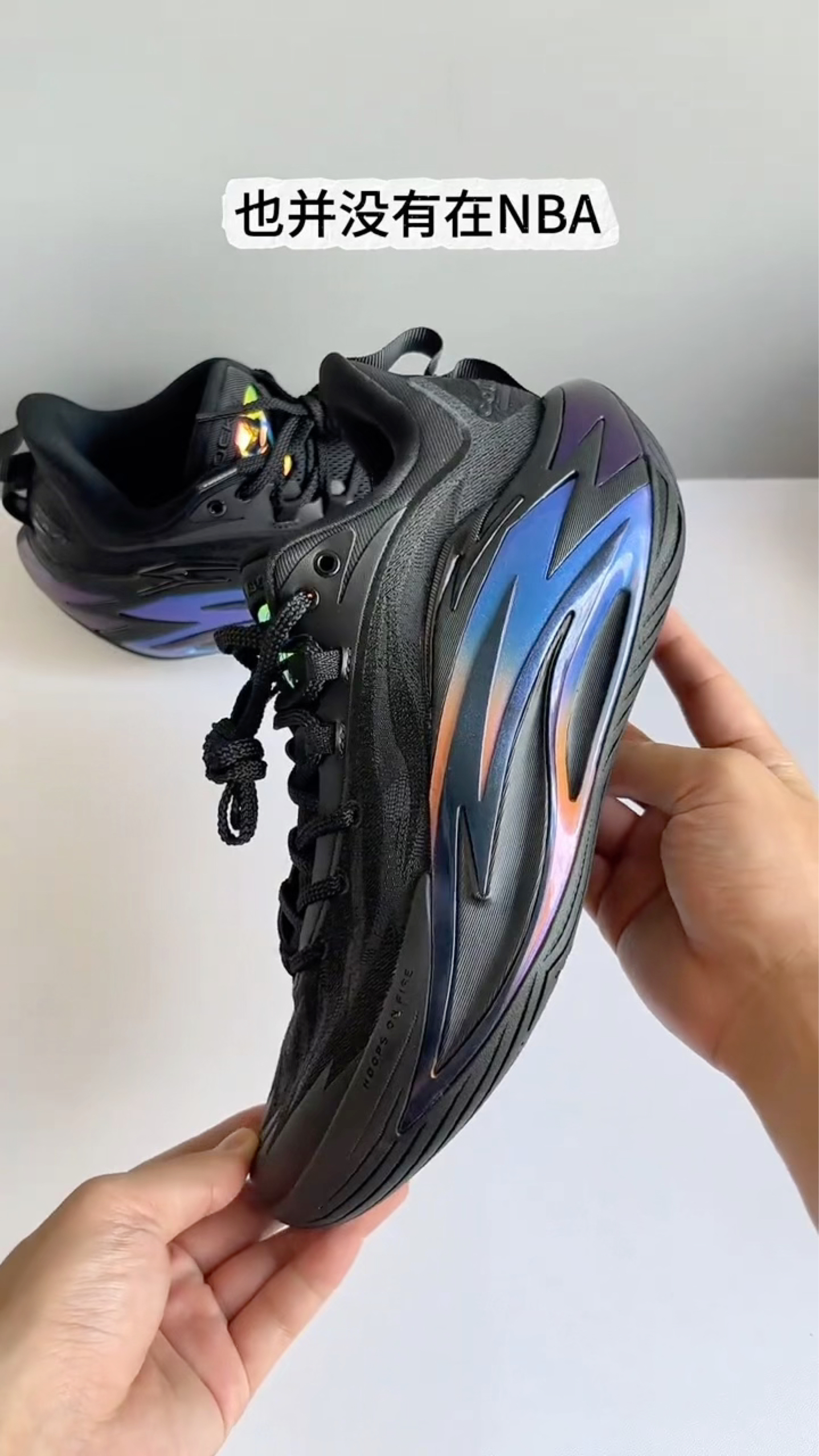 刚上脚这双鞋的第一感觉,就是被它的材质质感惊艳到了!鞋面摸起来是那种偏韧的触感,不是软塌塌的薄织物,难怪说抗撕裂性能好,实战党真的太吃这一点了,再也不怕变相时鞋面被扯得松垮垮。 鞋身的幻彩线条在光下会透出蓝紫渐变,低调又藏着小心机,黑武士的基底配上这种细节,颜值直接拉满。上脚的包裹感也很到位,鞋带系紧后脚被牢牢锁在鞋里,起步和急停时一点不拖沓,能感觉到鞋面的支撑性是实打实的。 作为打后卫的人,...