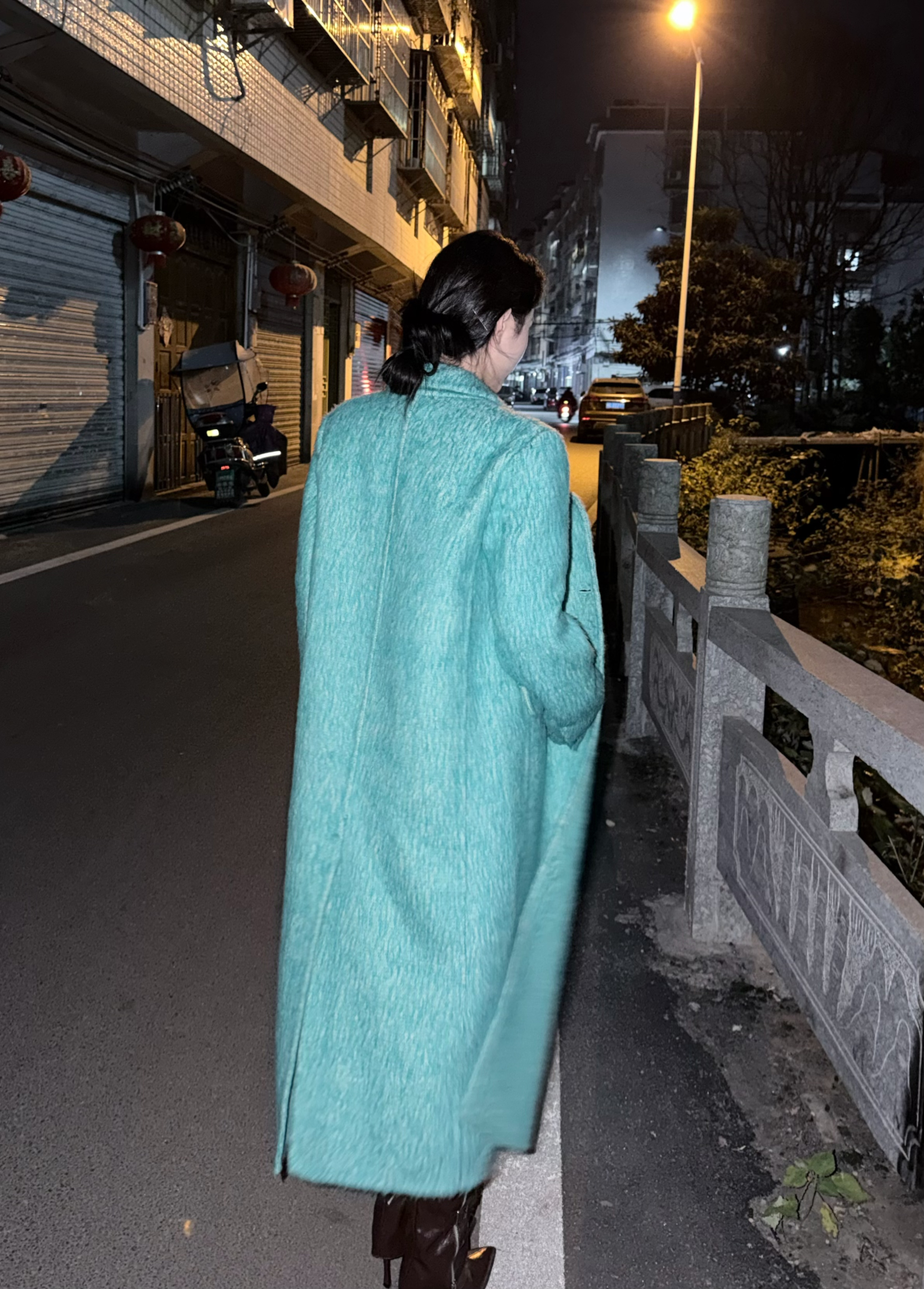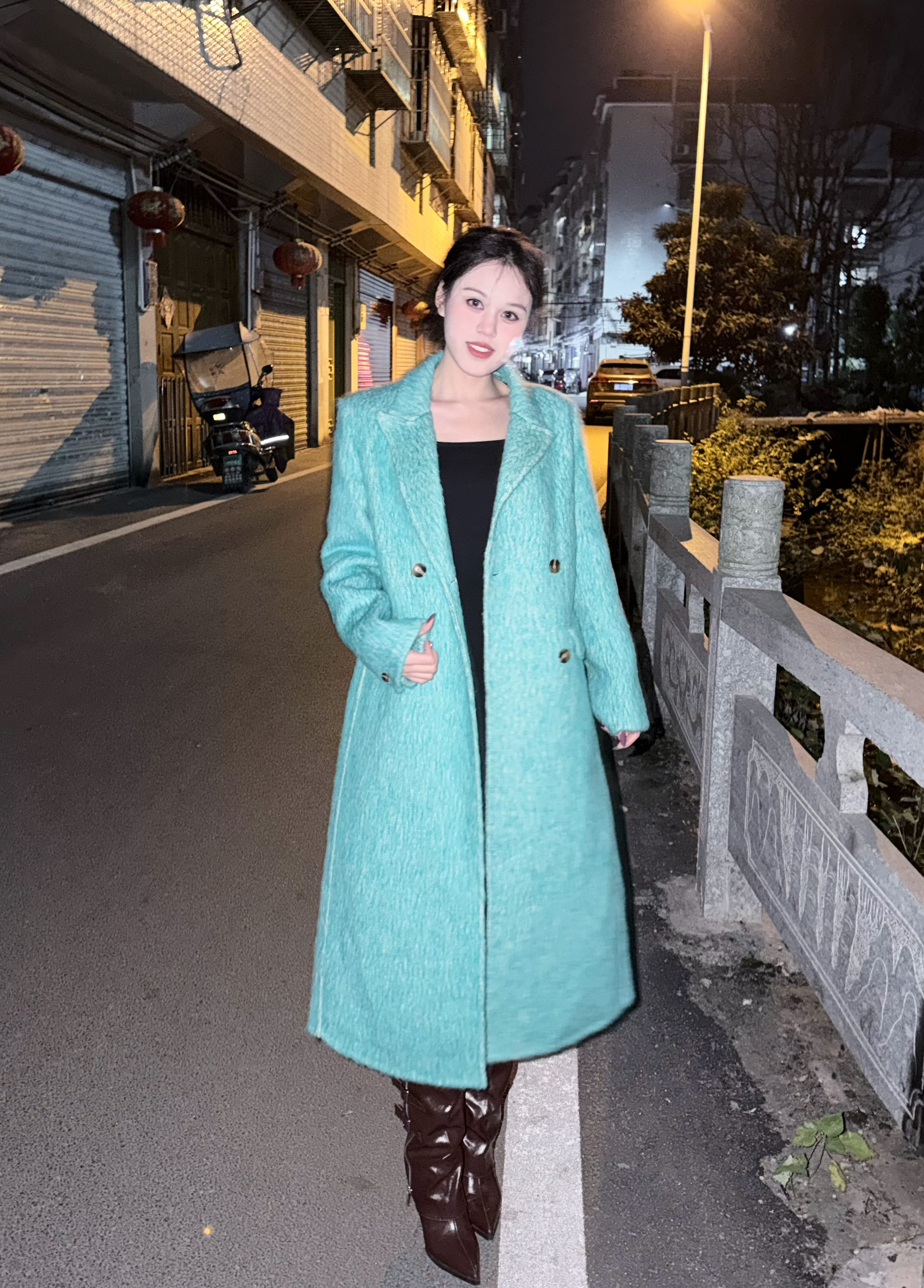 这件青色呢子大衣真的太好看啦 平时我是一个不爱穿呢子衣的人 因为驼色黑色都太普遍 穿上满大街都是没有辨识度 但这件青色的大衣 在人群里一眼就可以看见 非常的保暖 搭配靴子高跟气场十足