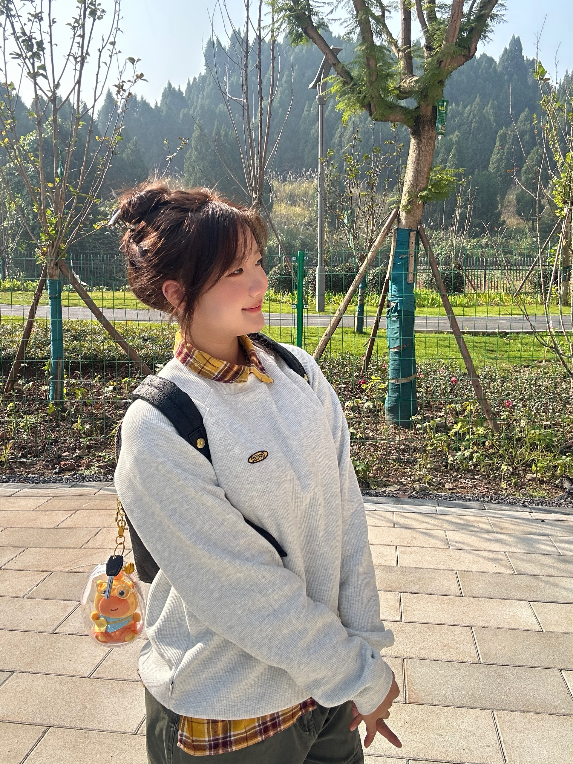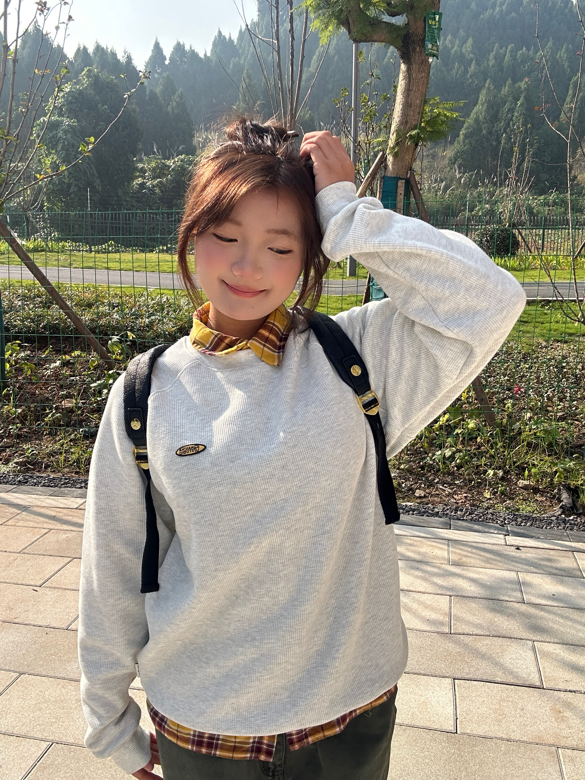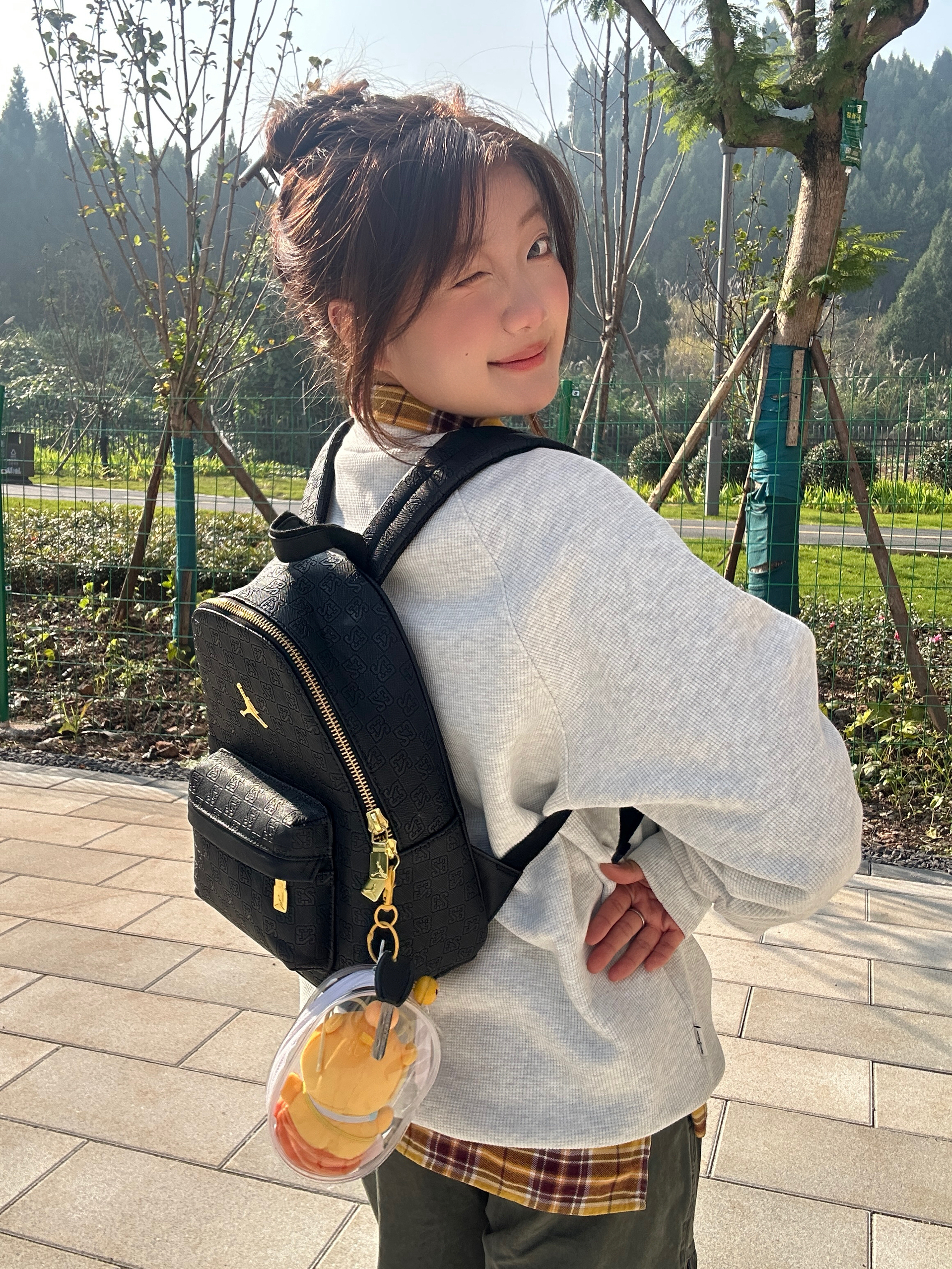 这一套好慵懒舒适 不用过多的修饰 简单的卫衣就能穿出活力明媚的感觉 卫衣加绒加厚完全不怕冷 背包是皮质的 质感在线 拿在手不显廉价 小小的背包显得人精致灵动!金色的点缀使黑色不那么沉闷~