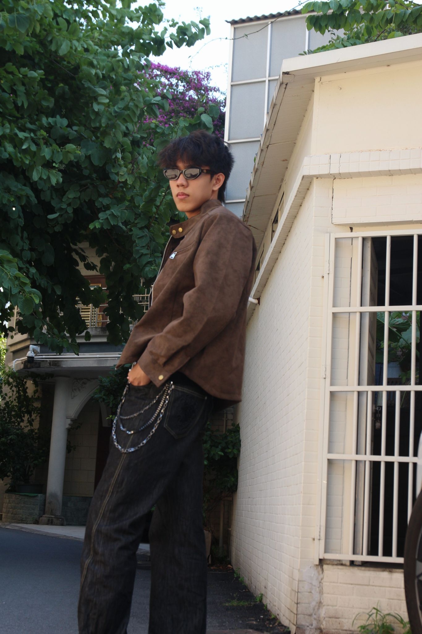 今天穿的这件棕色麂皮夹克搭配黑色内搭与深色牛仔,金属裤链和复古鞋增添细节🤏🤏 整体风格硬朗复古,是工装风与街头潮感的个性融合,酷感十足[机智_blue][机智_blue][机智_blue]