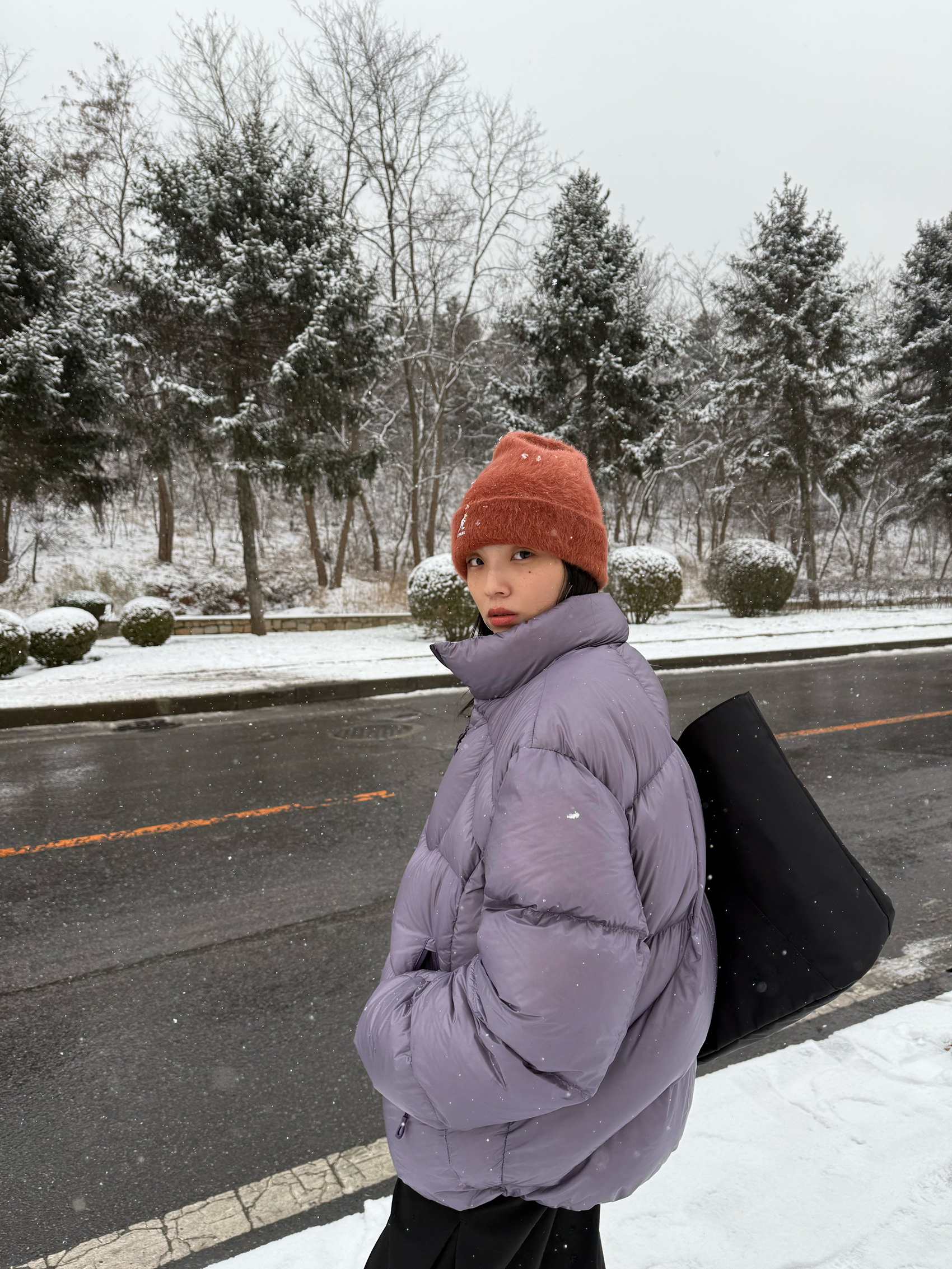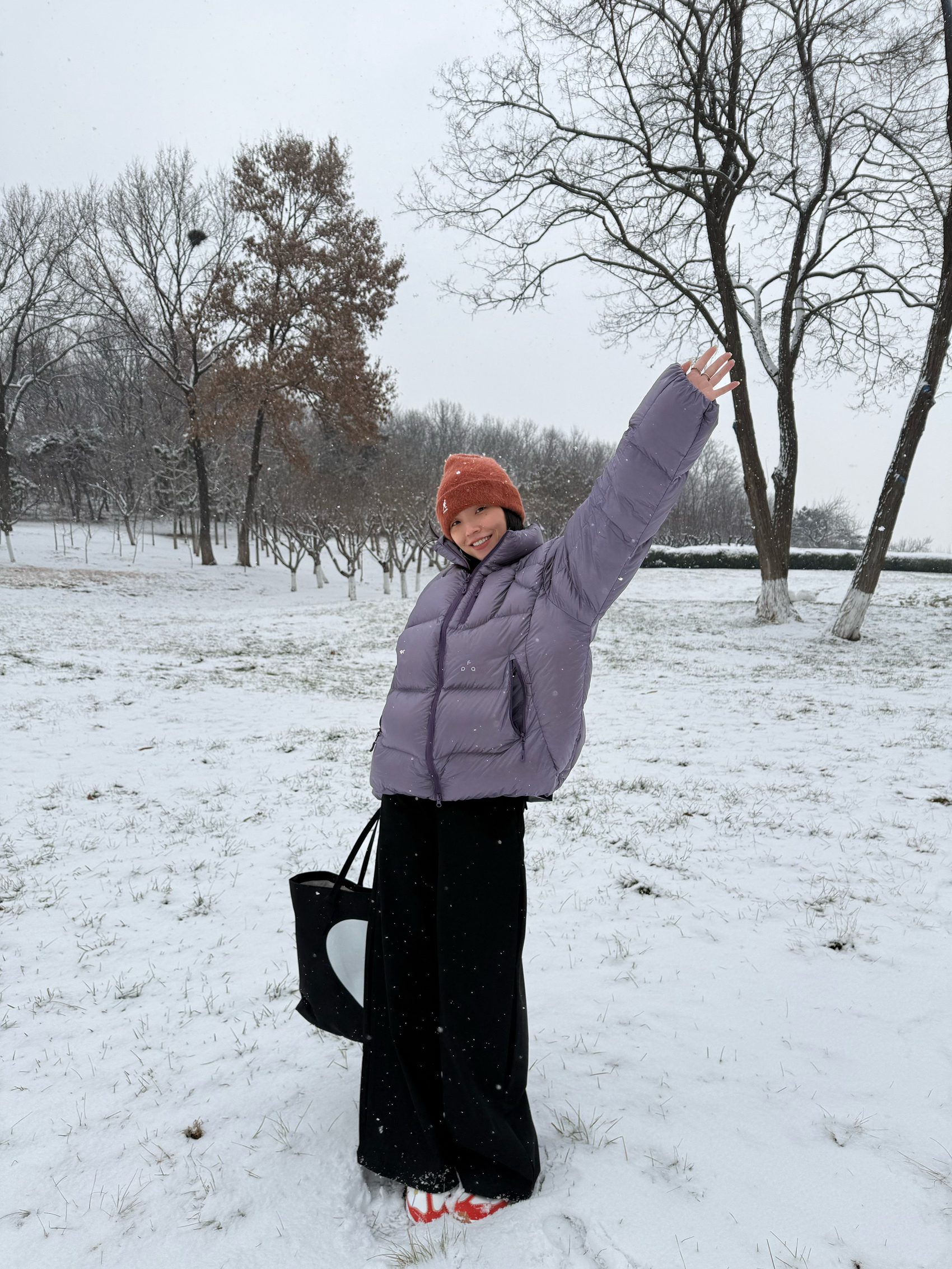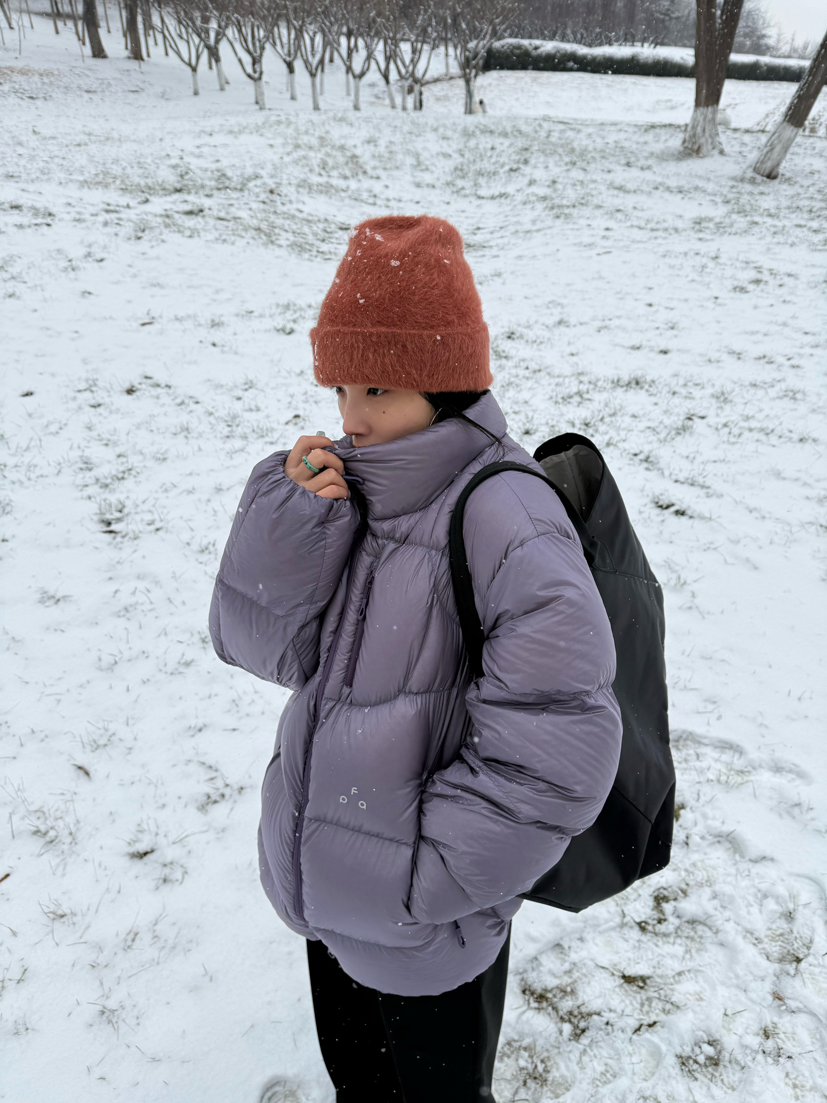 今天这身是FPA的浅紫短款羽绒服,轻得像披了床棉花🛏️ 配了条黑色垂感阔腿裤,裤脚堆在雪地靴上,自然散开不显臃肿 橘红针织帽把脸颊暖成红苹果,背上大黑包,塞得下保温杯和小零食,通勤或去公园看雪都够实用 你们雪天出门会选亮色配饰提亮吗?评论区聊聊怎么穿得既暖又不笨重吧~