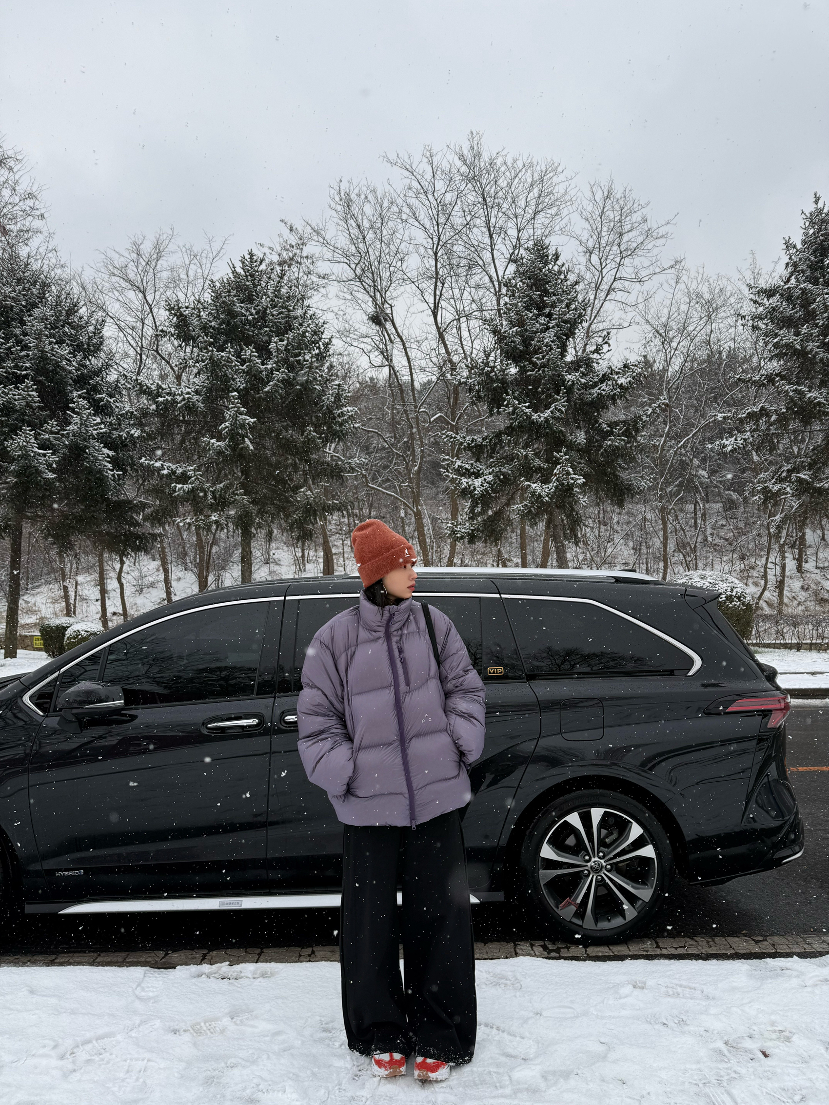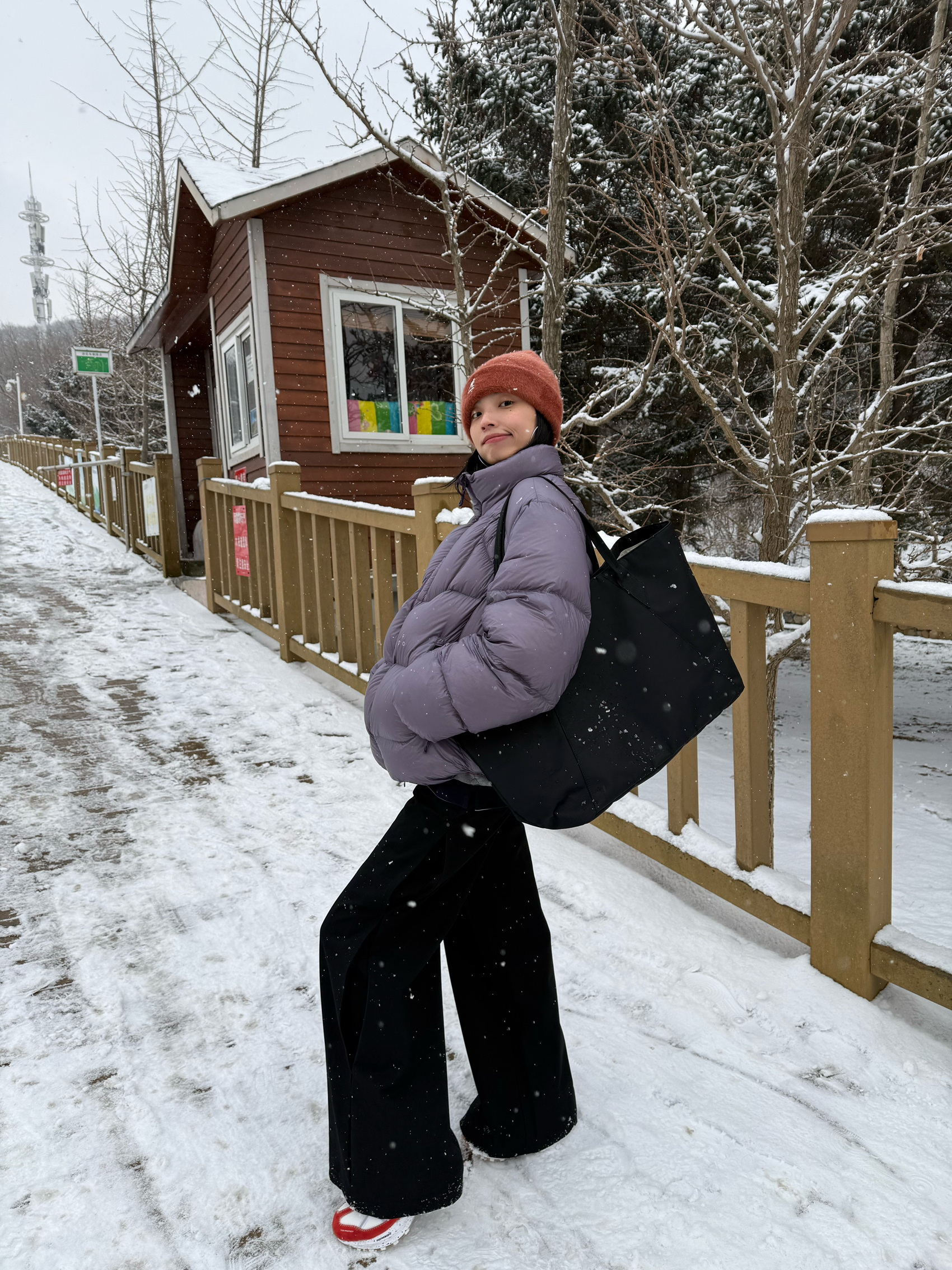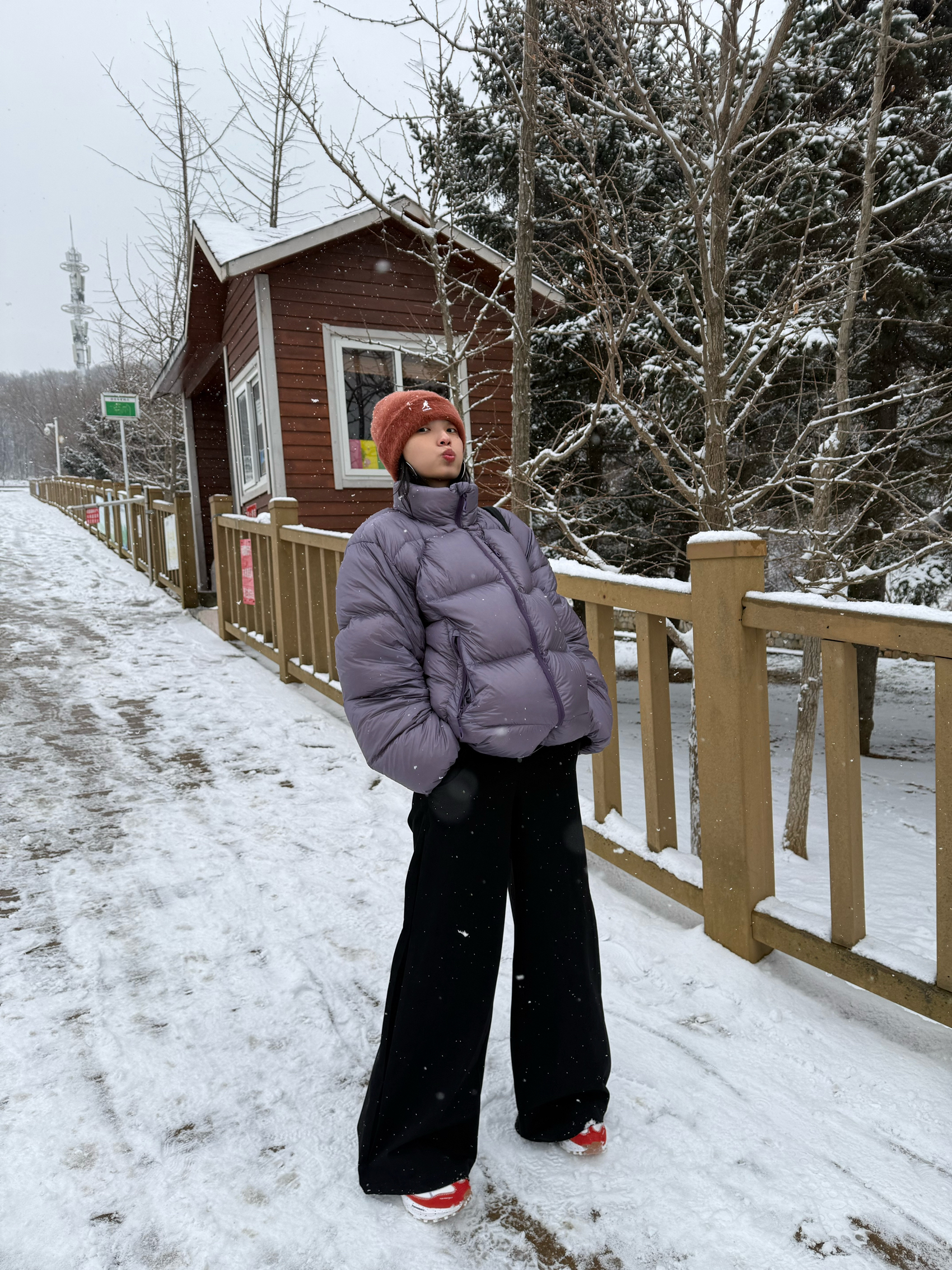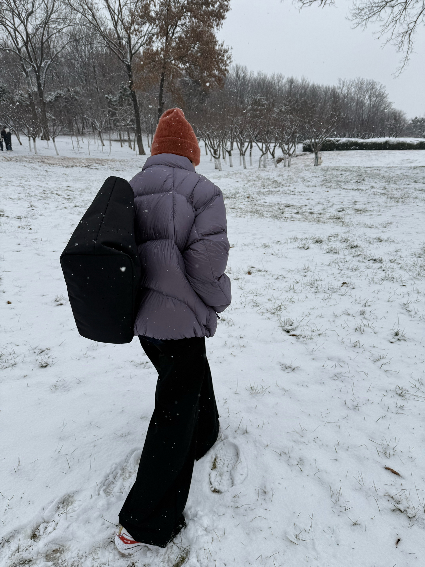 今天这身是FPA的浅紫短款羽绒服,轻得像披了床棉花🛏️ 配了条黑色垂感阔腿裤,裤脚堆在雪地靴上,自然散开不显臃肿 橘红针织帽把脸颊暖成红苹果,背上大黑包,塞得下保温杯和小零食,通勤或去公园看雪都够实用 你们雪天出门会选亮色配饰提亮吗?评论区聊聊怎么穿得既暖又不笨重吧~