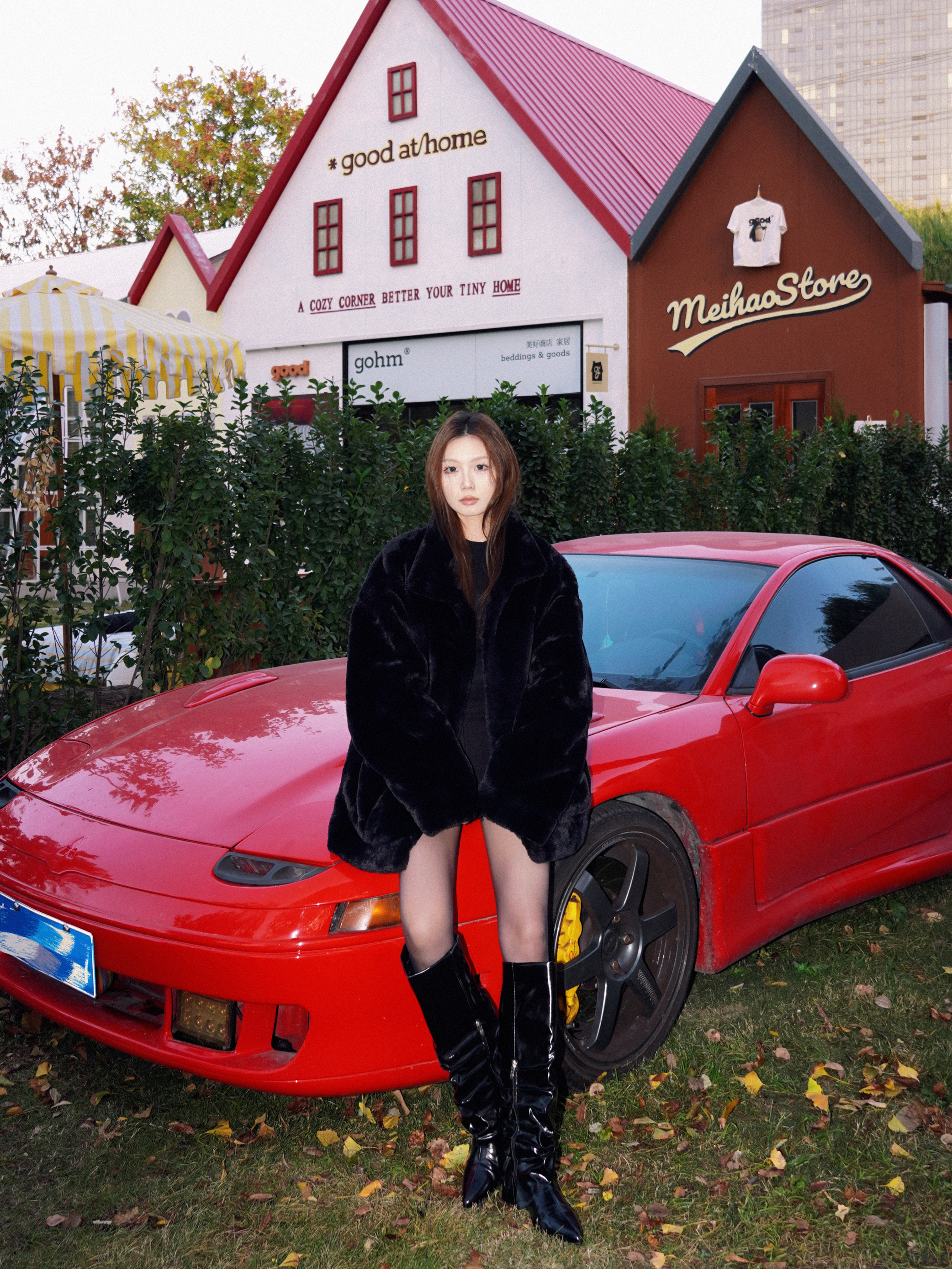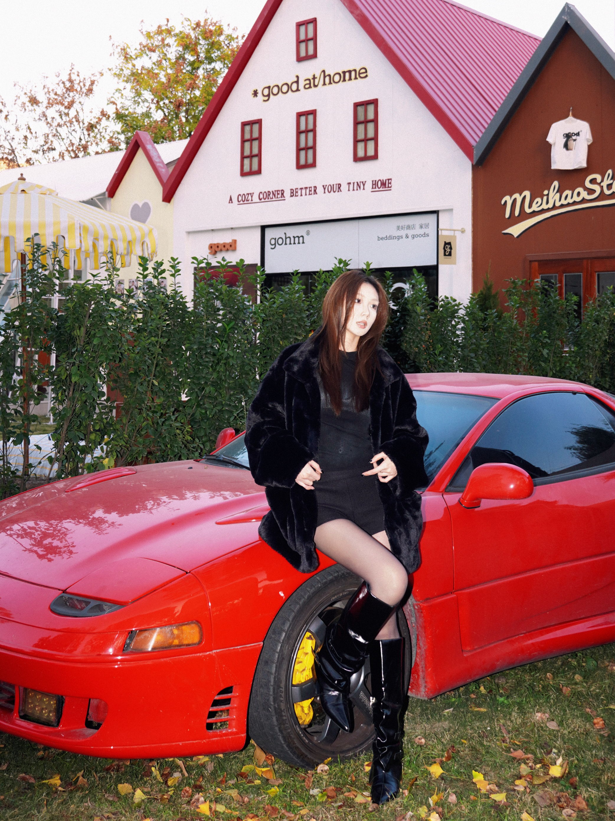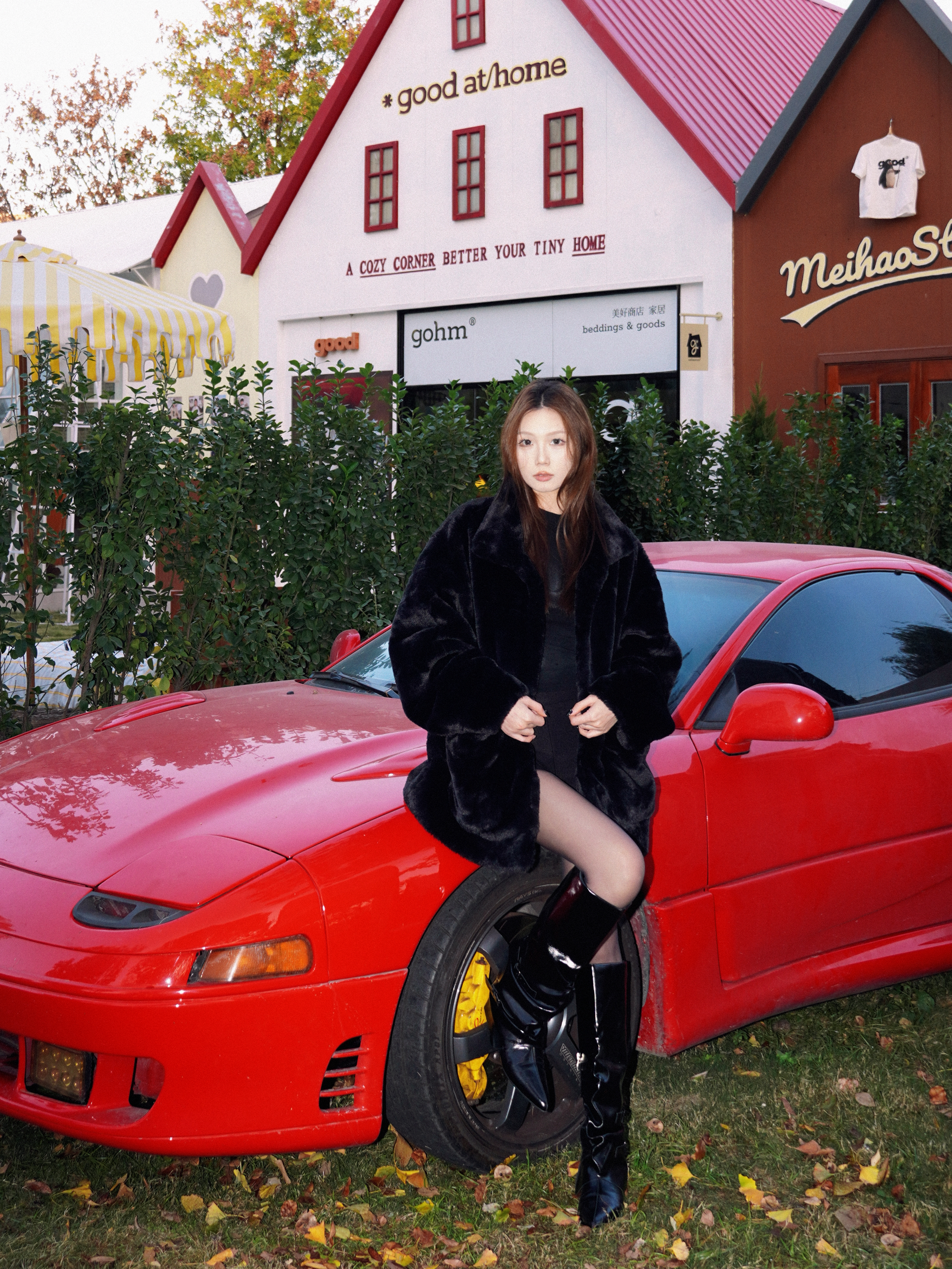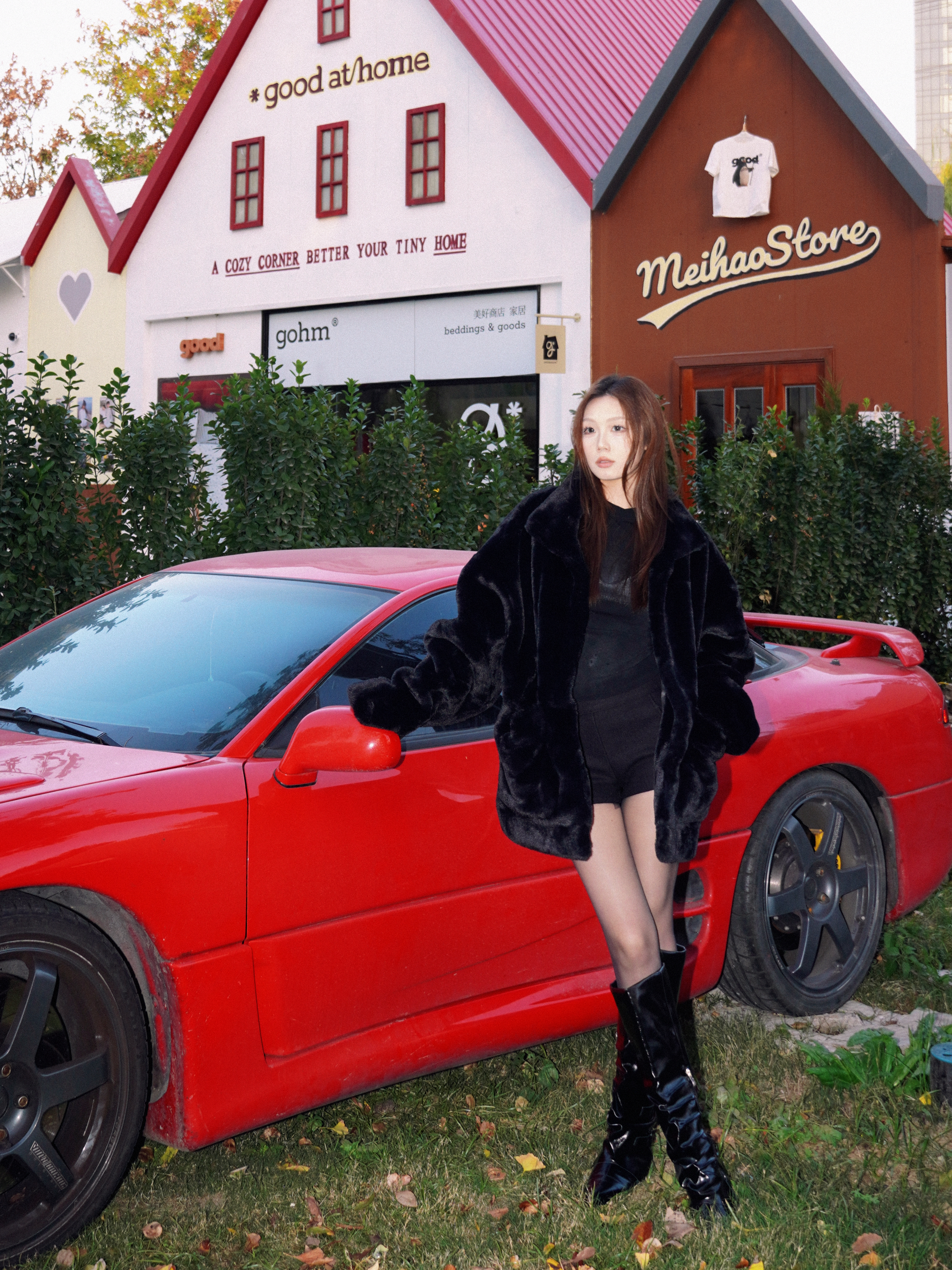 直接变身街头小丑女反派 戏剧感拉满💥 黑色皮草本身就已经够拽了💅 背后的小丑喷墨印花霸气十足 宽松的版型一点也不显臃肿 内搭选了暗黑长袖T 模糊图案更有特色 黑色毛呢短裤搭配黑色 略微有点小性感 再穿一双黑色长靴 千金感的气质一下子就有了 特意找了复古红跑车和美式复古场景🏛️ 瞬间穿越美式街头电影画面🎬