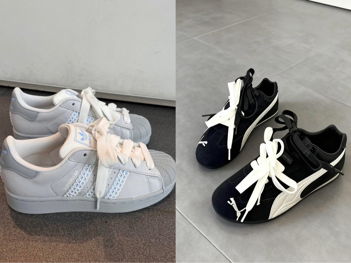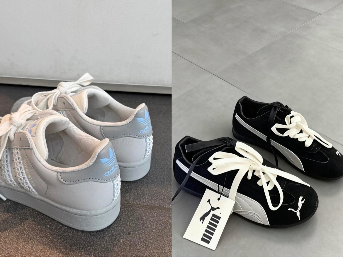 最近入的两双板鞋也太合心意了💓 阿迪这双浅灰配色真的温柔,鞋身的蓝纹细节超戳我,皮质软乎乎的上脚很舒服,搭配休闲裤、裙子都很可~ 彪马的黑白款自带酷感,双鞋带设计超有特色,麂皮质感也在线,走甜酷风的姐妹可以冲! 小缺点就是阿迪新鞋鞋头略硬,彪马麂皮容易沾灰,但整体还是很值得入的~