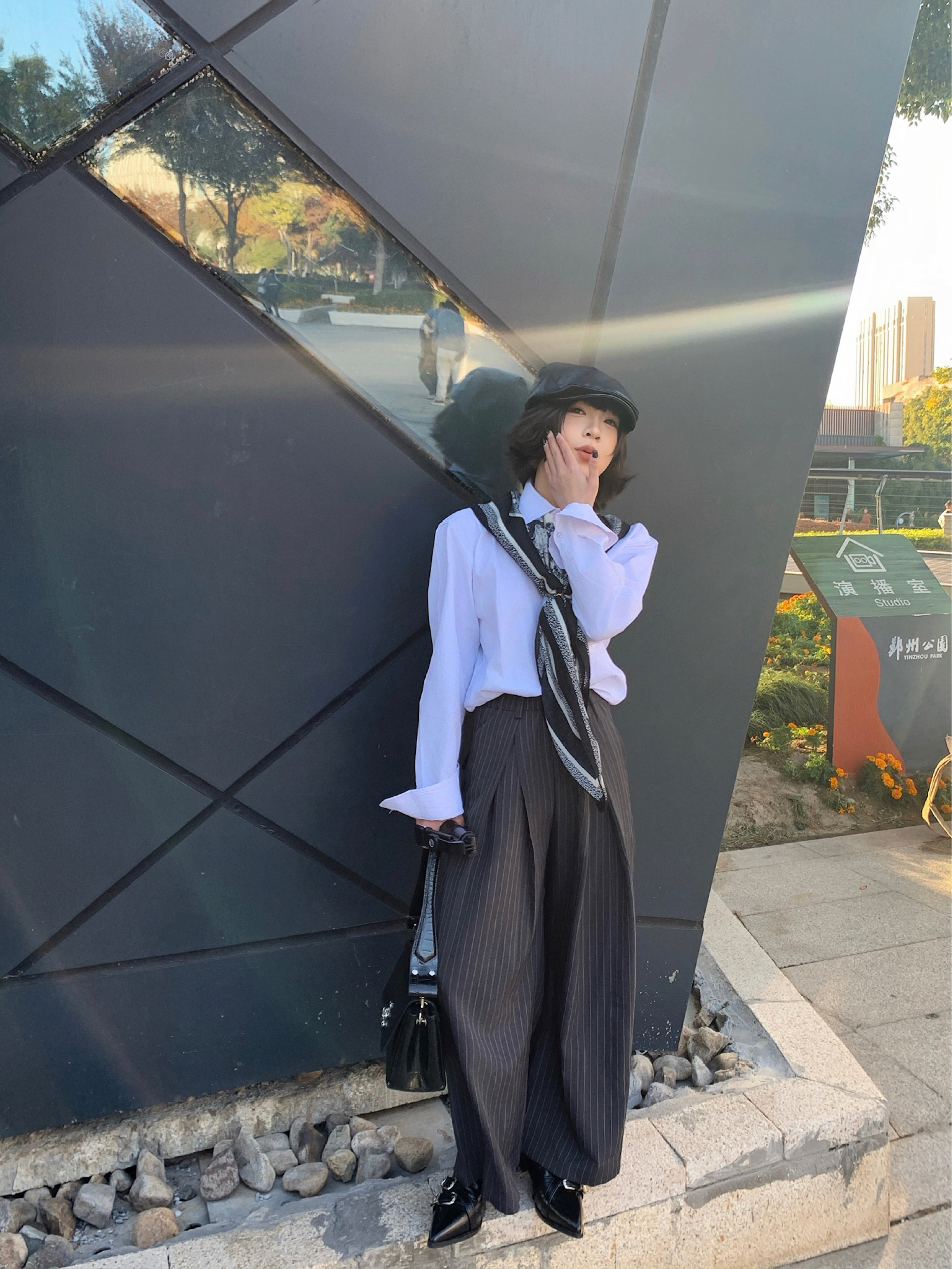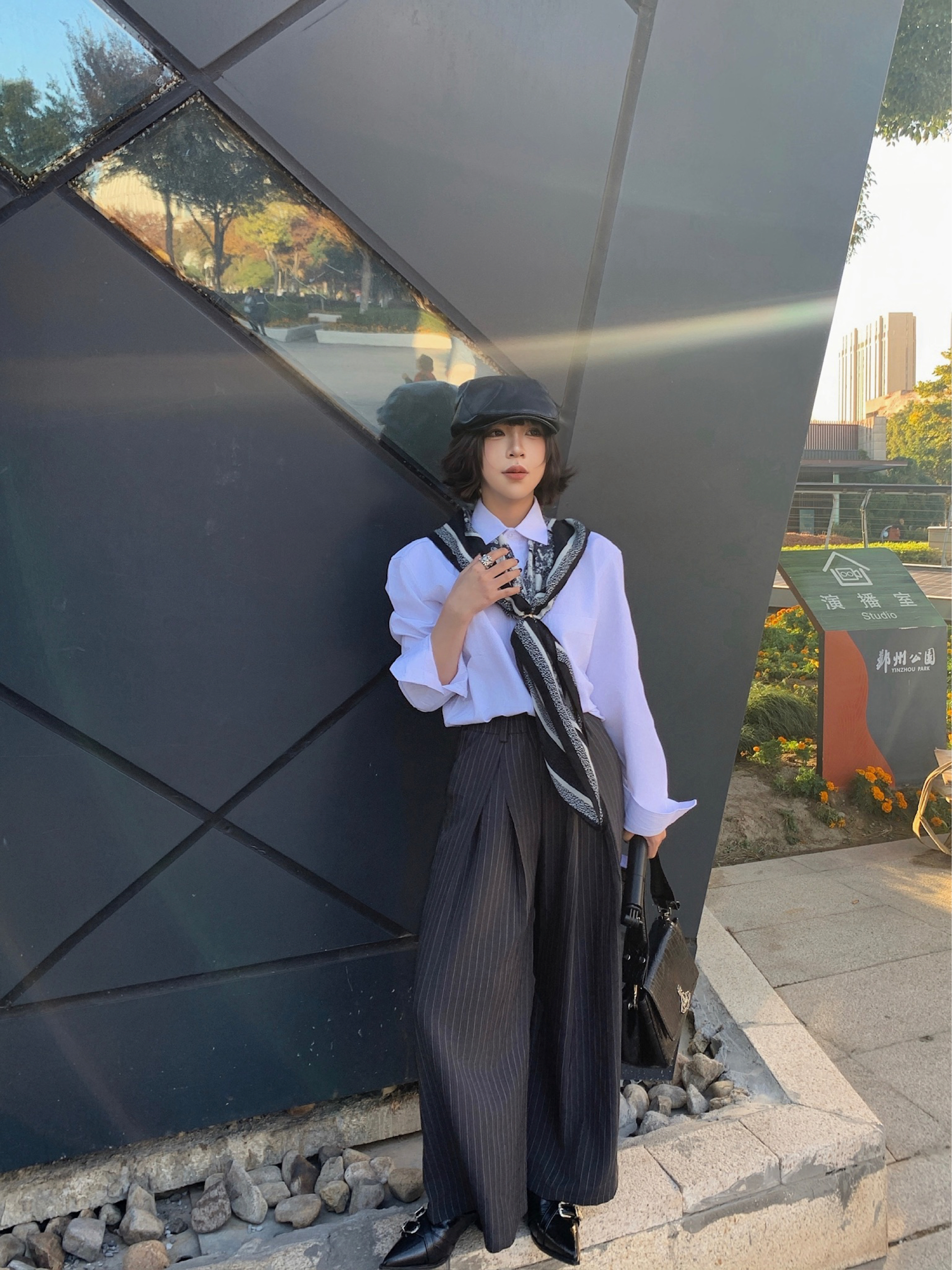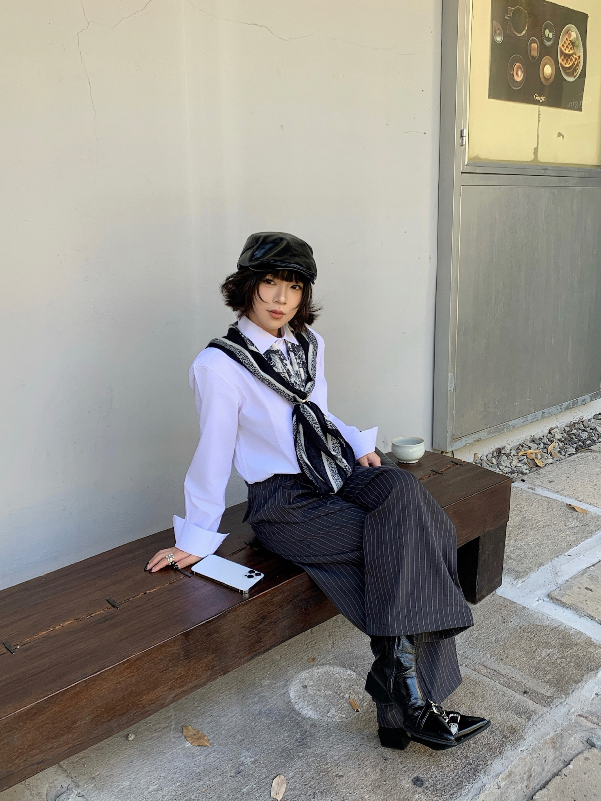 衬衫是老生常谈了,实穿性很强,显贵的办法就是衣服质感要好!! 搭配灰色条纹西裤,街边淘来的方巾做点缀,整体黑白灰三色,高级感手拿把掐! 皮质的靴子和皮质的前进帽相呼应,鞋子上的银色扣子和戒指💍相呼应,不要太会搭!