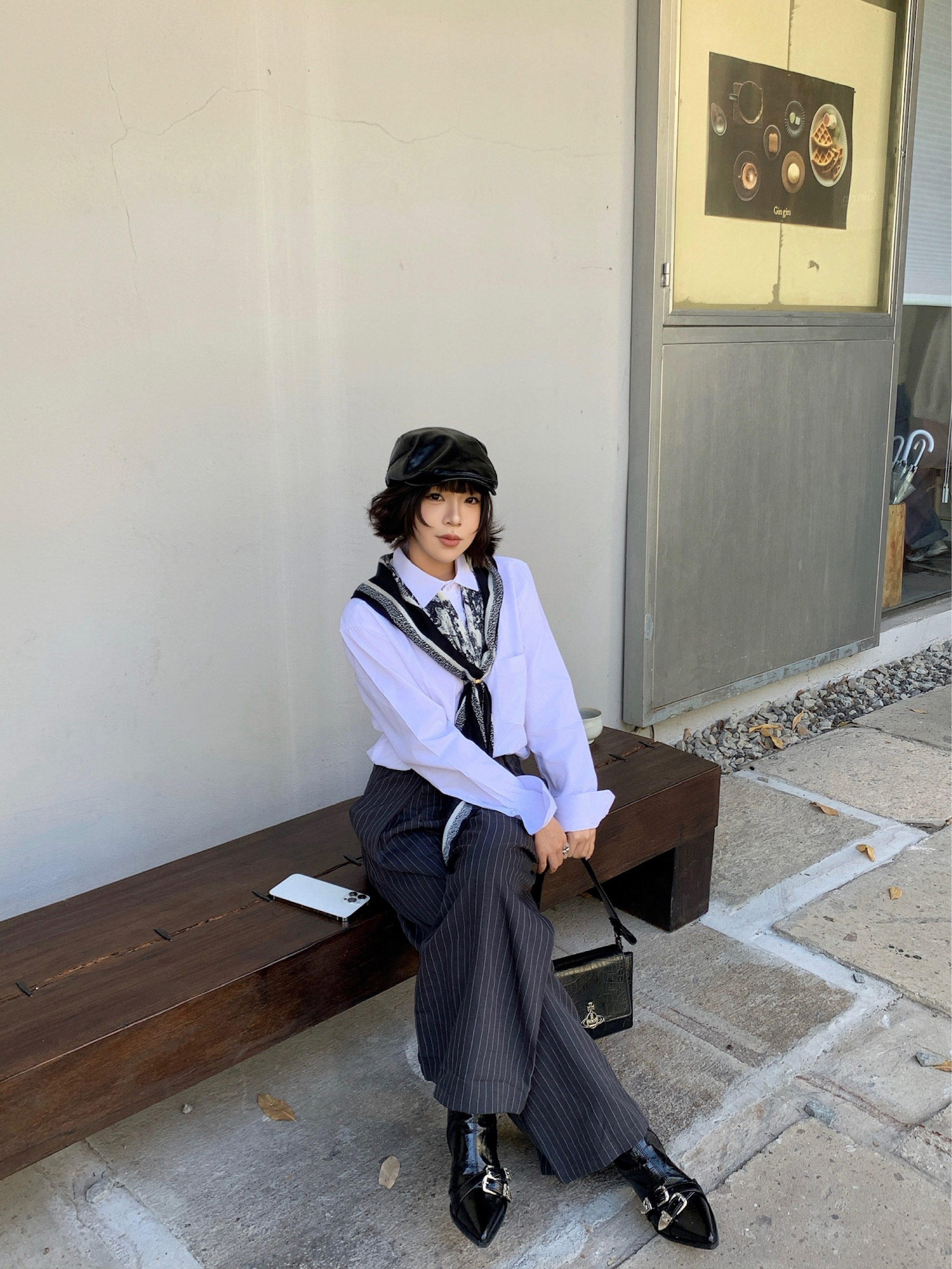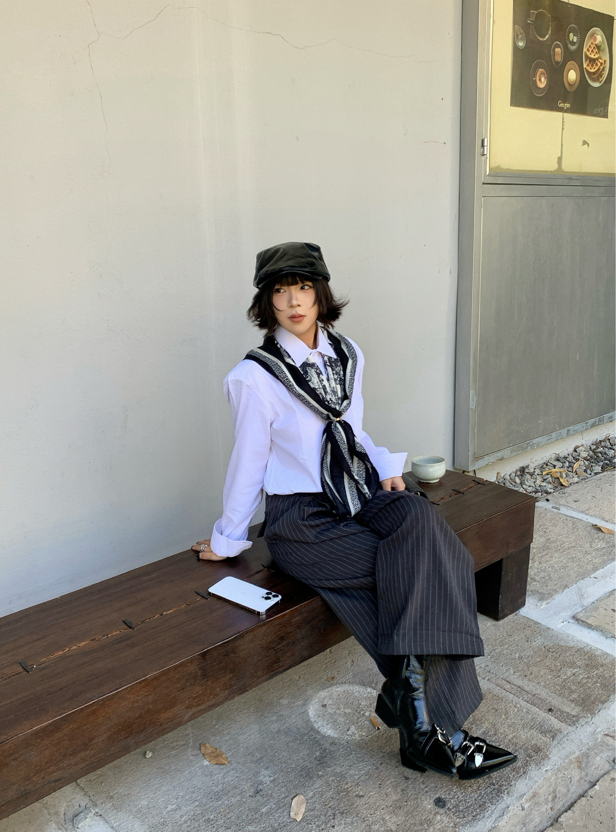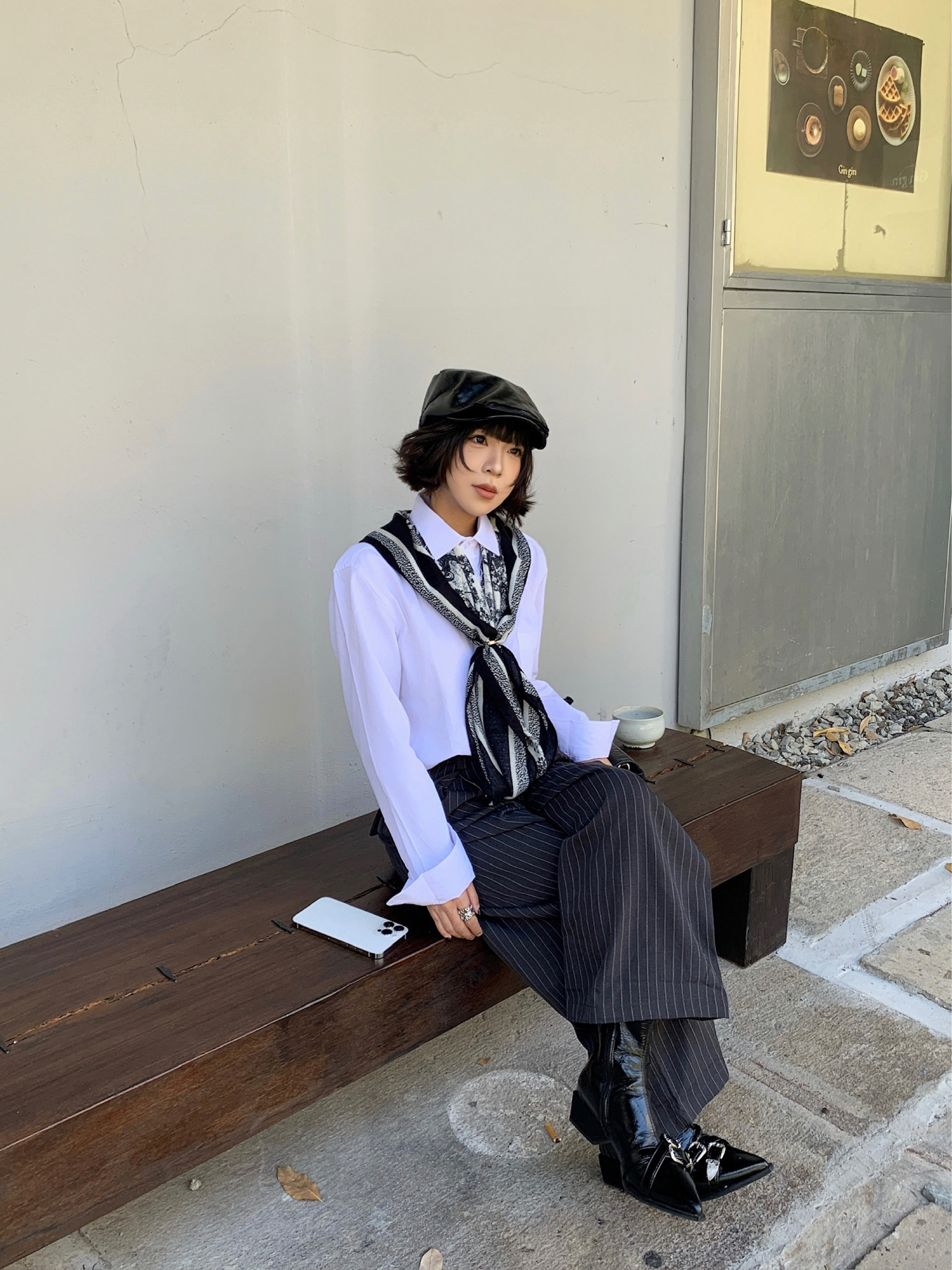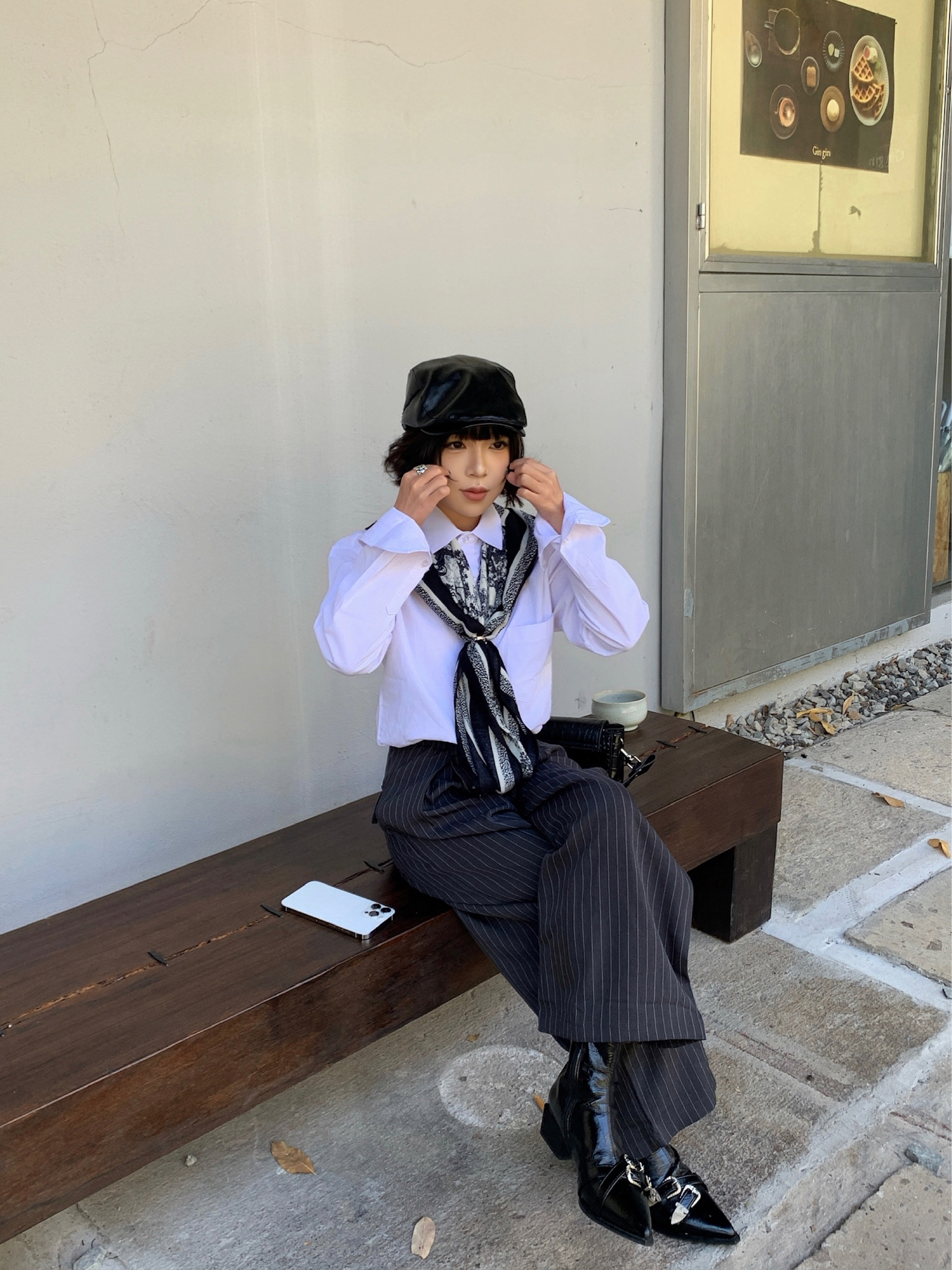 衬衫是老生常谈了,实穿性很强,显贵的办法就是衣服质感要好!! 搭配灰色条纹西裤,街边淘来的方巾做点缀,整体黑白灰三色,高级感手拿把掐! 皮质的靴子和皮质的前进帽相呼应,鞋子上的银色扣子和戒指💍相呼应,不要太会搭!