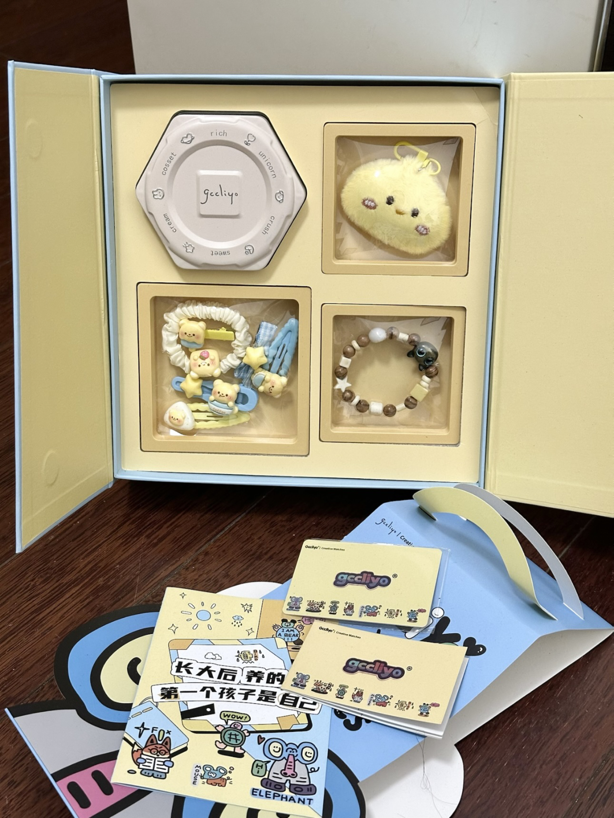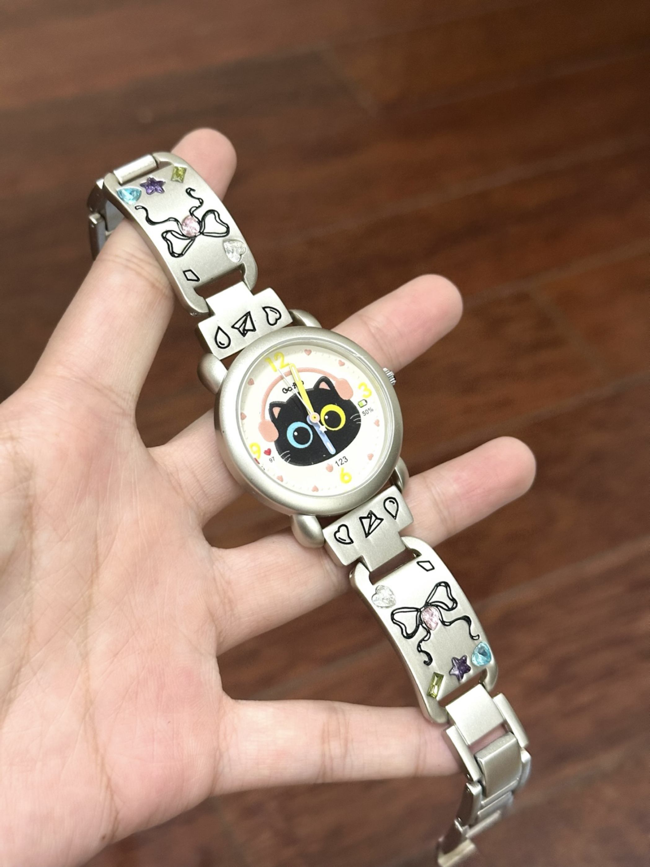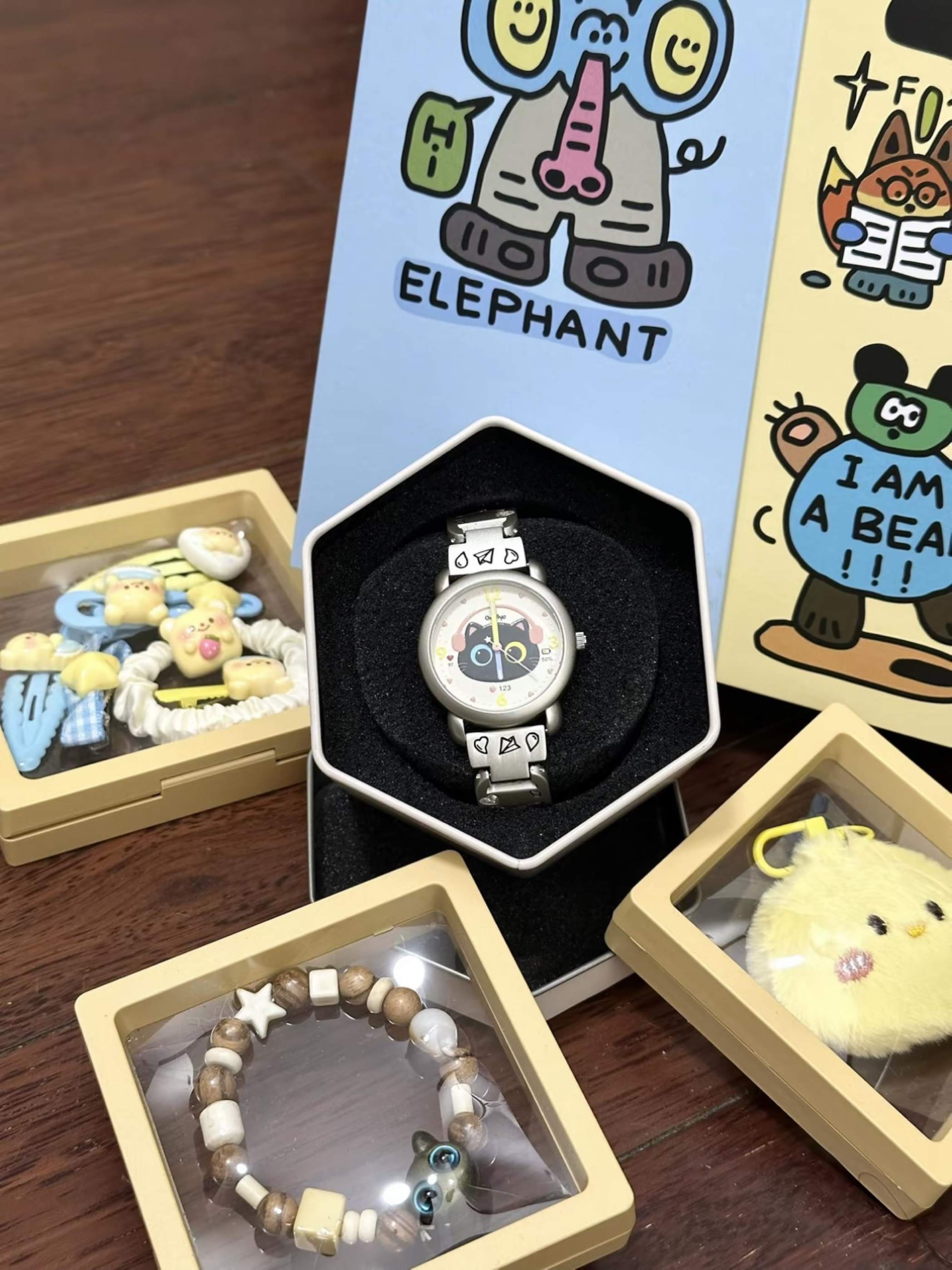 爱猫人士真的看不得任何有关小猫东西 不然钱包又成干干净净的了 表盘里是一只带着耳机的小黑猫 真的好萌好可爱 奶呼呼的配色,表带上面还还有蝴蝶结雕刻 上面还嵌着闪闪的钻石 我这一款是个礼盒装 里面还包含了一个配套的手链 黄油小熊的发卡和小鸡挂件 一整套都少女心满满 自己带或者是作为礼物都很有仪式感
