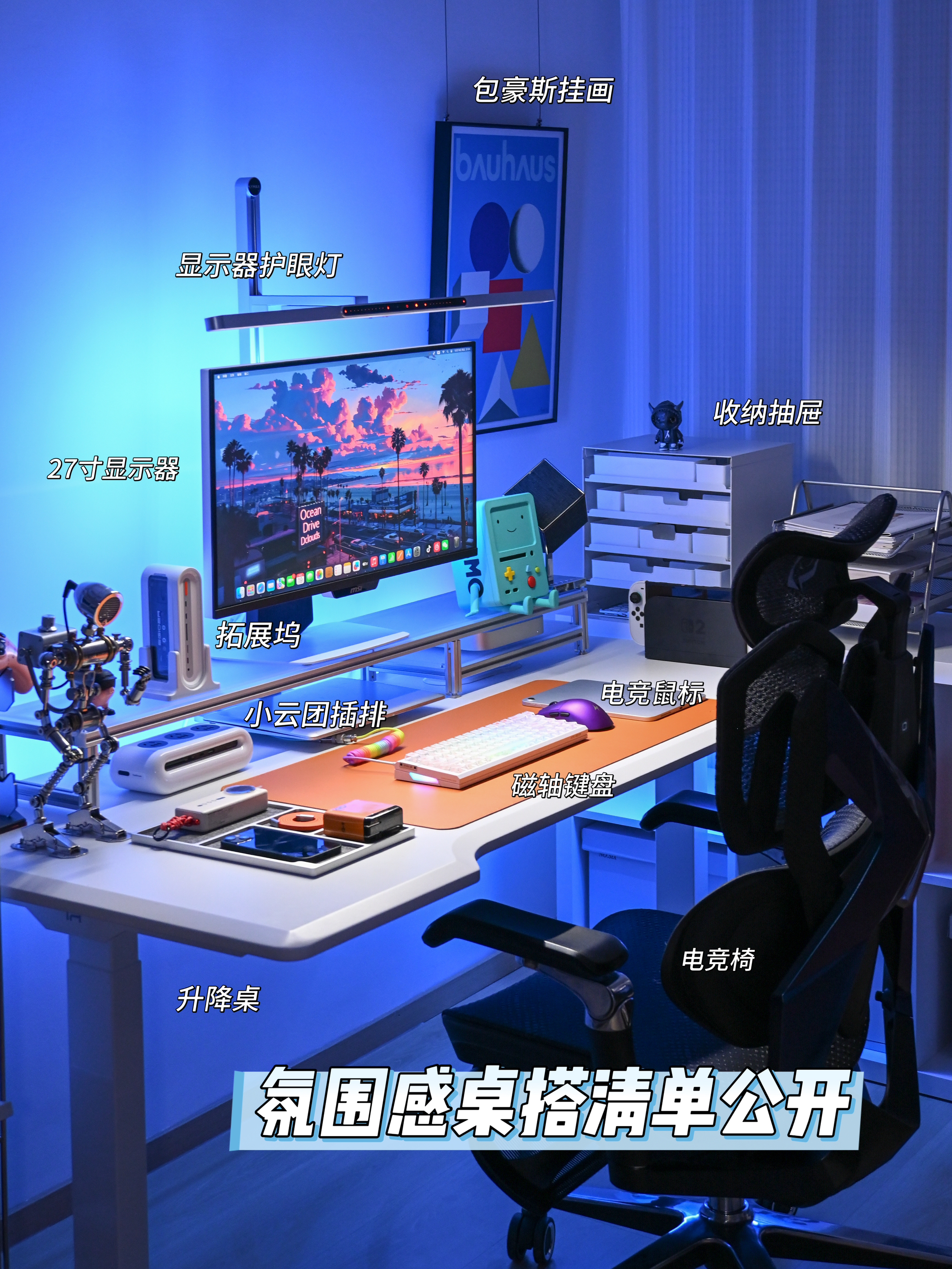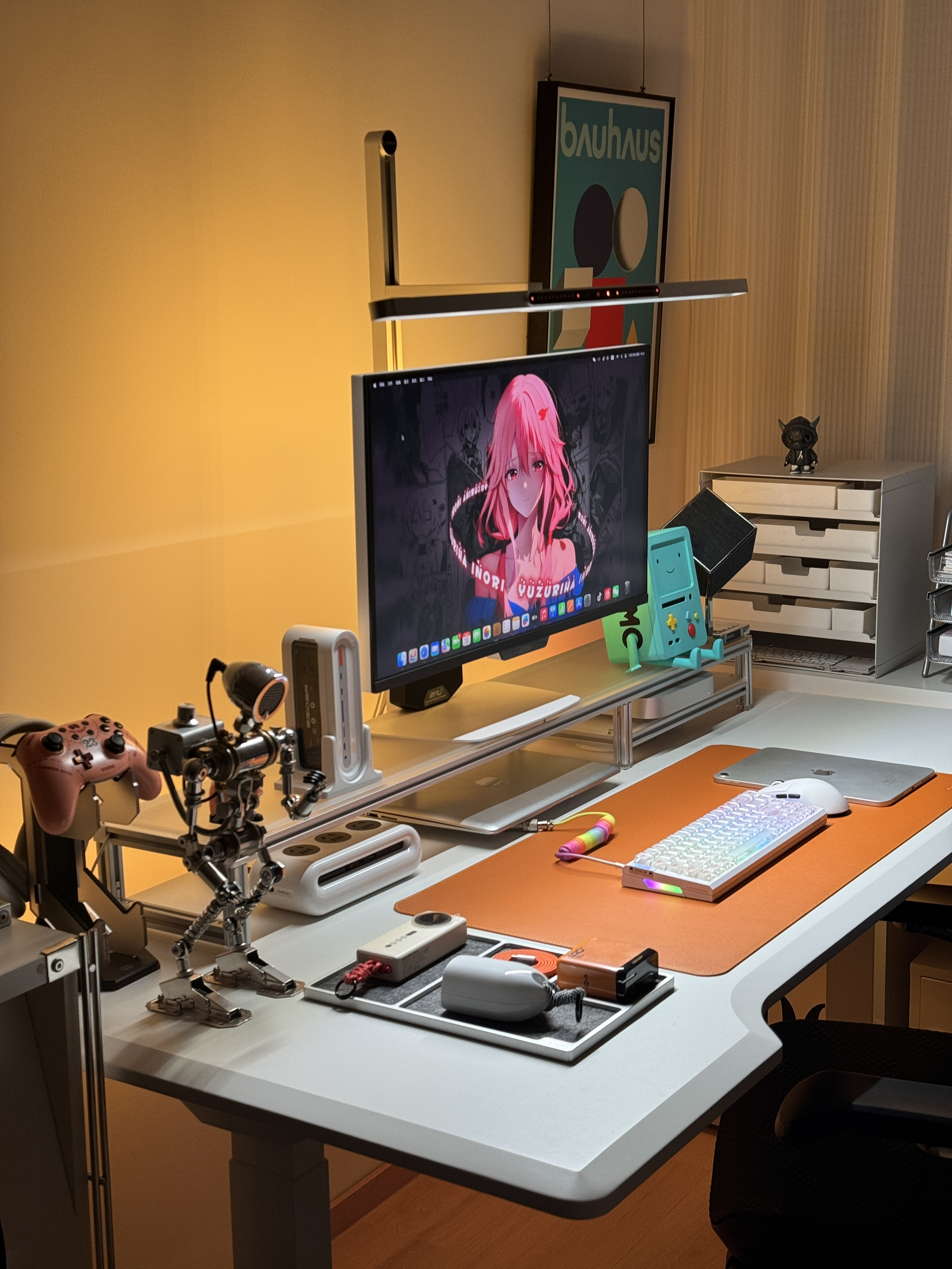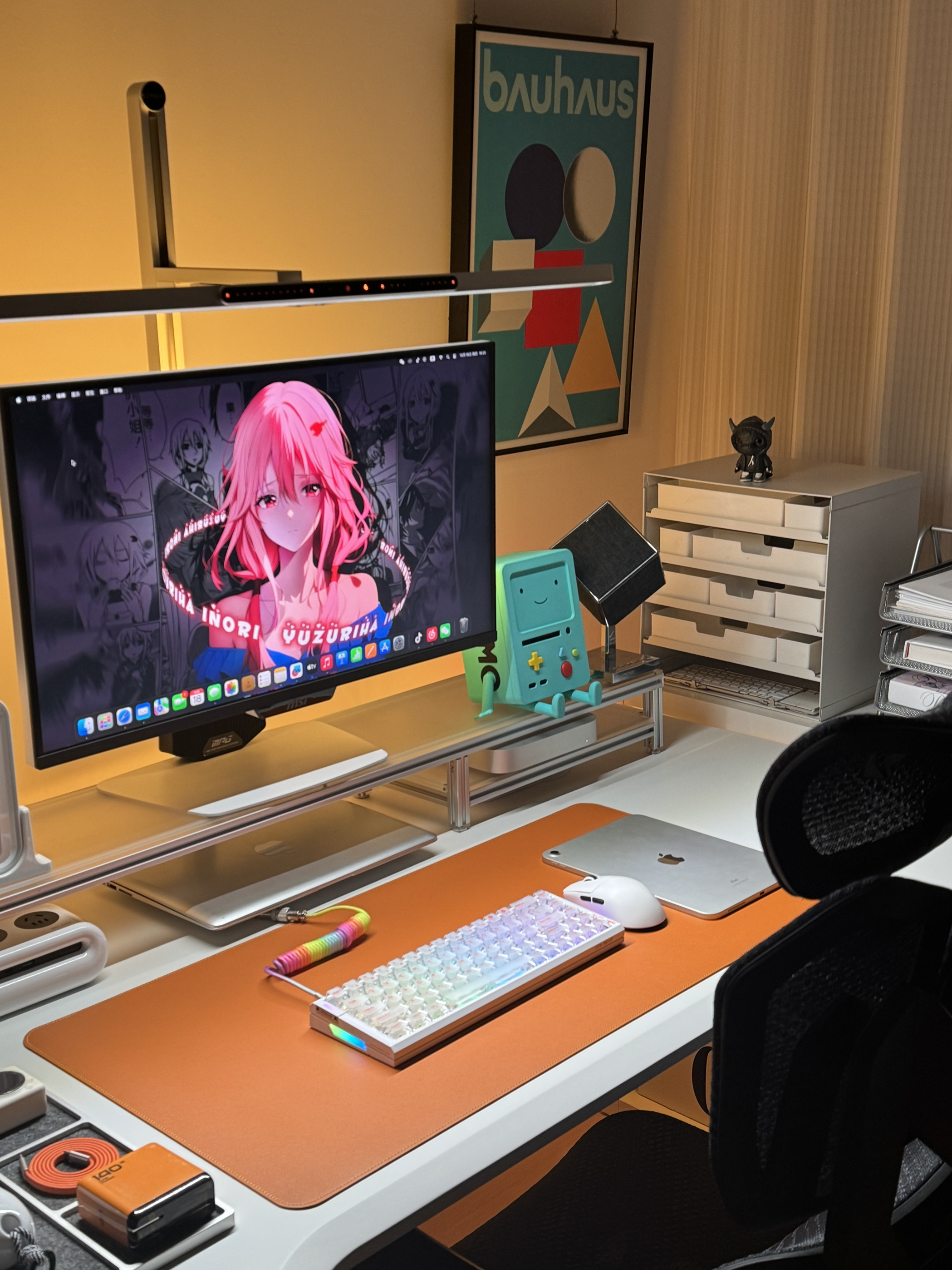 终于把桌面折腾到满意的状态啦✨ 暖光氛围拉满,每次坐下来都觉得超治愈~ 电竞桌+人体工学椅的组合,久坐办公/打游戏都不觉得累;显示器上的02壁纸是本命,旁边的BMO小摆件直接戳中二次元DNA💙 机械键盘的透光键帽、金属质感的支架和收纳盒,细节处的精致感拉满,还有各种数码小配件整整齐齐归置好,强迫症表示极度舒适~ 把喜欢的元素都揉进小小的桌面里,这大概就是打工人的快乐星球吧🌍 📸桌面清单(部分...