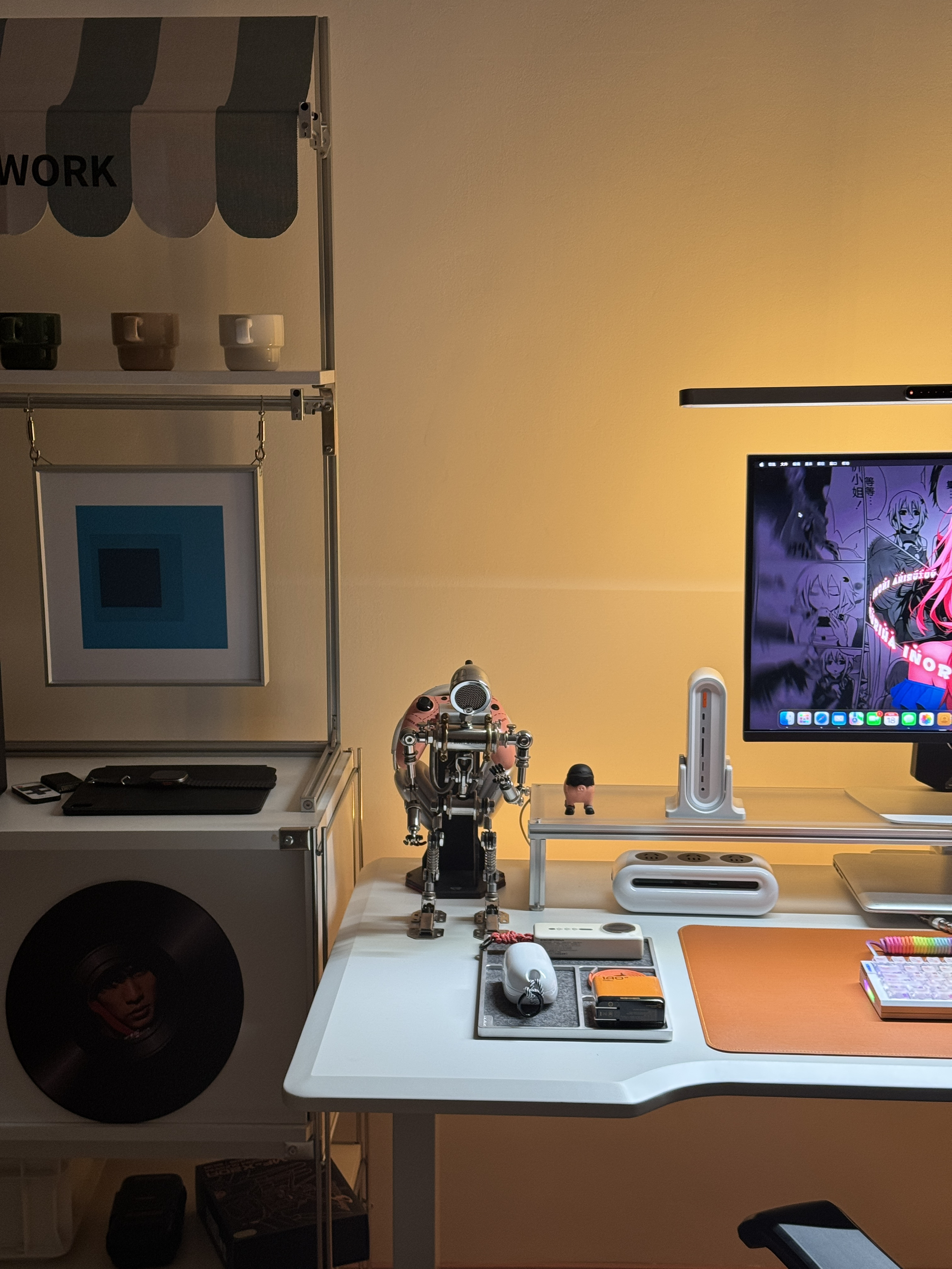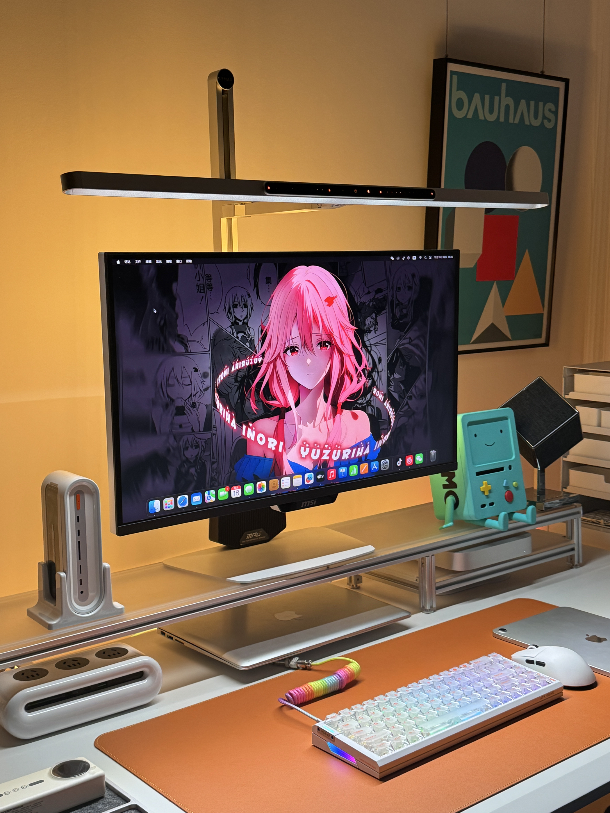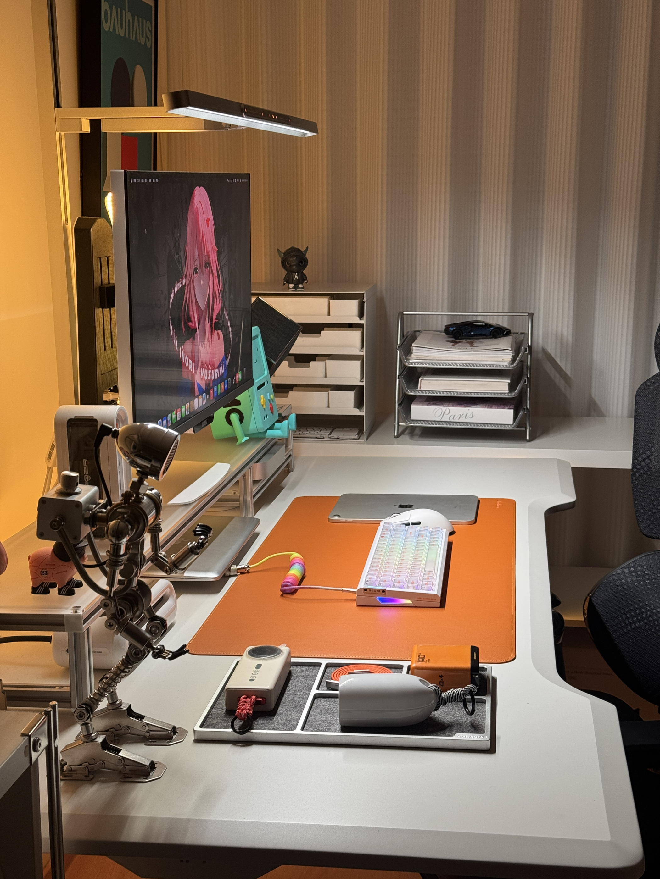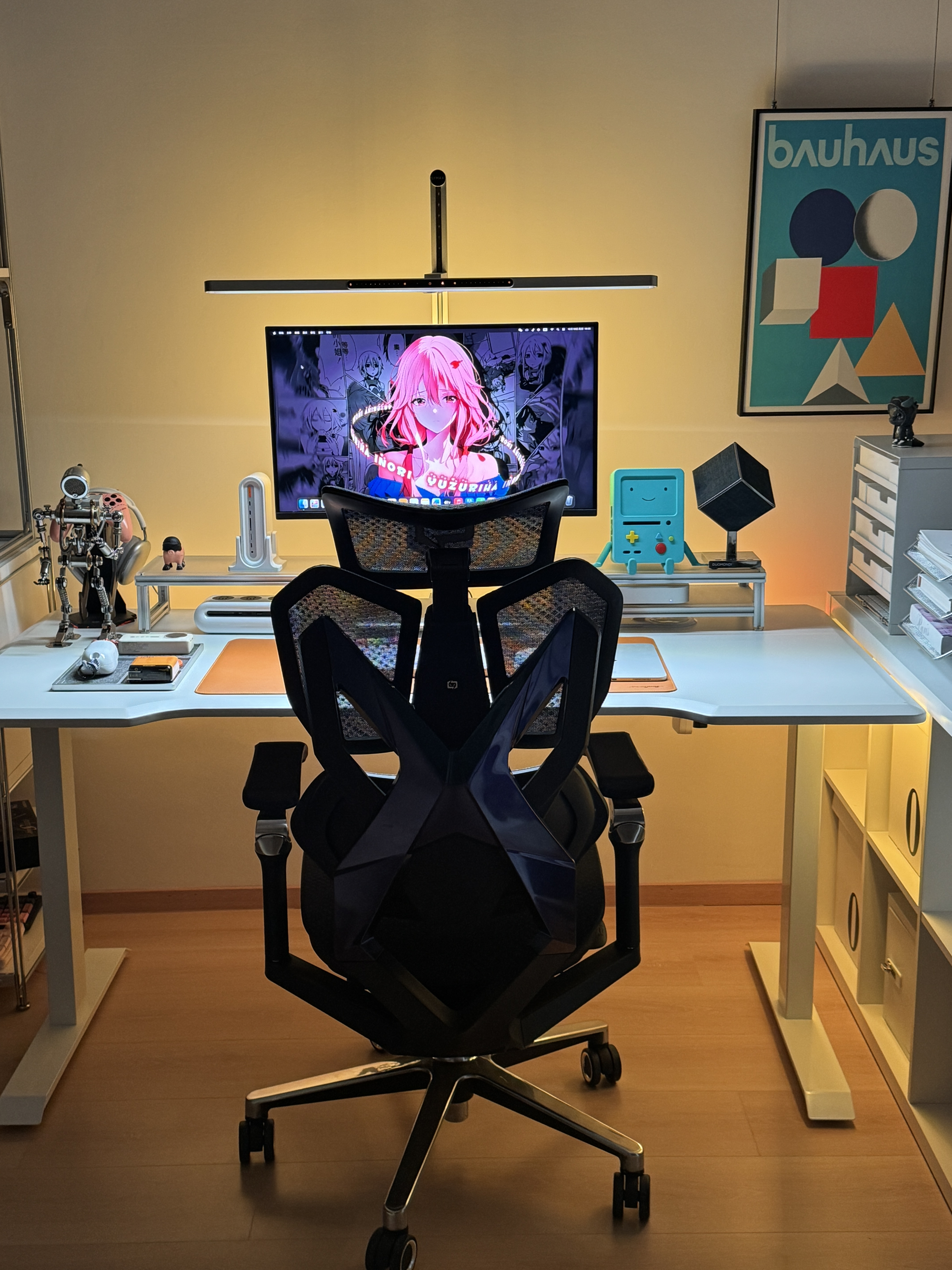 终于把桌面折腾到满意的状态啦✨ 暖光氛围拉满,每次坐下来都觉得超治愈~ 电竞桌+人体工学椅的组合,久坐办公/打游戏都不觉得累;显示器上的02壁纸是本命,旁边的BMO小摆件直接戳中二次元DNA💙 机械键盘的透光键帽、金属质感的支架和收纳盒,细节处的精致感拉满,还有各种数码小配件整整齐齐归置好,强迫症表示极度舒适~ 把喜欢的元素都揉进小小的桌面里,这大概就是打工人的快乐星球吧🌍 📸桌面清单(部分...