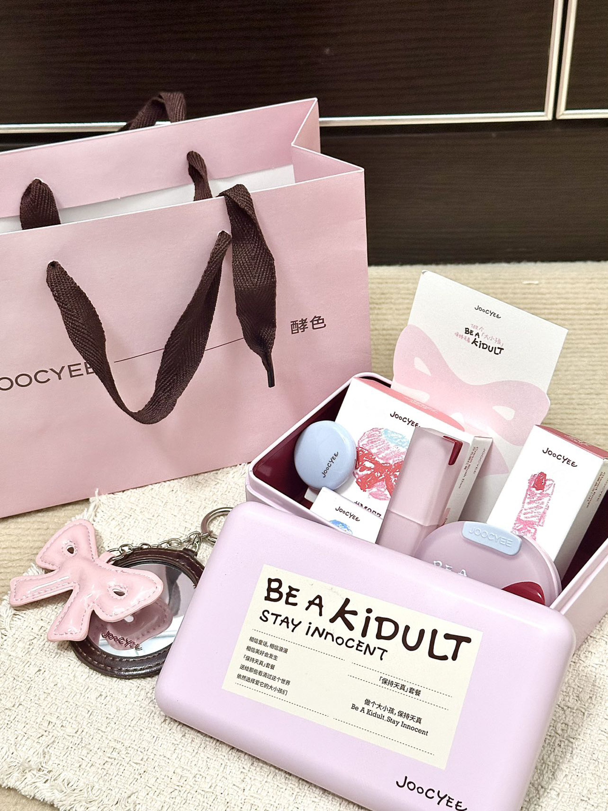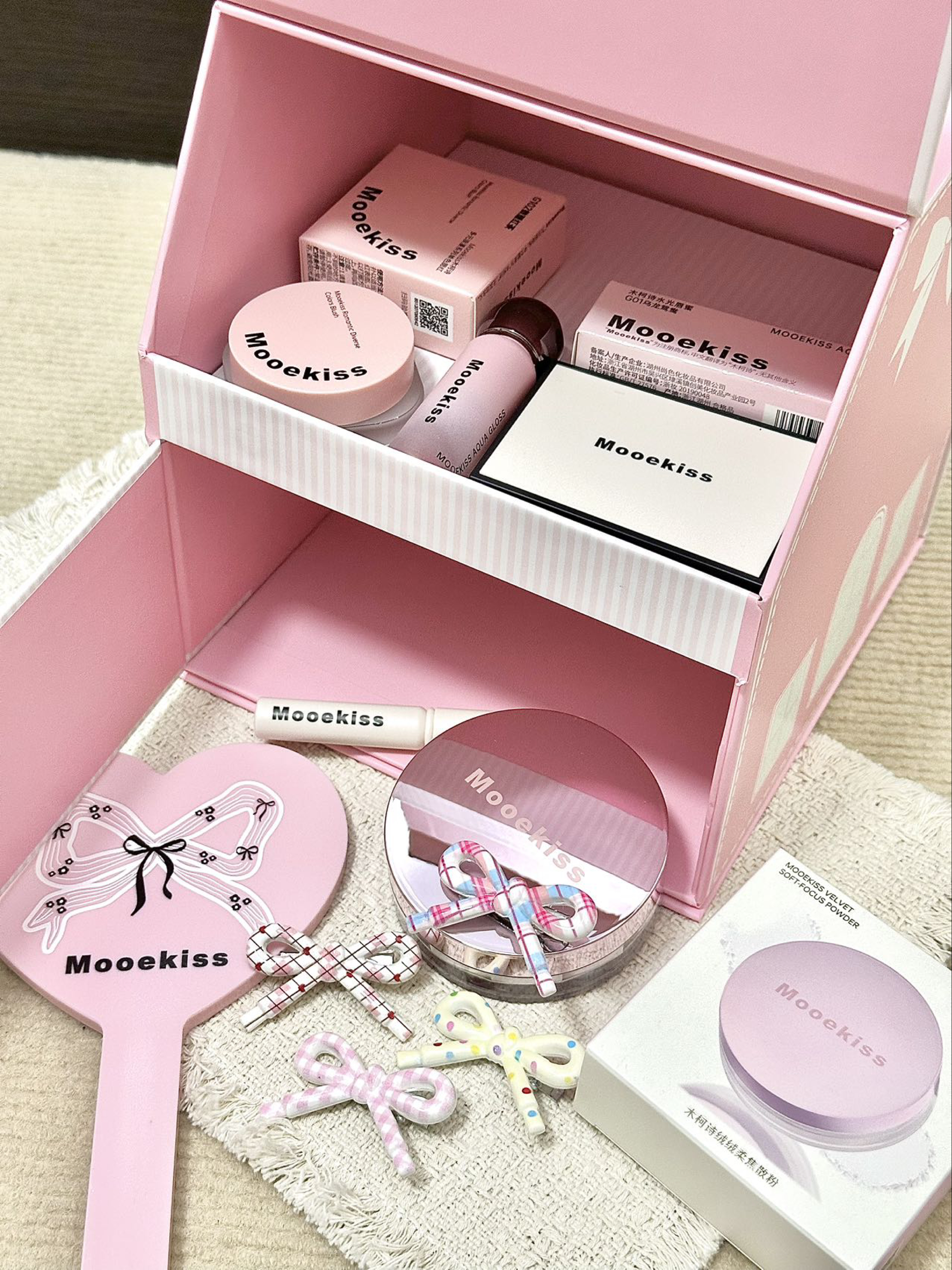 仪式感满满的大礼盒,哪个姐妹不喜欢~ 木柯诗这次的甜蜜心房礼盒雀实很漂亮啊 粉粉嫩嫩的包装,再高冷的人收到也会笑的 里面还有不少单品,每个都很实用 唇釉G01乌龙鸳鸯一款很日常的配色 感觉黄皮姐妹涂着也很显嫩 还很贴心配备了一支唇刷 修容盘也不挑肤色,上脸不显脏,很自然 散粉的粉质摸起来也很细腻清透 腮红还能作为眼影或者口红来用 一支多用,妆容统一氛围感满满 还有四个可爱的蝴蝶结发卡 说真的,收到...