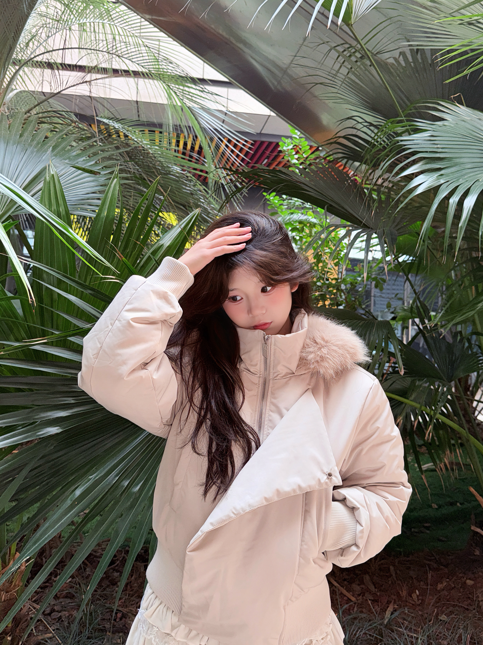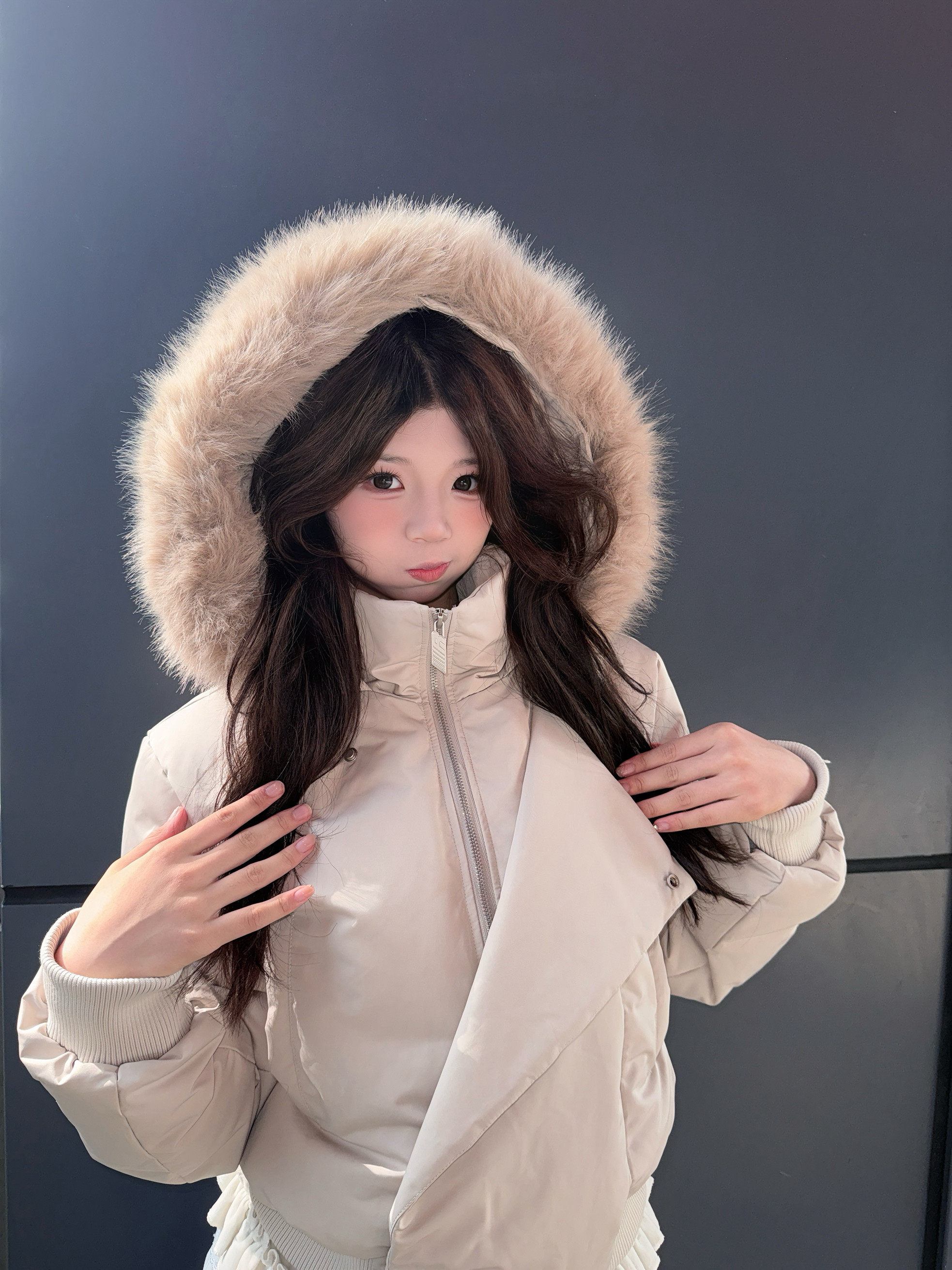 这个有两种穿搭方法 第一种可以把拉链全拉上、显得很端庄大气!第二种半拉式、可以让衣服更显可爱!这个帽子戴上之后尊滴很出片 冬季好搭档fdr 质量没话说 非常好 我买的这一款是那种带点休闲但是不缺乏设计感的羽绒服!设计感非常好!