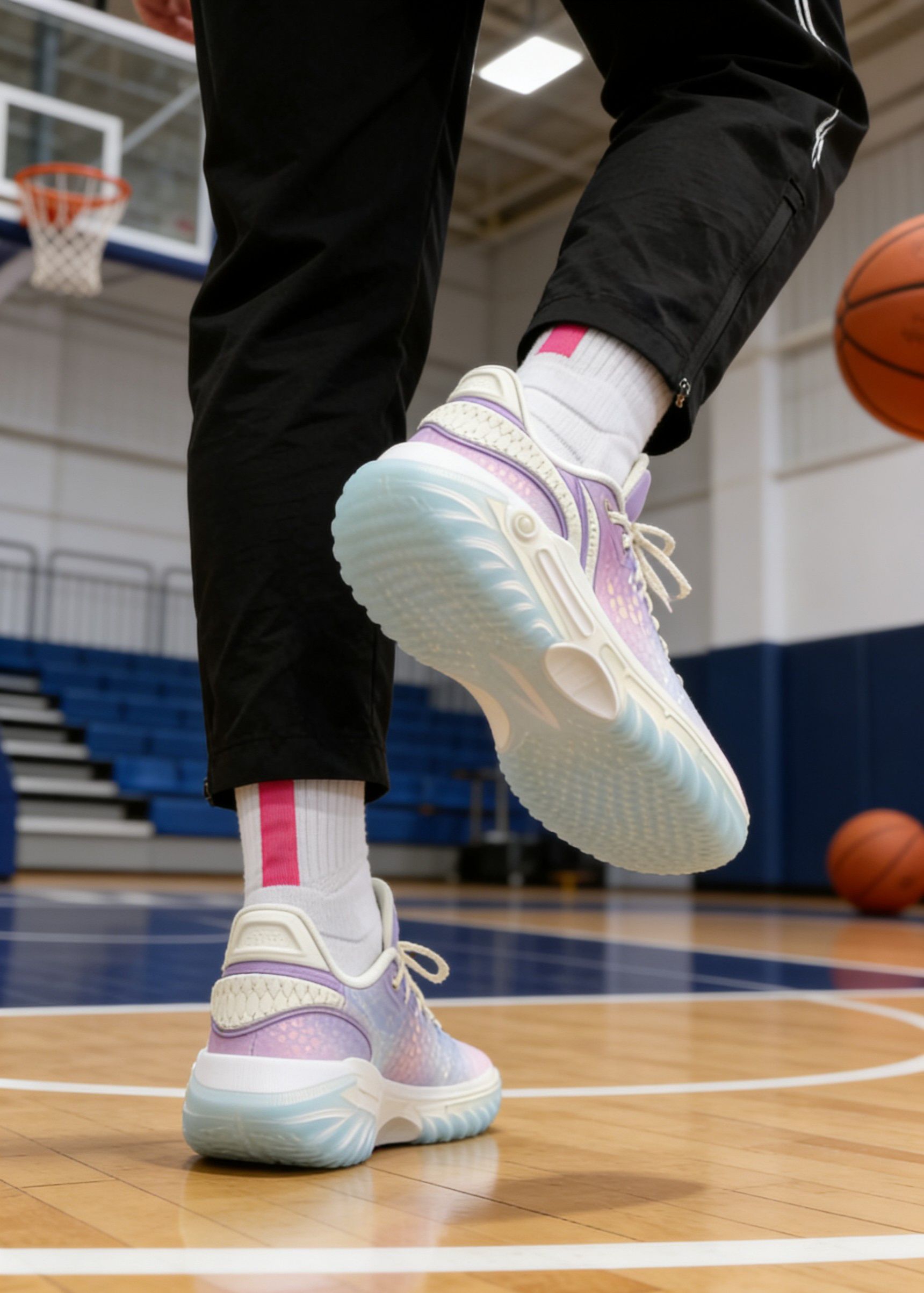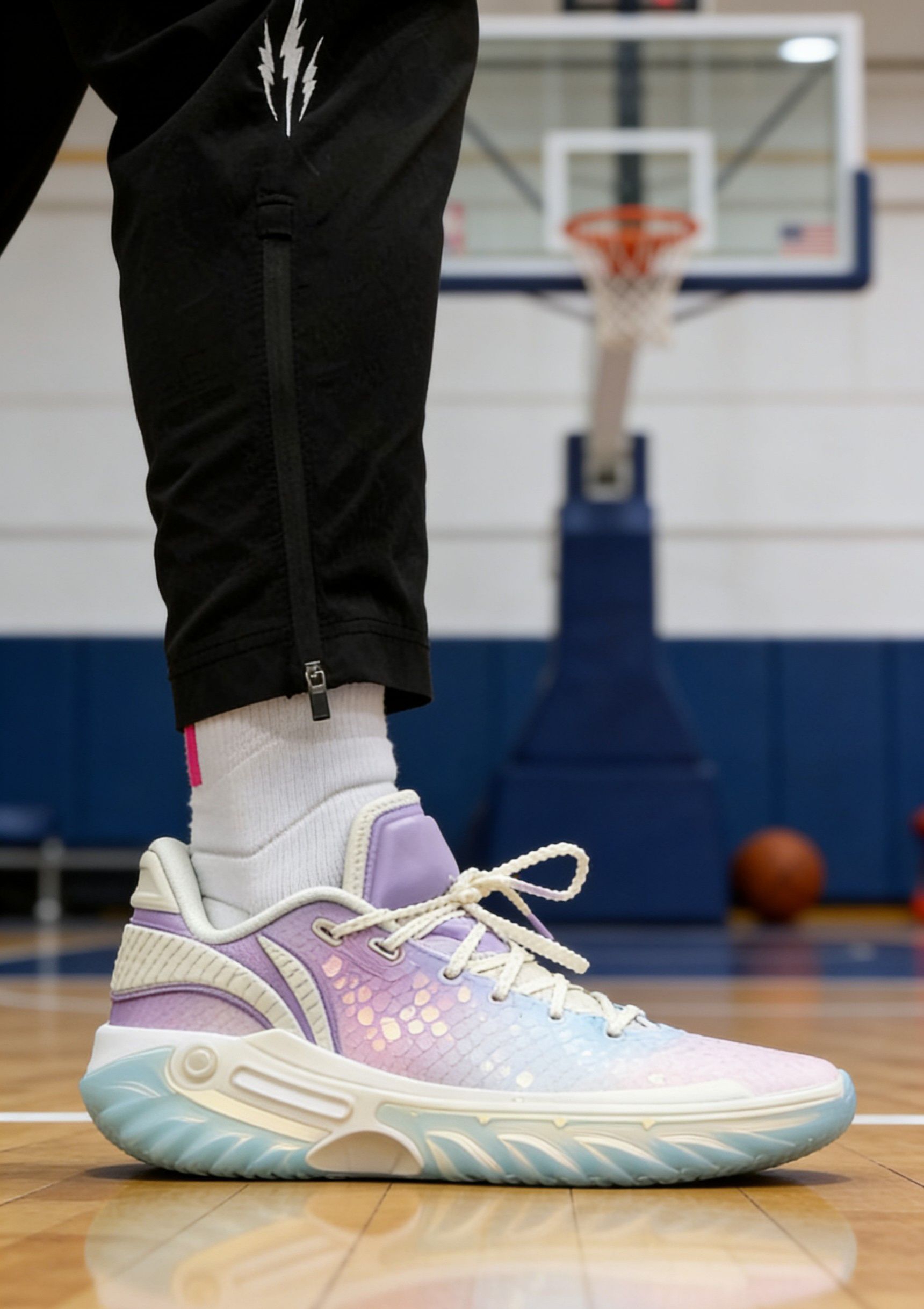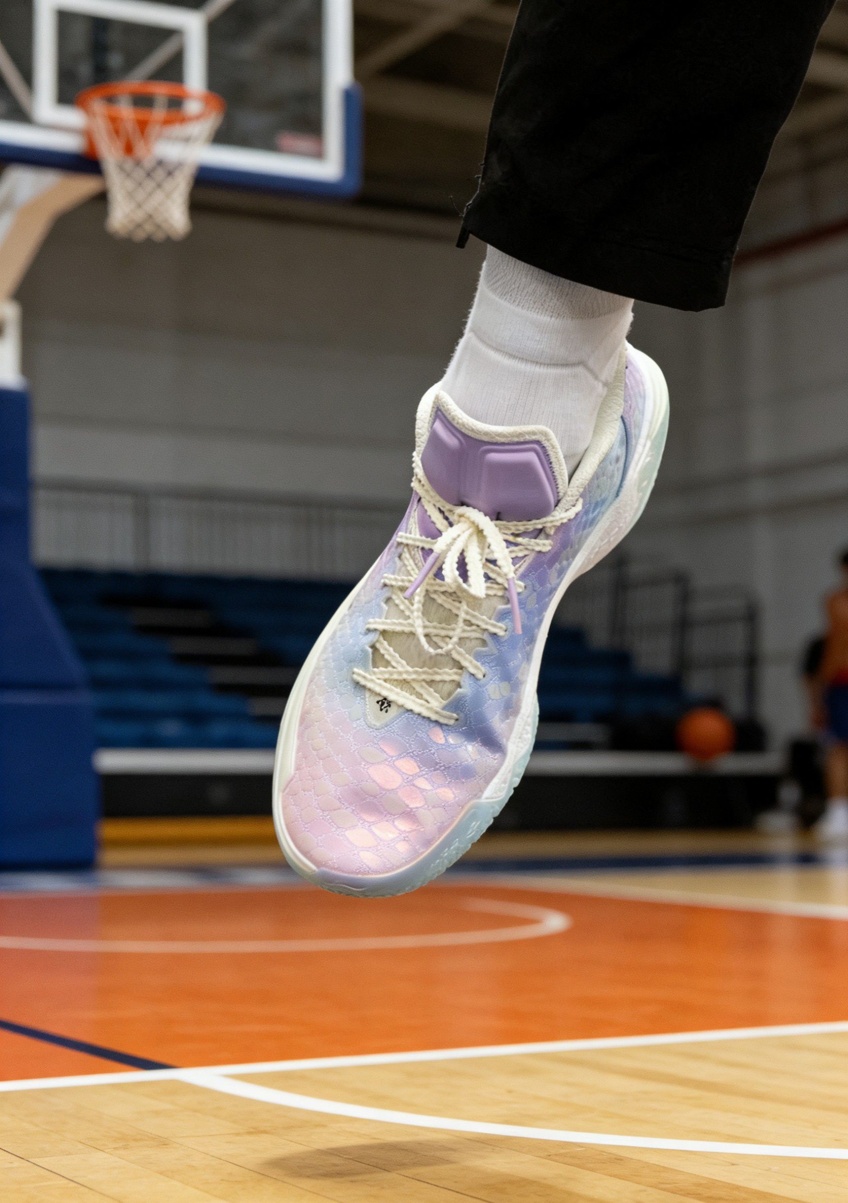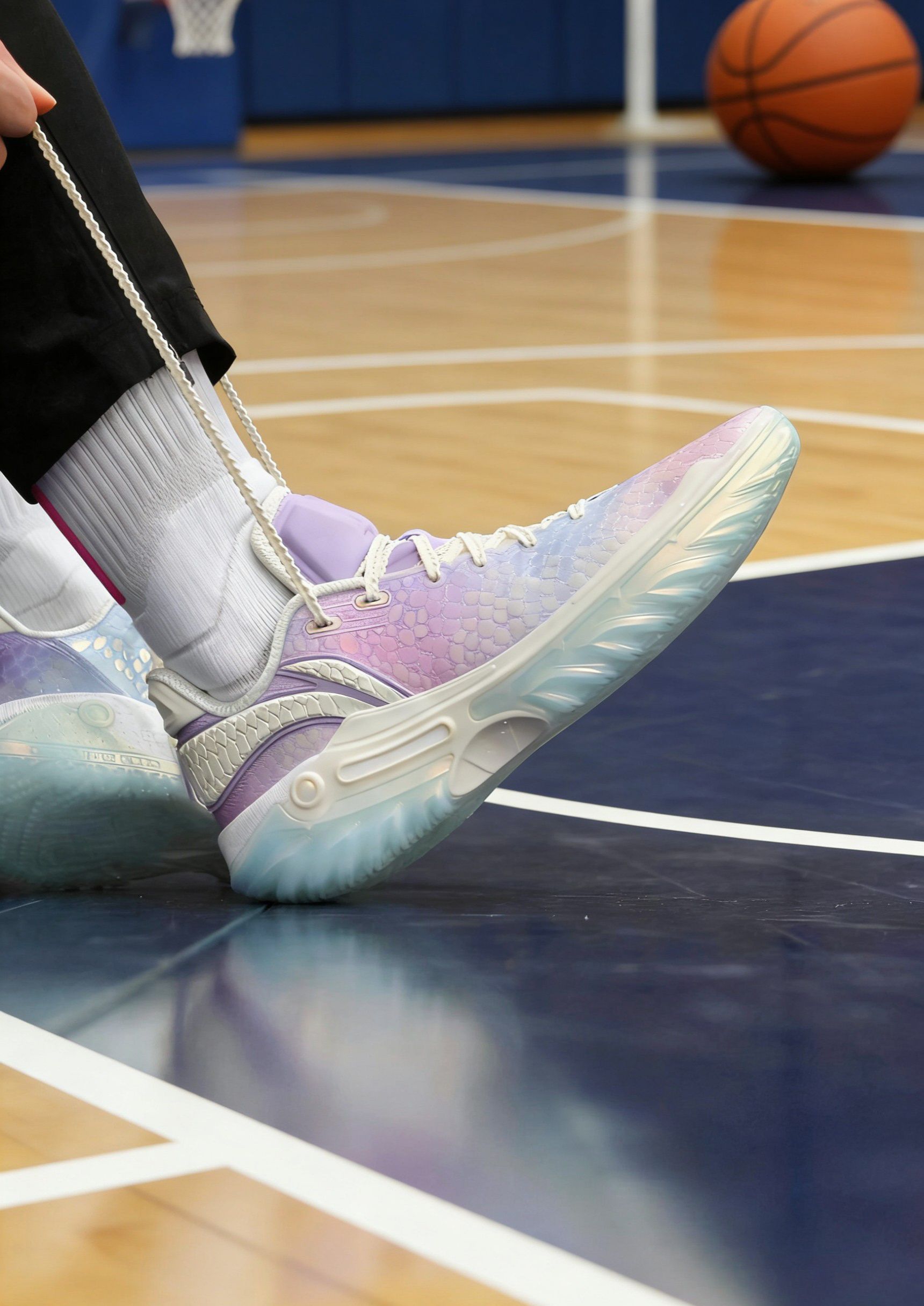 这双以人鱼姬渐变紫为主调的篮球鞋,光是视觉呈现就足以让球鞋爱好者眼前一亮,而实战体验下来,它也并非“花瓶”,在球场表现上有着不少可圈可点之处。 鞋面采用人鱼鳞纹理的渐变材质,从淡粉到浅紫再过渡到冰蓝,在不同光线角度下能折射出不一样的光泽感,少女心与未来感兼具。鞋舌、鞋带处的米白色拼接,中和了炫彩鞋面的张扬,整体配色和谐又吸睛。鞋身线条流畅,低帮设计搭配流线型轮廓,上脚后显得脚型修长,无论是实战上...
