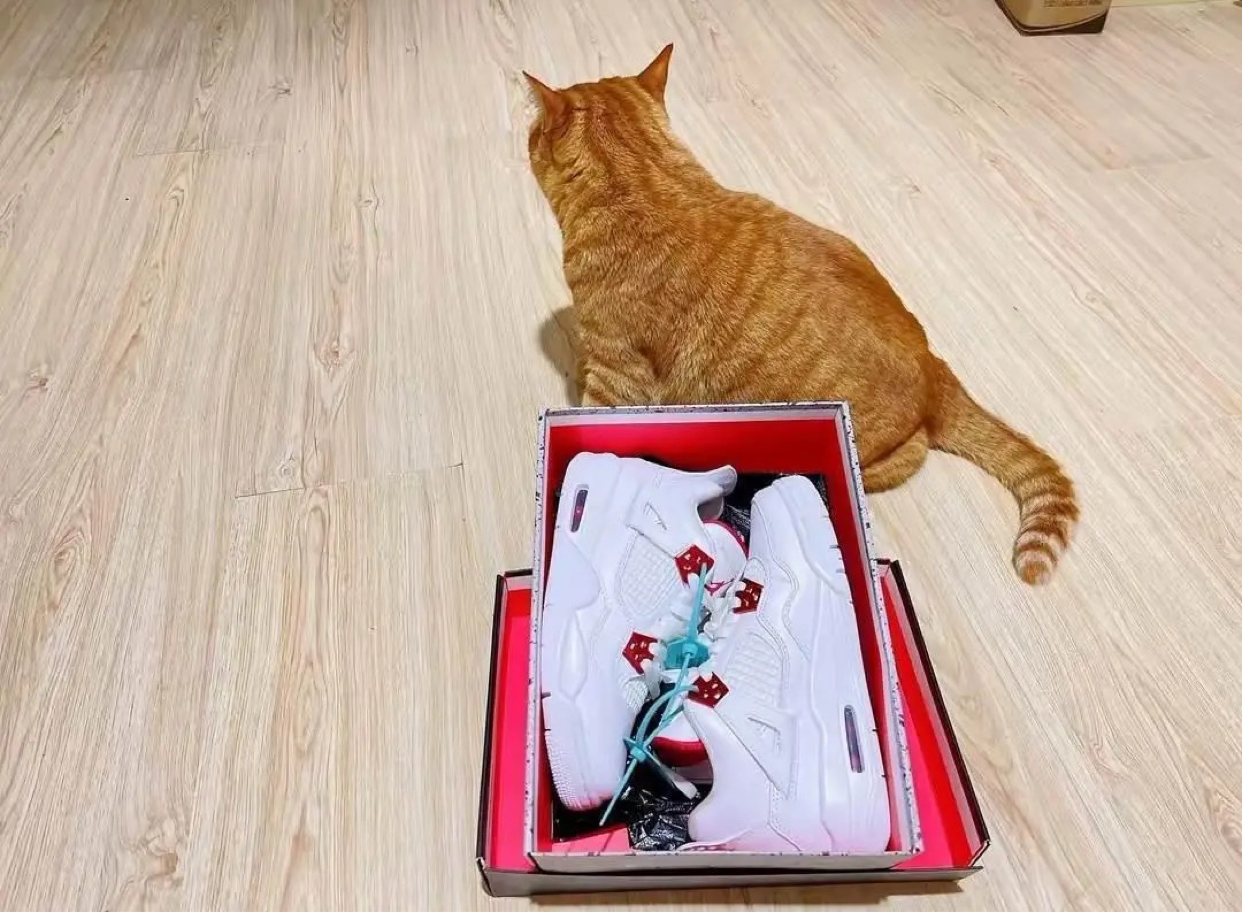 家人们,心心念念的AJ4白红终于到手了,连我家橘猫都蹲在旁边盯着看,看来它也觉得这双鞋颜值在线! 先说说颜值,纯白鞋身搭配红色细节点缀,干净又亮眼,不管搭牛仔裤还是运动裤都超百搭,穿出门回头率直接拉满。鞋身的皮质摸起来很细腻,做工也很扎实,没有明显的溢胶和瑕疵,质感完全对得起价格。 上脚的脚感比我想象中好太多,原本以为AJ4的鞋底会偏硬,结果踩上去软软的,前掌的气垫有明显的回弹感,日常走路逛街...