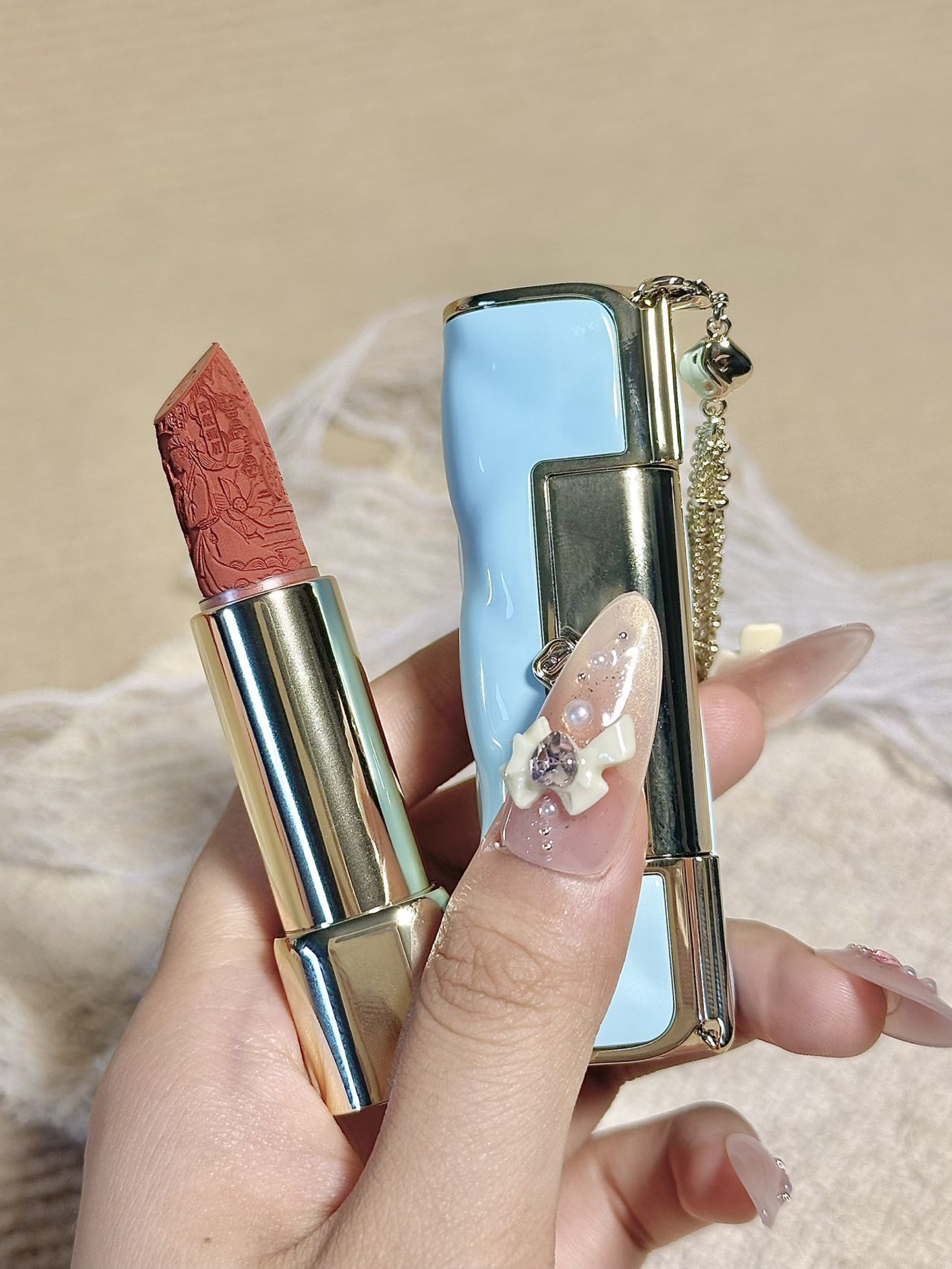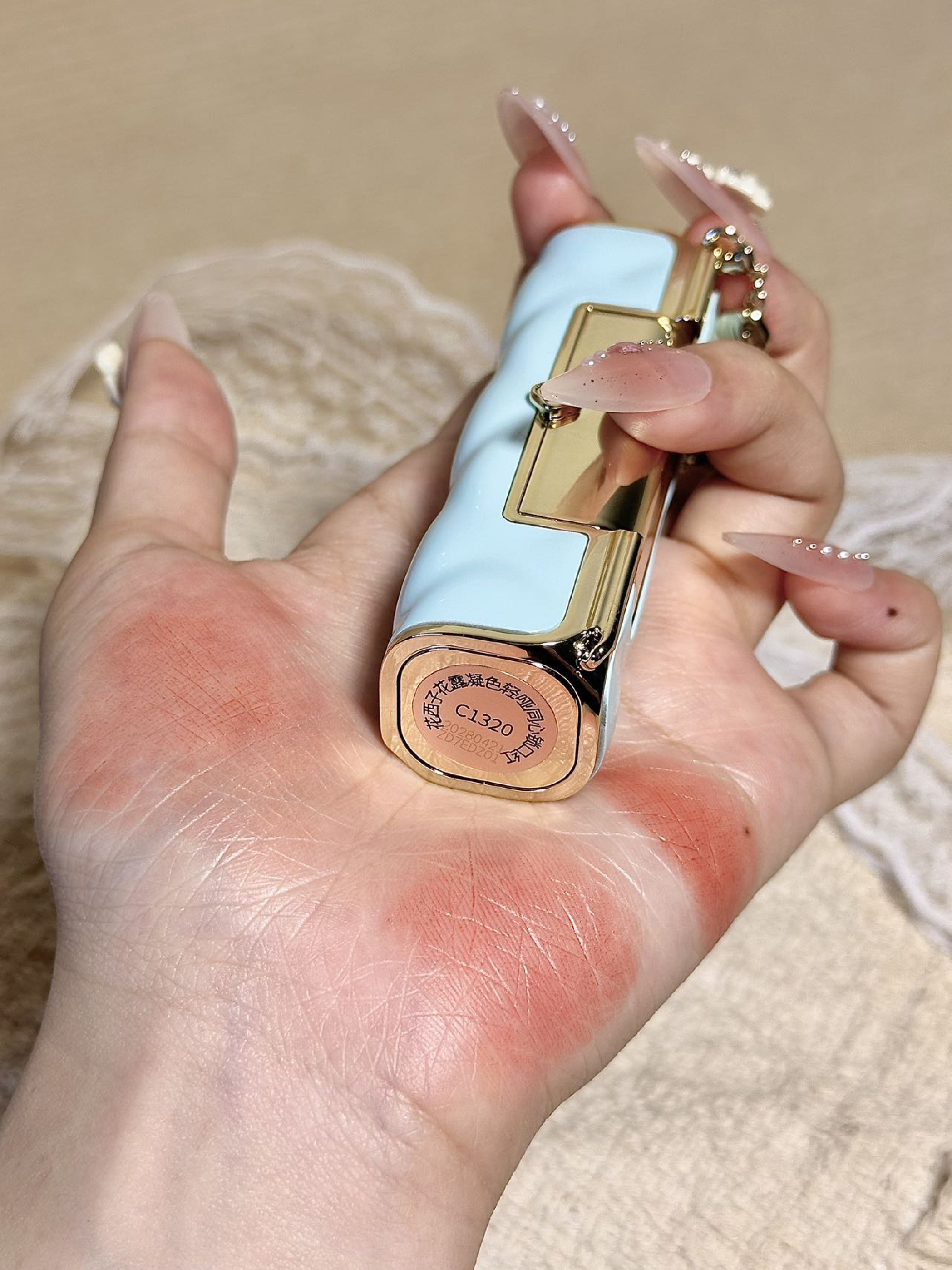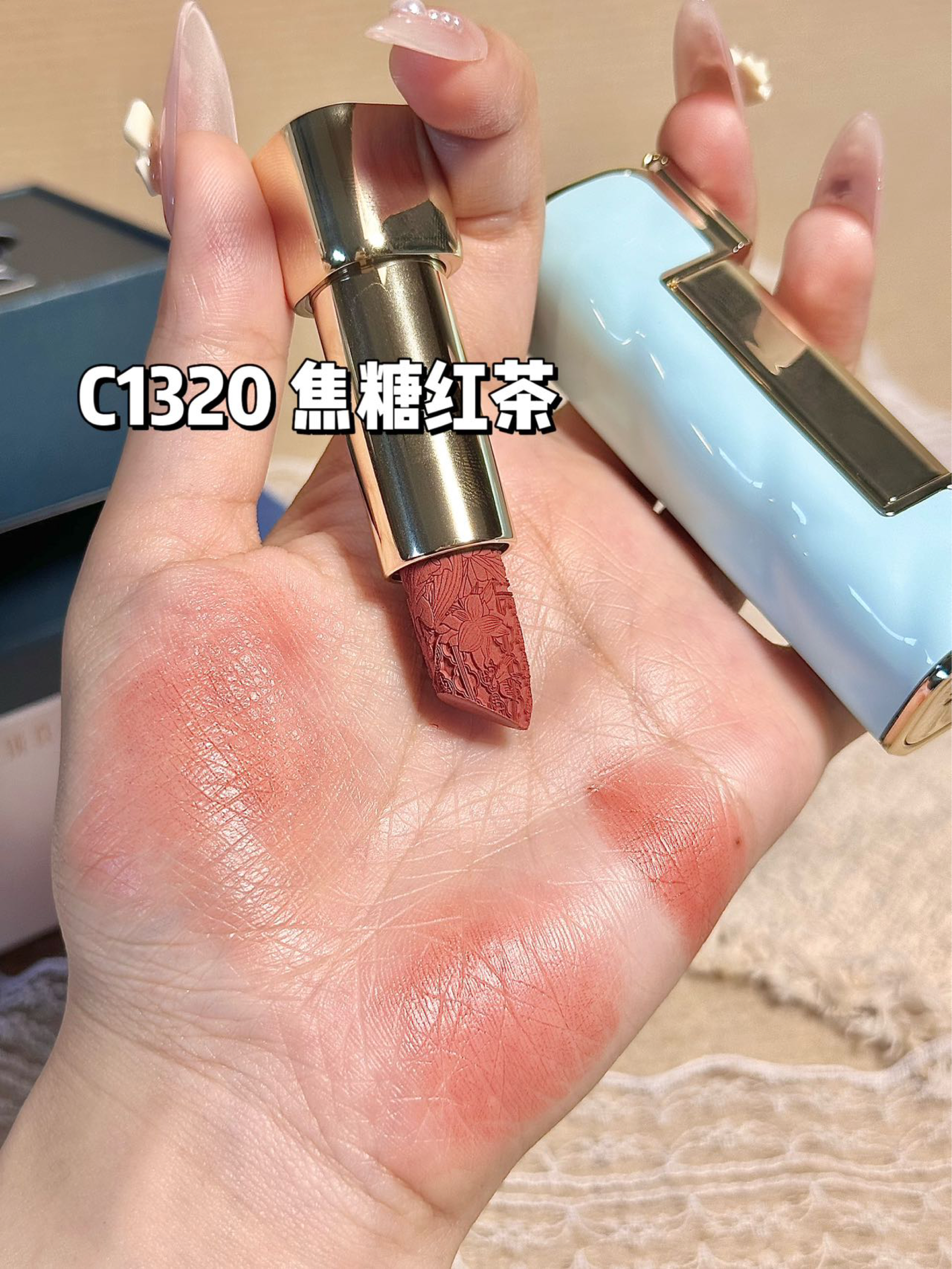 who懂?花西子新品尊滴好美啊 膏体的浮雕图案和包装的流苏设计 中式的浪漫,不愧是老祖宗的审美 还是我喜欢的 C1320色号 上嘴hin有气质,温柔大气的东方美人即视感 而且也不显唇纹,质地也hin水润 素颜涂上也不会突兀 公主们给我涂它!!