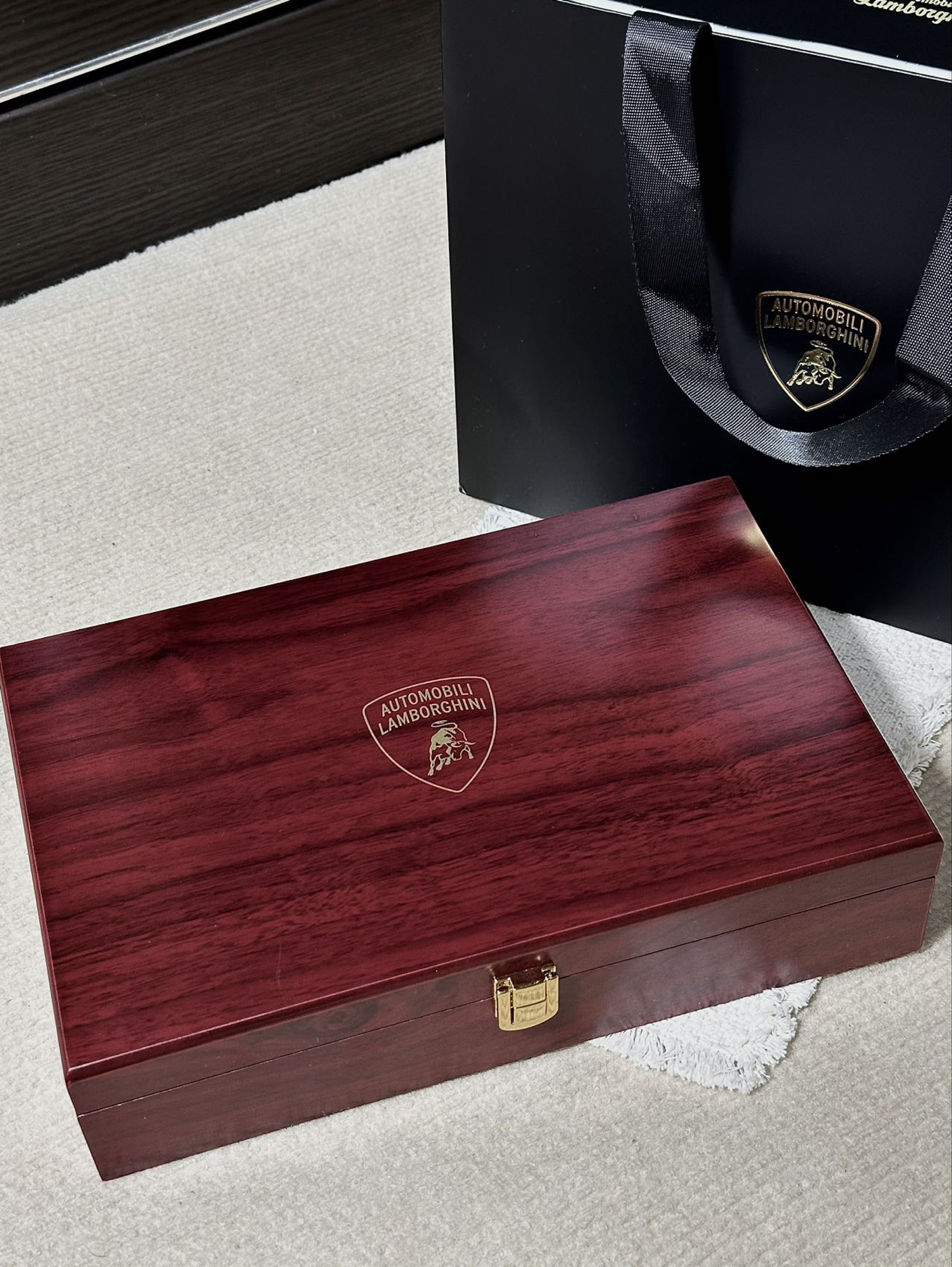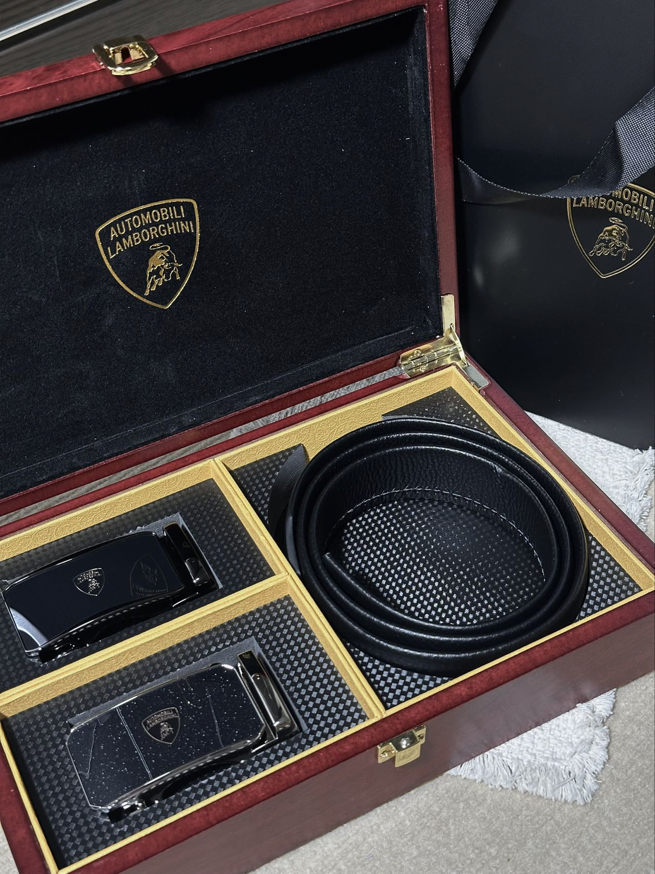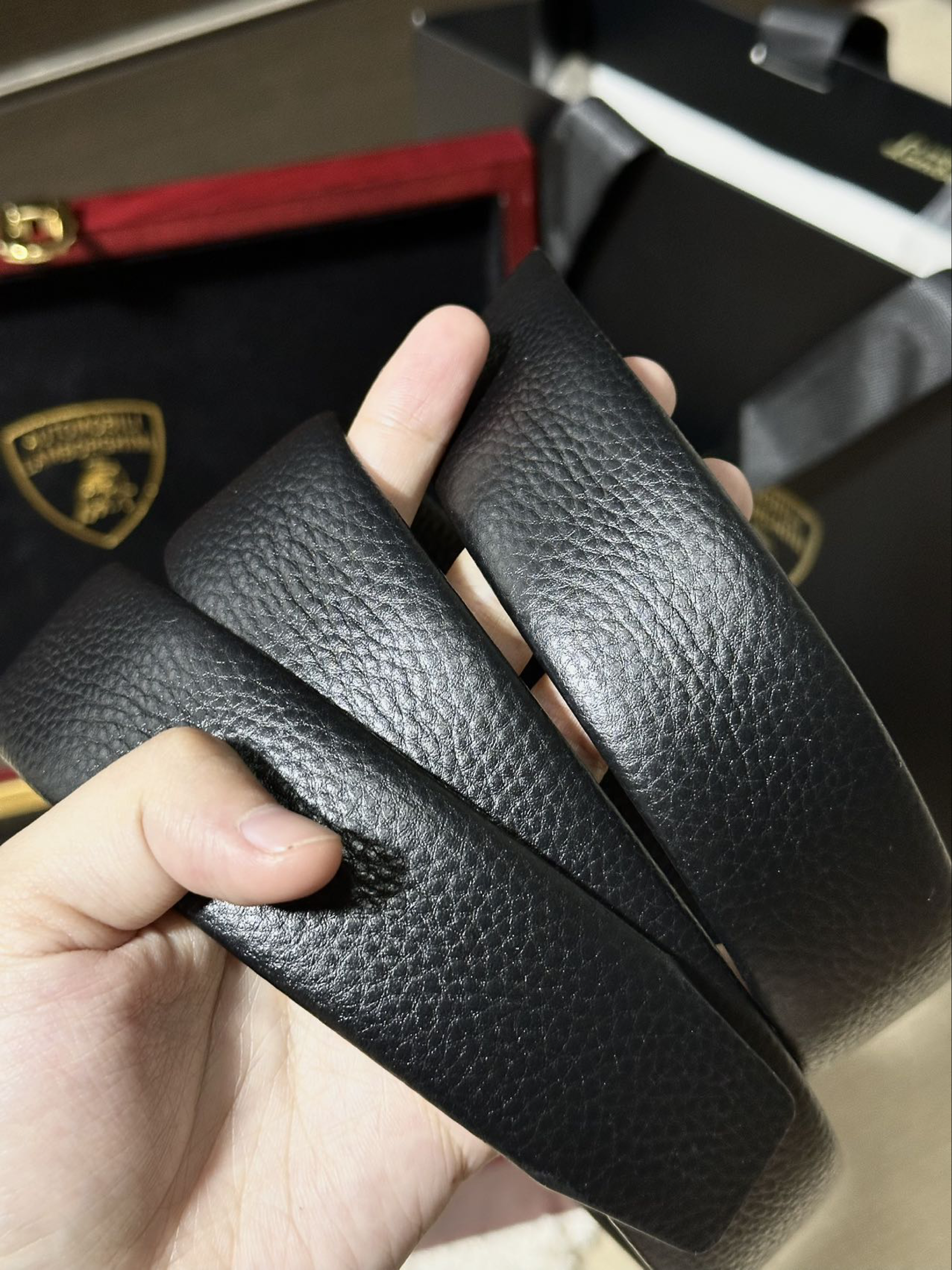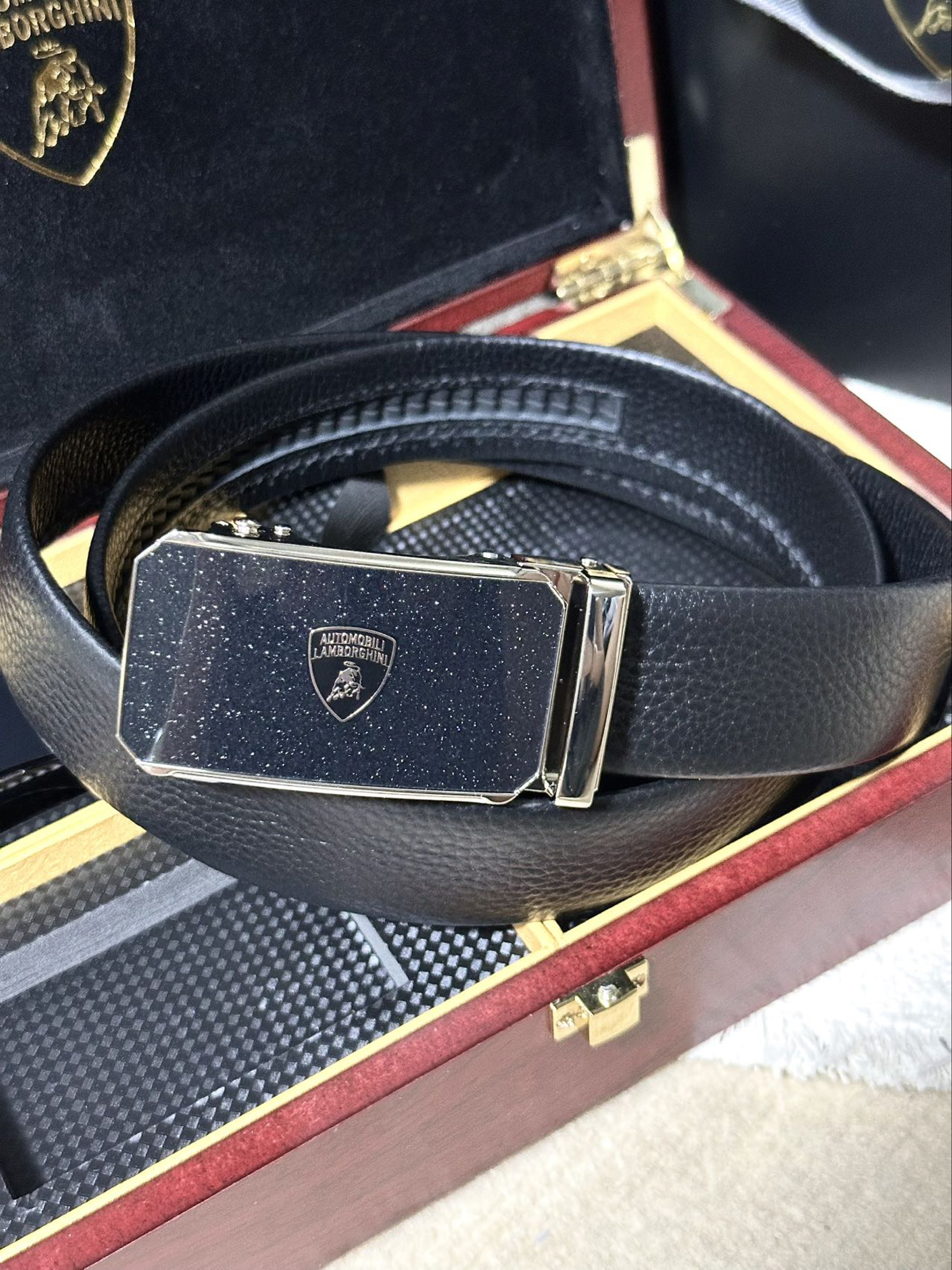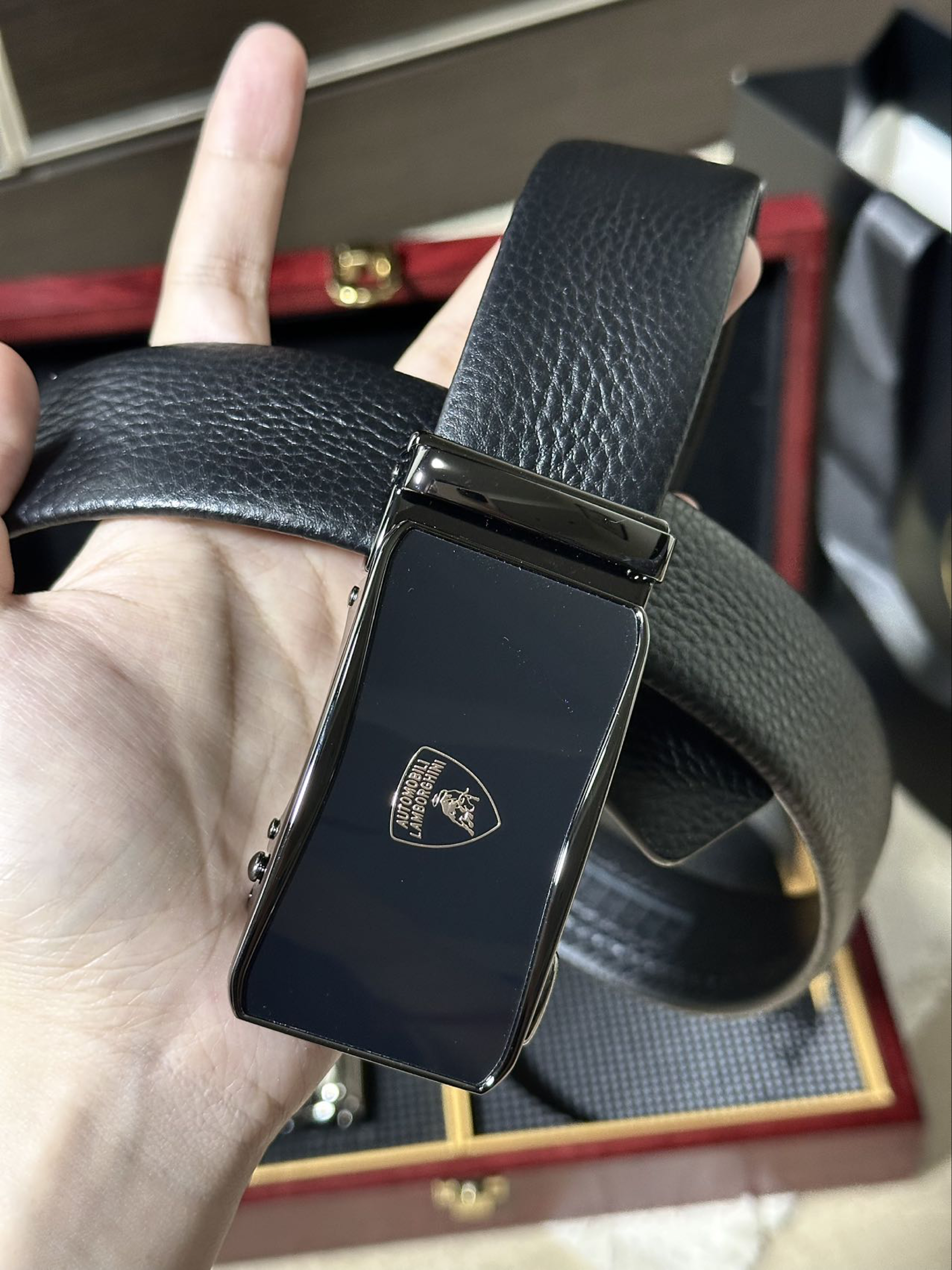 第一次接触到兰博基尼居然是以这种方式! 这不马上又到七夕了么,思来想去不知道买啥礼物 话说皮带是男人第二张脸 于是也是在网上挑了很久看中了这条兰博基尼皮带 红木外盒和金色内饰撞色 包装简约低调也不失大气 皮带拿在手里也很有质感 耐磨、柔韧有弹性摸起来手感很舒适 合金双扣头设计,头层牛皮材质很日常百搭的一款 这一套下来不给男朋友哄成大傻子了