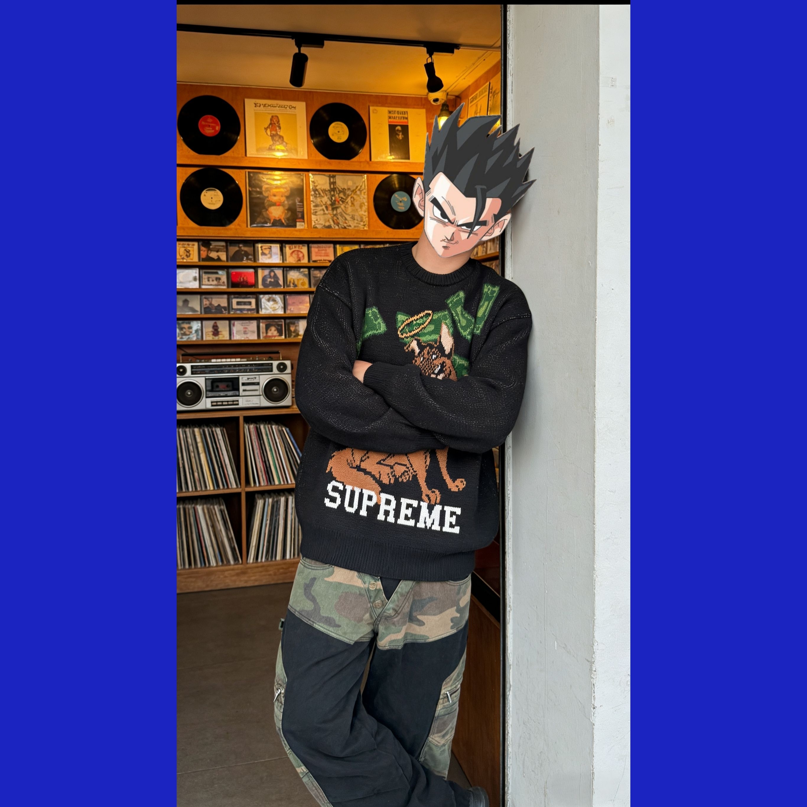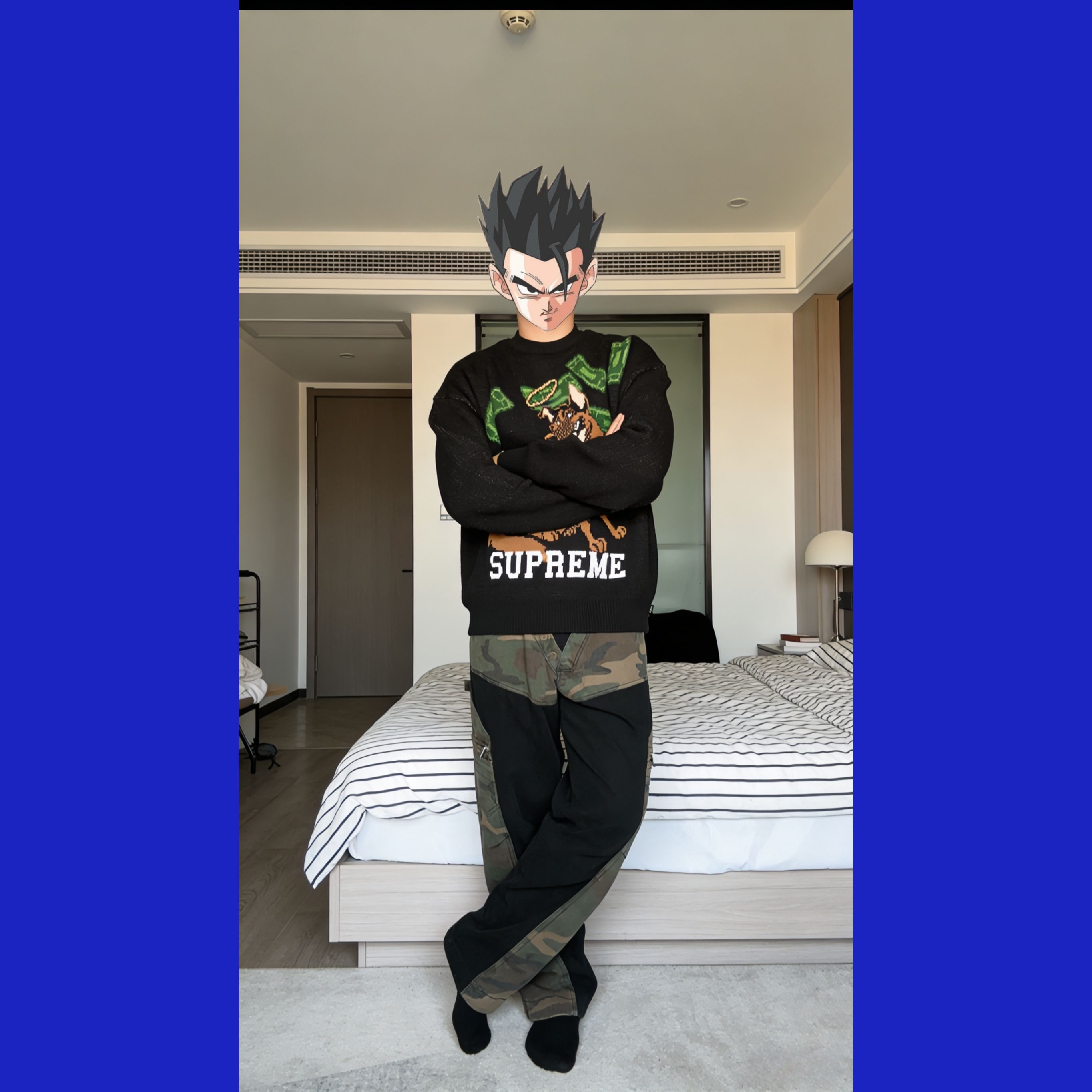 当Supreme的街头基因遇上迷彩工装的硬朗质感,这组穿搭直接把高街混搭的魅力拉满! 上身选的是Supreme黑色针织毛衣,经典的黑底搭配趣味的印花图案,自带潮牌的辨识度与复古腔调,宽松版型对身材的包容度也满分,慵懒中透着不羁的街头感。下装搭配迷彩拼接直筒工装裤,迷彩元素碰撞黑色拼接设计,工装风的硬朗与设计感兼具,直筒裤型还能轻松修饰腿型,利落又显气场。去掉拖鞋后,整体线条更简洁,将街头潮酷与...