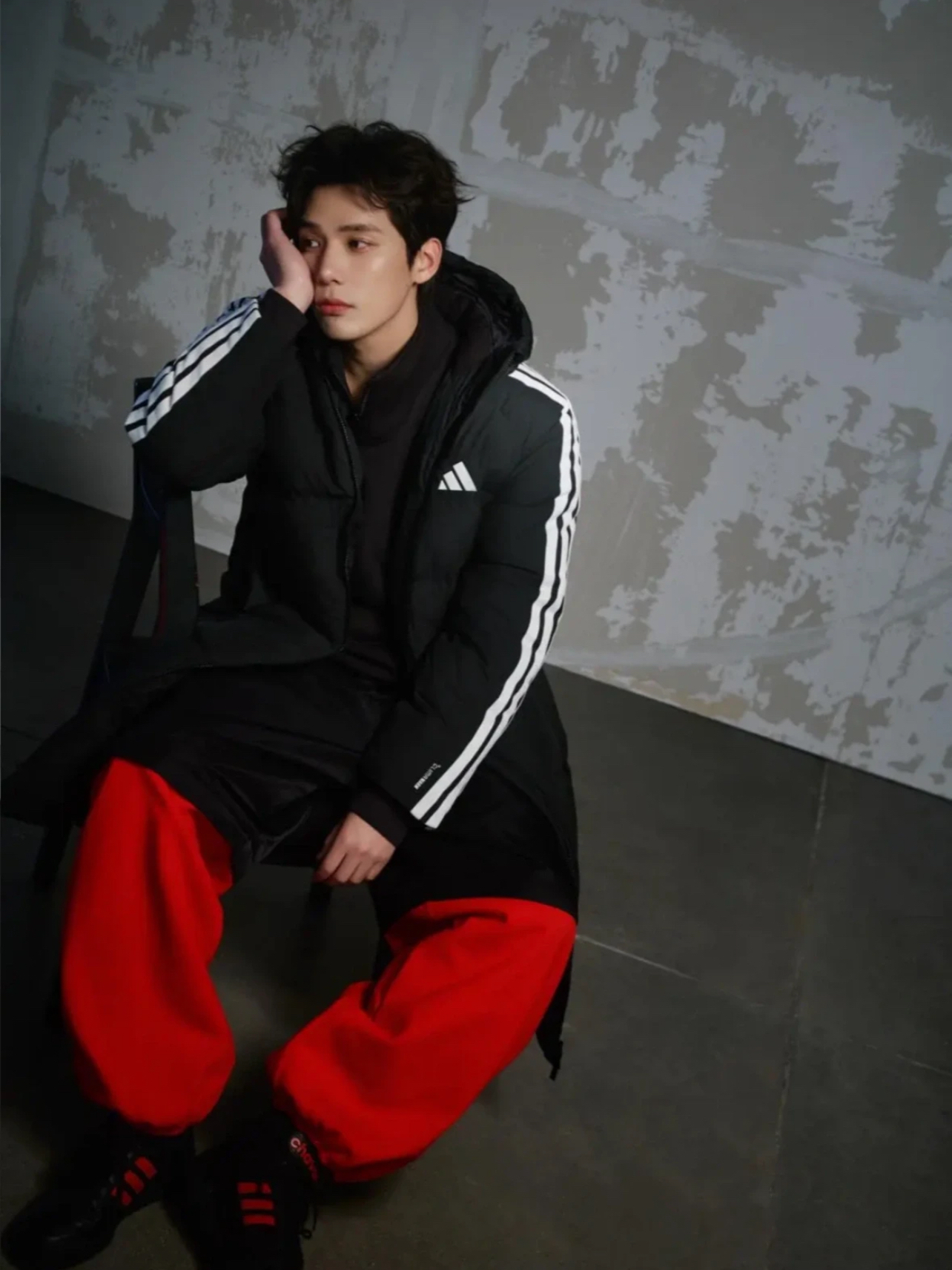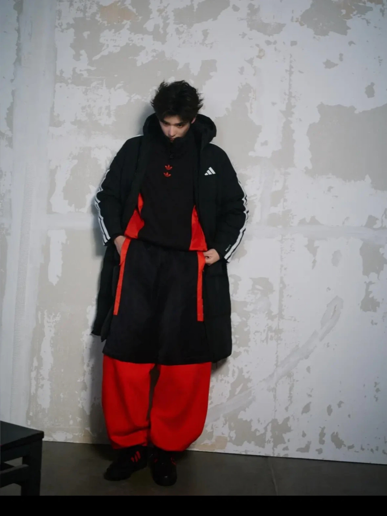 王安宇这套阿迪达斯造型超有范儿!黑色长款羽绒服保暖又利落,内搭红黑拼色运动套装,撞色设计点亮整体,搭配同品牌运动鞋,把运动风与潮酷感完美结合,冬日街头范直接拉满!