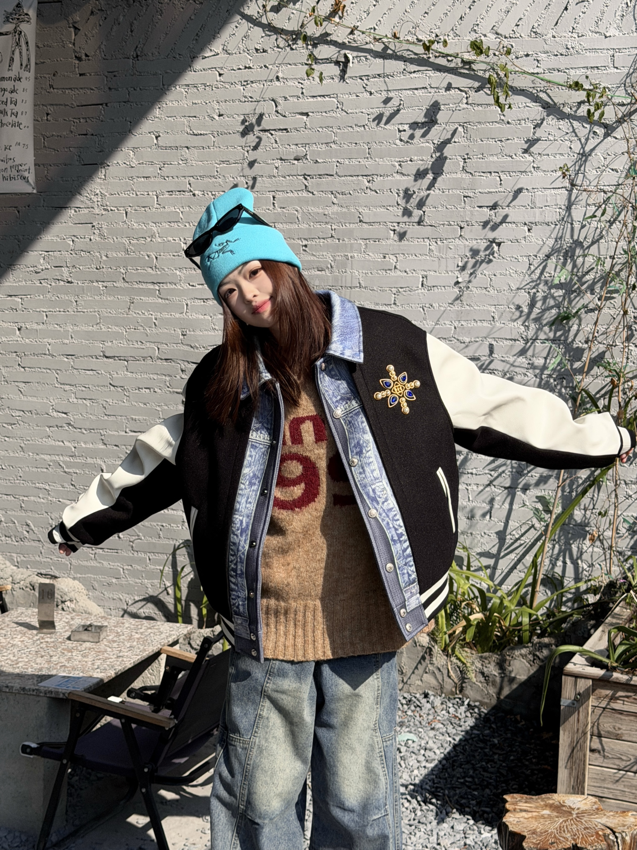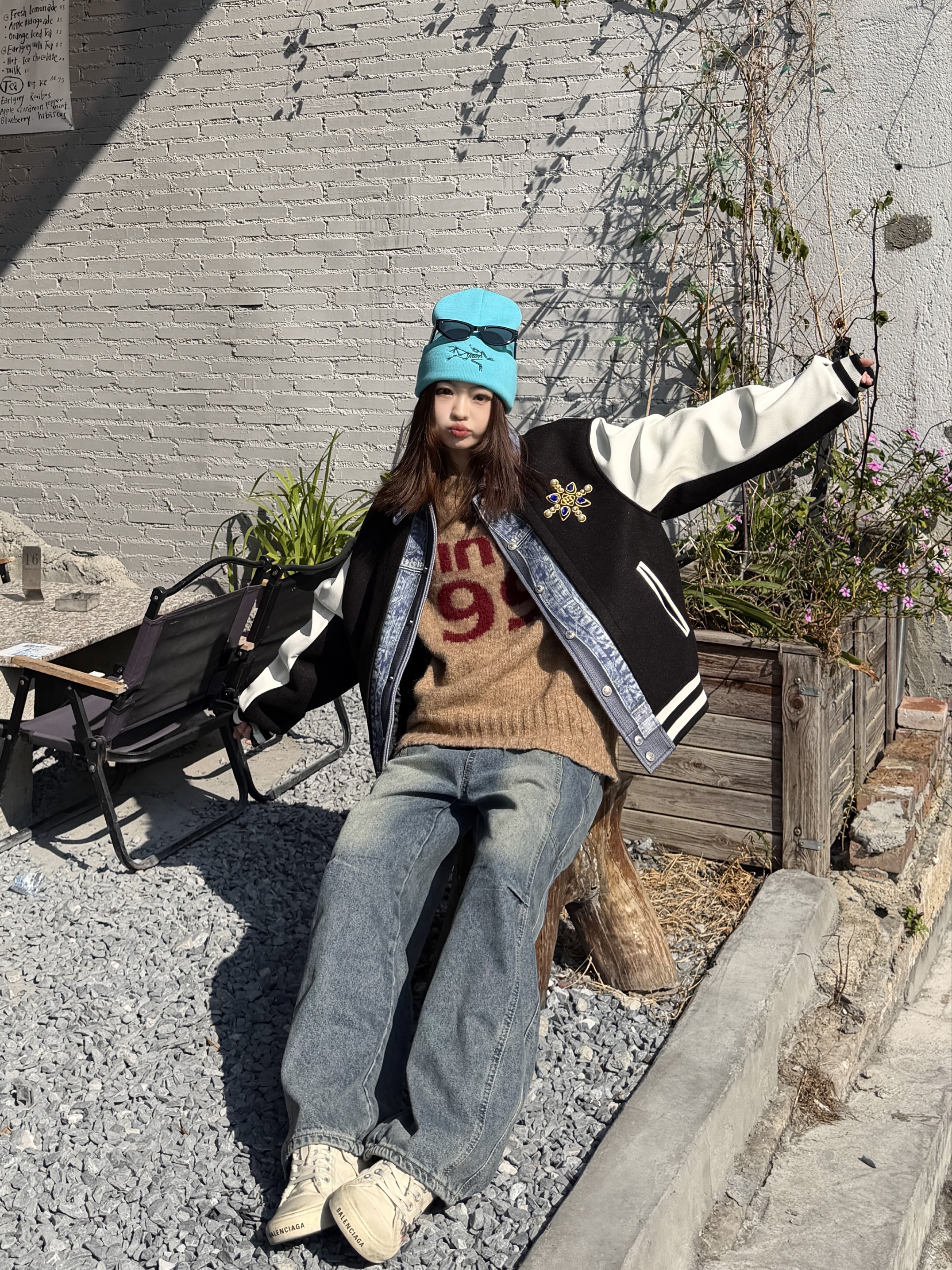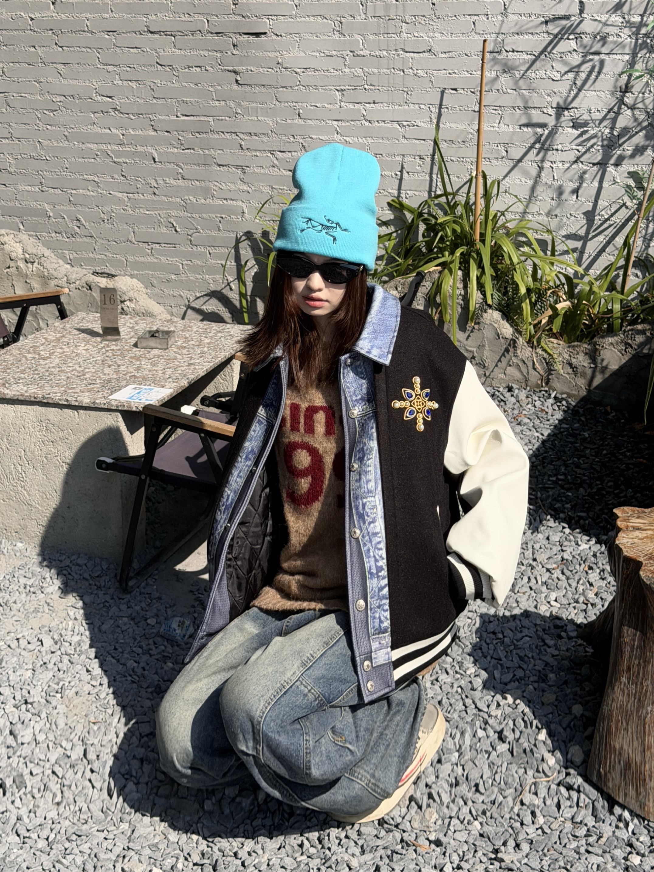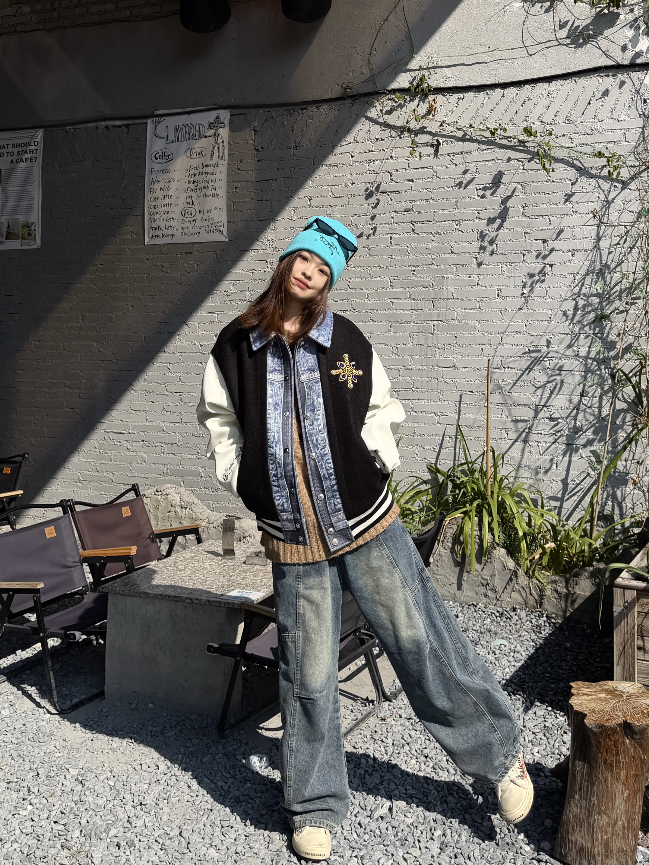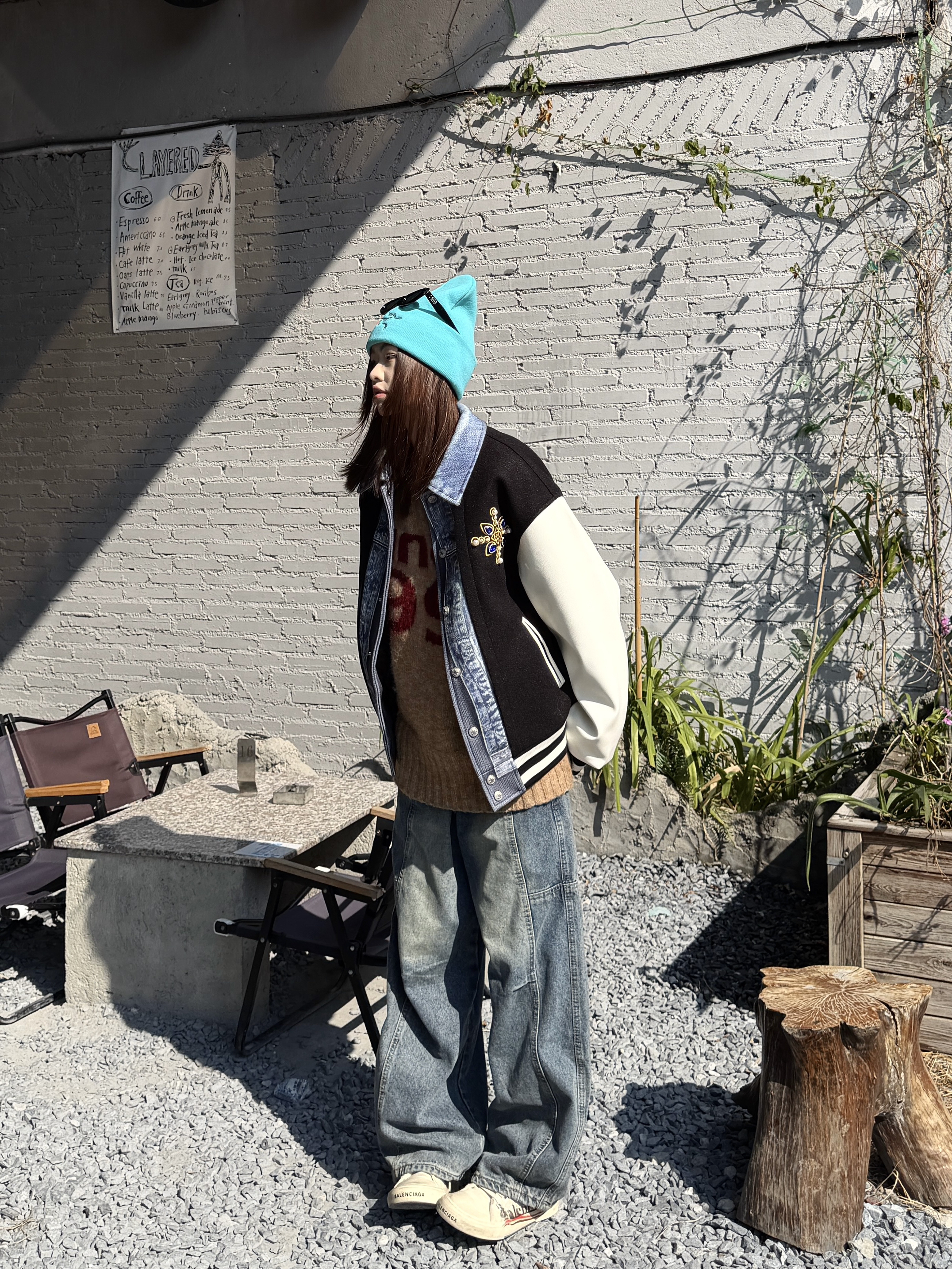 舒服的天气就要搭配舒服的look⛄️&👖 好适合穿棒球服的季节✌🏻 十字花环刺绣和牛仔拼接设计还是太帅了~ 随便套身上就有种松弛帅感 搭配宽松牛仔裤➕同色系冷帽🧶 懒人的邪修公式get✔️
