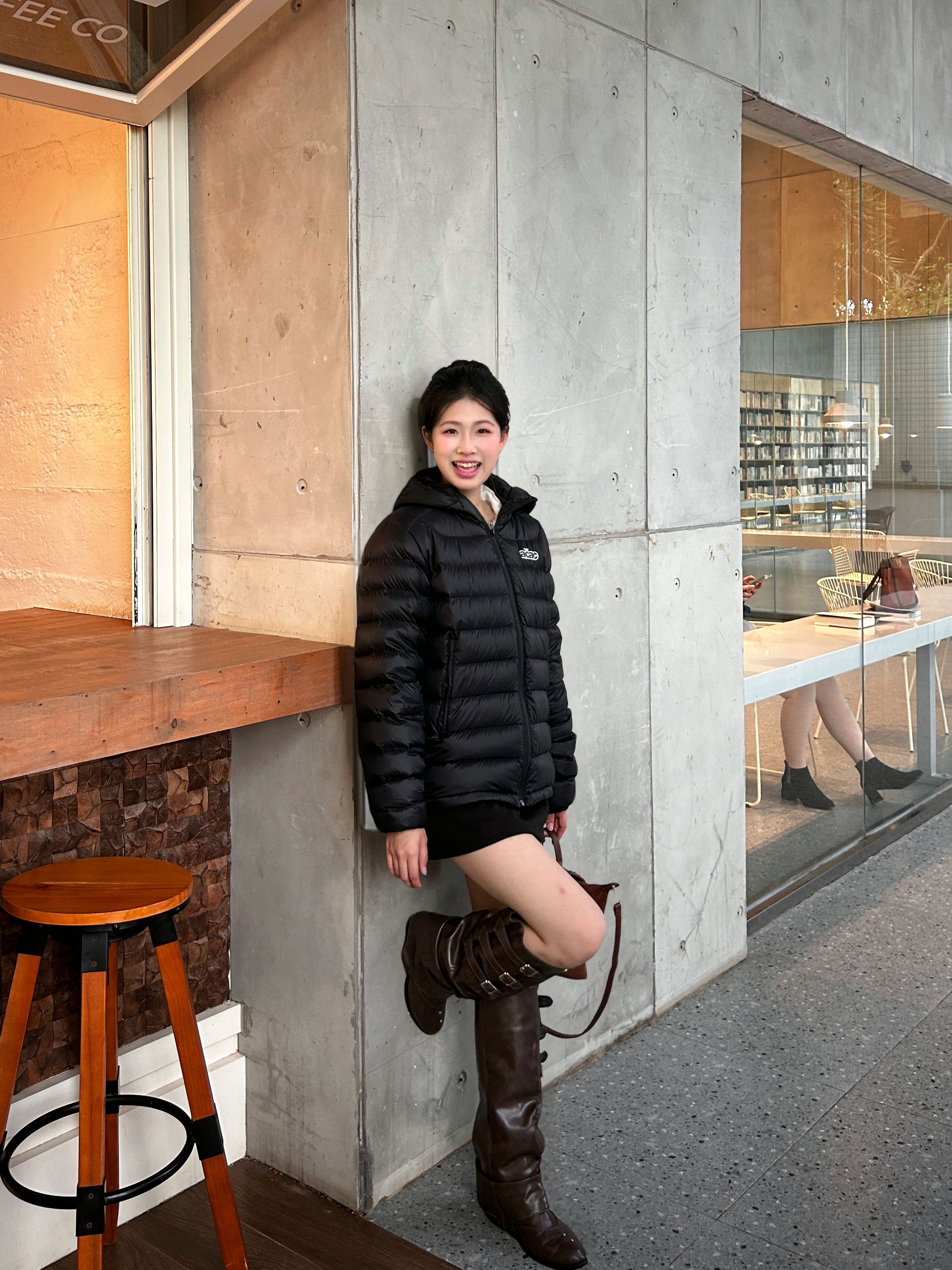 这身穿搭好会拿捏松弛感!黑羽绒服轻暖又利落,配短裙长靴甜酷刚好,日常出街随性又好看~#早八人冬日穿搭 #冬季约会穿搭ootd #咖啡馆拍照穿搭 #排骨风棉衣 #今日穿搭宝藏靴子分享