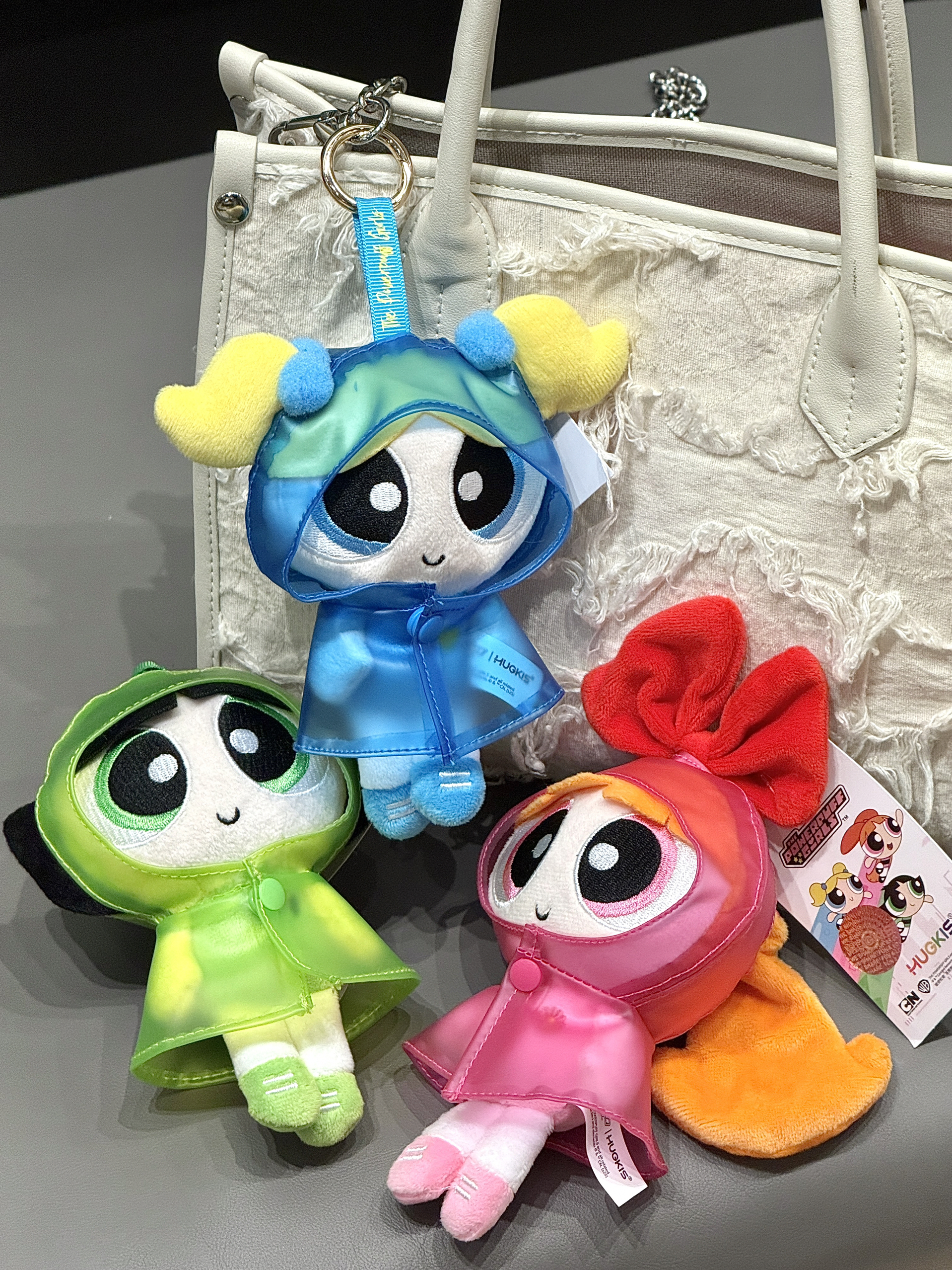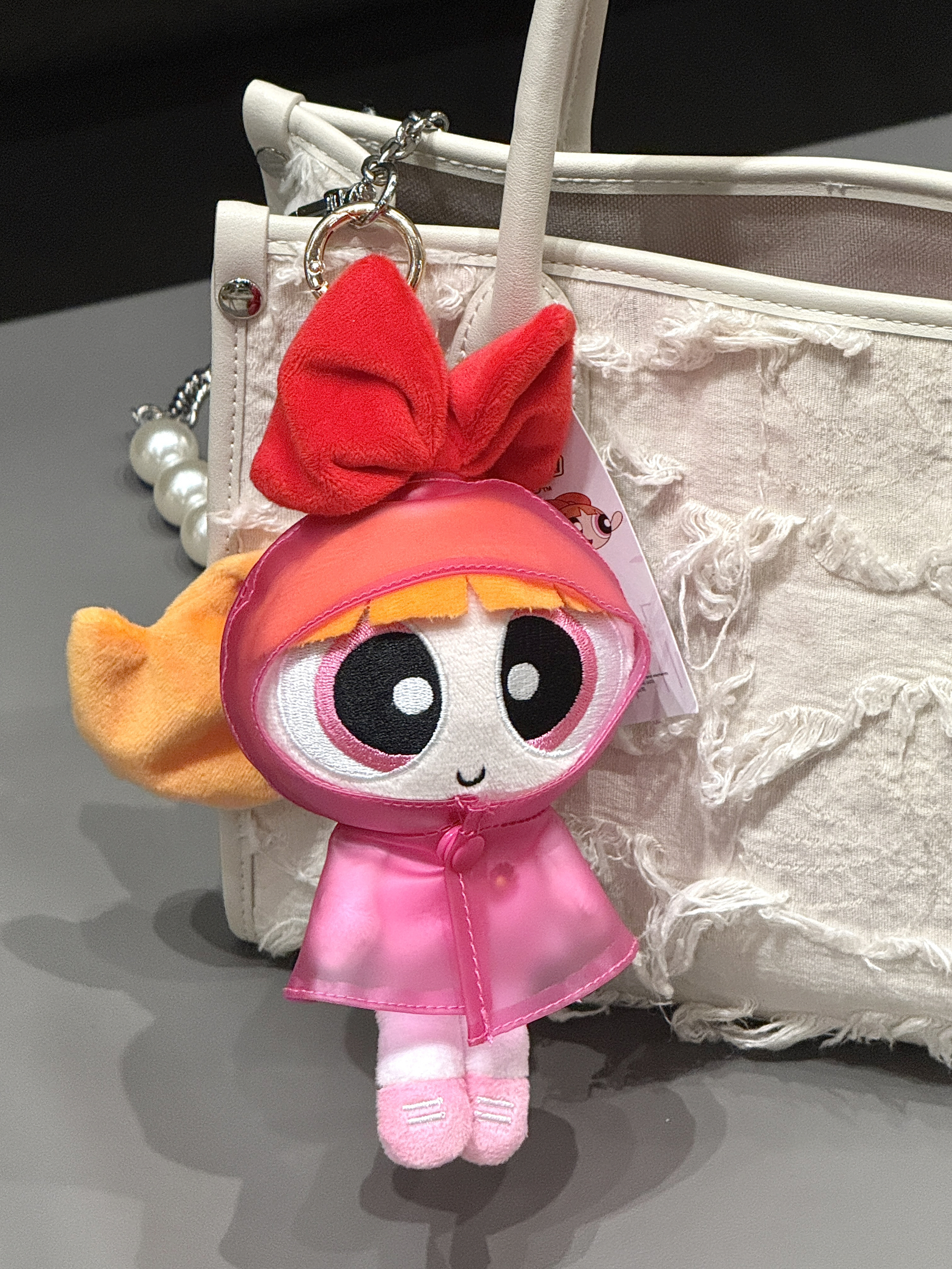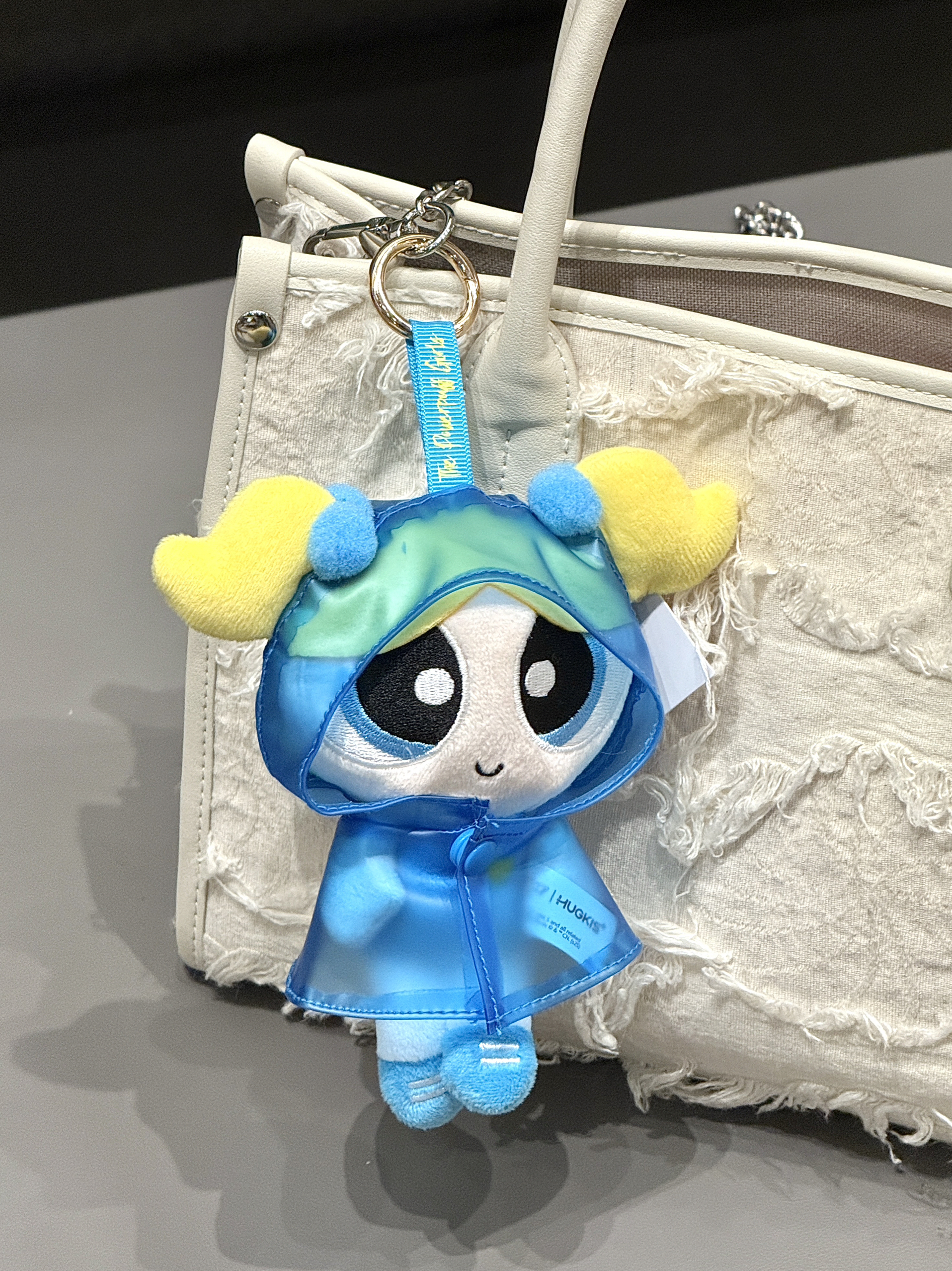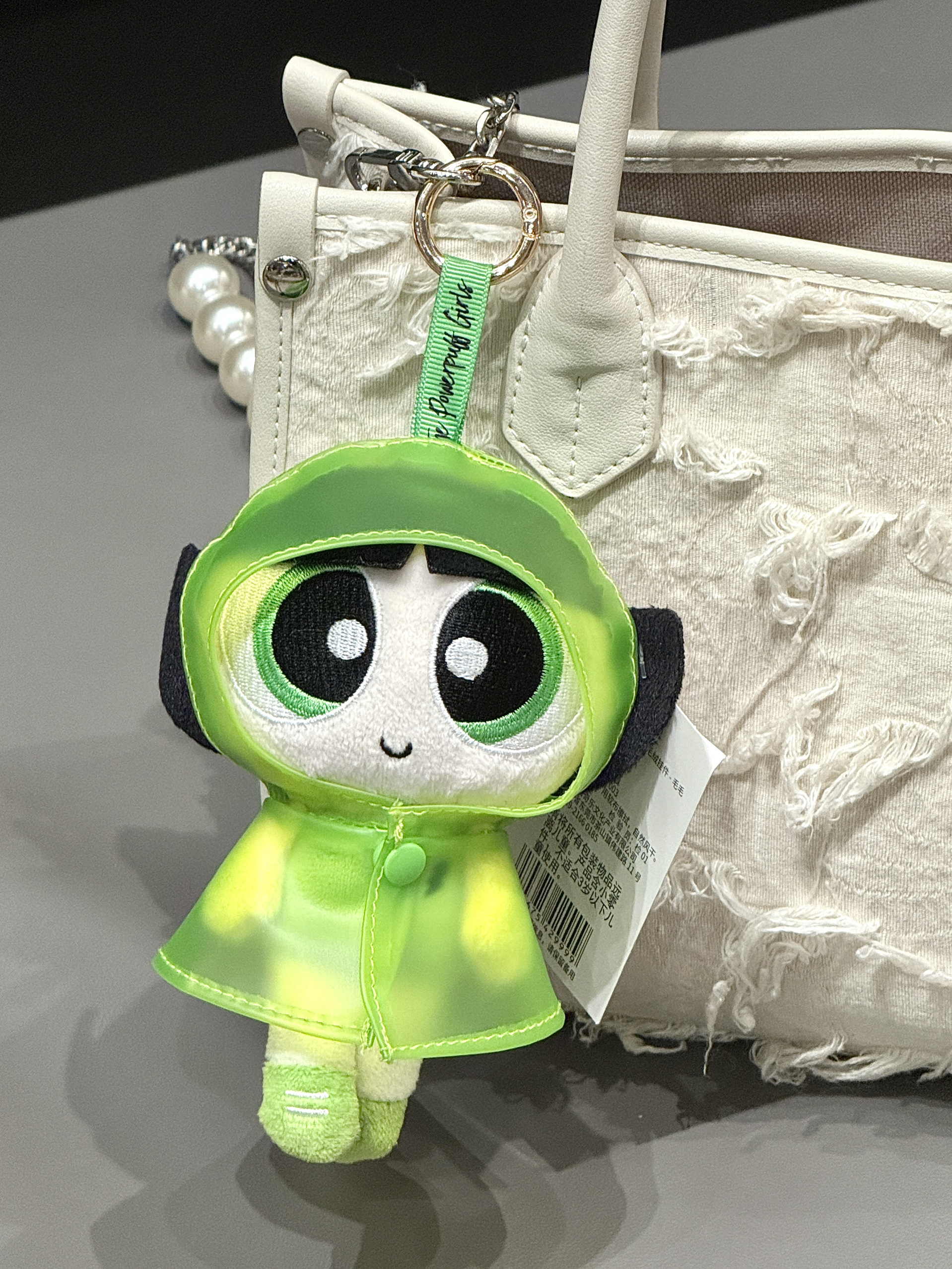 嘿嘿嘿是我童年喜欢的ip飞天小女警耶! 她们变成了我的挂件了hh 哈哈哈是三个蓝绿红多巴胺配色滴 她们还都穿着雨衣呢 我看着心情都晴朗了☀️ 三小只的造型都好还原~~~ 颜色很多巴胺哩 我觉得都蛮可爱的嘿嘿 今天挂我的新托特包上 我感觉带着她们出街好亮眼吸睛!泰阔爱了