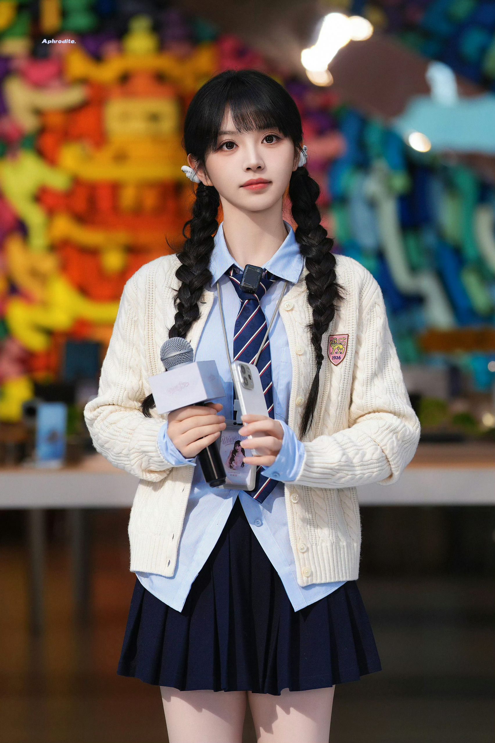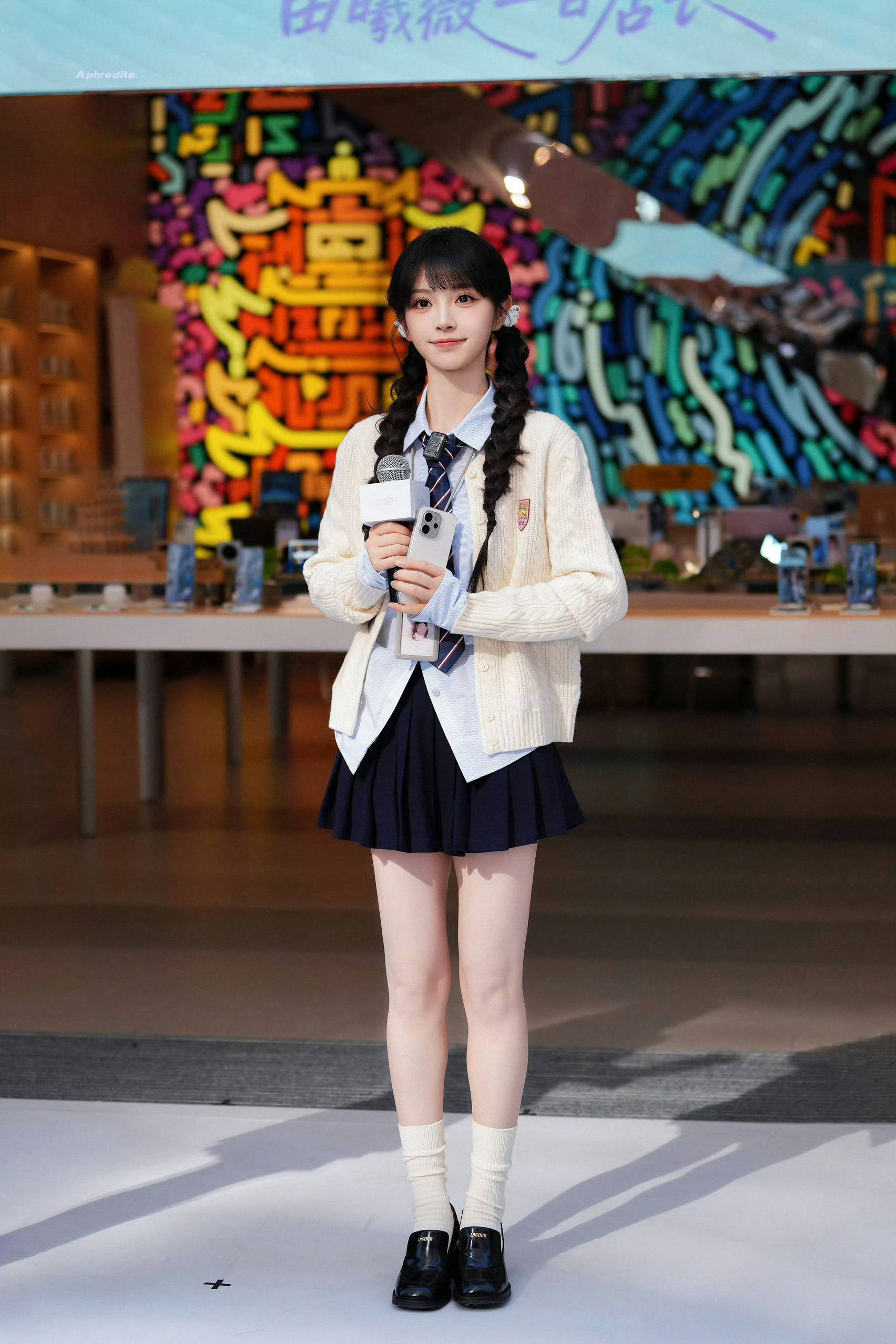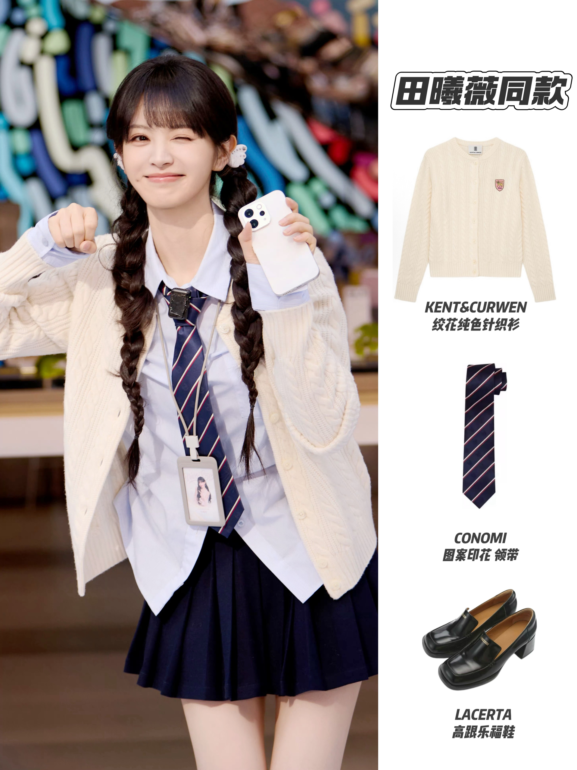 田曦薇vivo一日店长这套学院风穿搭清新又灵,元气值拉满~ 米白色绞花针织开衫温柔软糯,搭配浅蓝衬衫与条纹领带,经典校供感拉满;藏青百褶裙利落减龄,高跟乐福鞋又添一丝甜酷。整体配色干净柔和,单品组合将少女的元气与甜美完美融合,田曦薇的演绎更让这套搭配充满青春活力。