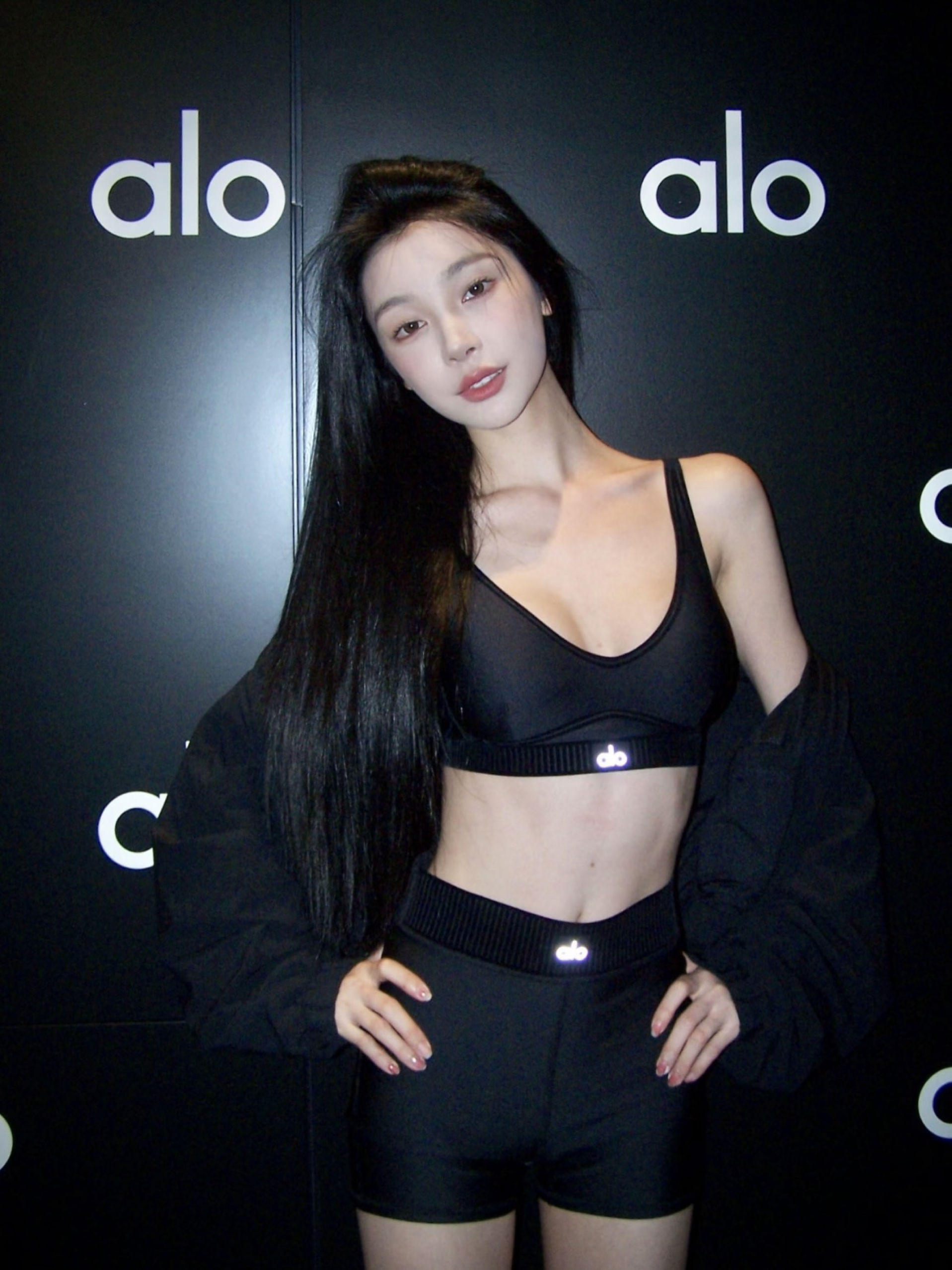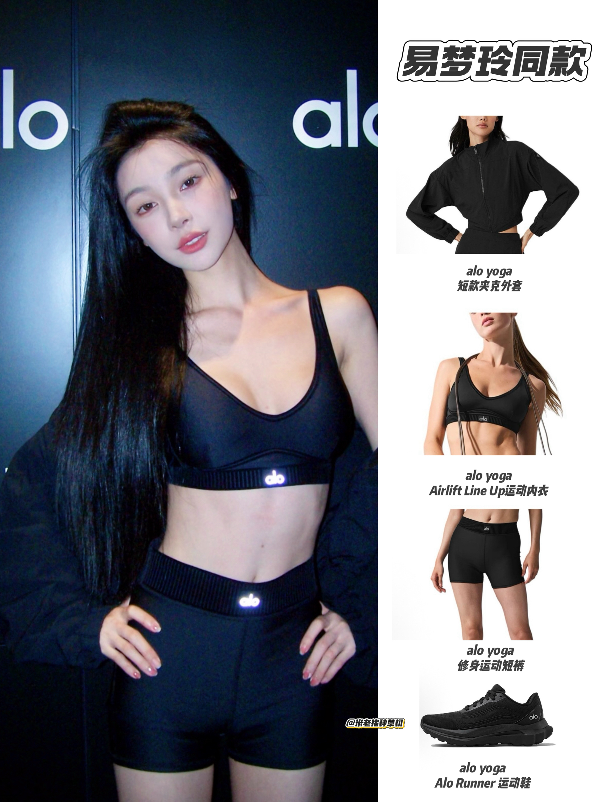 易梦玲参加alo活动这套all black运动穿搭极具时尚感与实用性 alo yoga的短款夹克、运动内衣搭配修身短裤,利落剪裁勾勒出身材线条,酷飒又性感。 运动内衣和短裤的功能性兼顾舒适,搭配同品牌运动鞋,将瑜伽风与街头潮流融合,整体造型简约却气场拉满。
