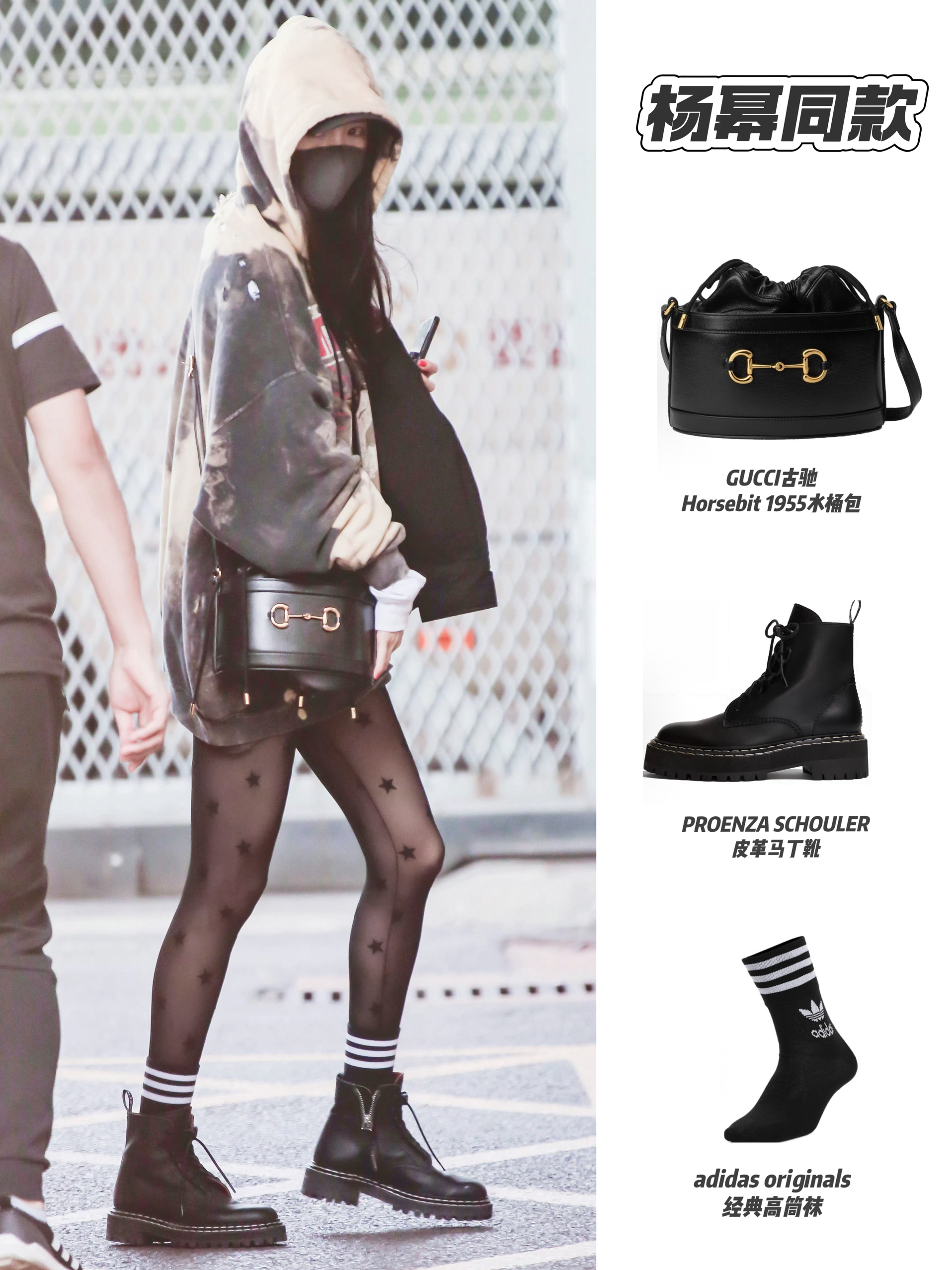 杨幂这套穿搭街头随性又不失高级感~ 扎染连帽卫衣宽松慵懒,星星黑丝添了点小俏皮。PROENZA SCHOULER的皮革马丁靴是点睛之笔,硬朗的皮质和厚底设计,让整体多了几分酷飒,和Gucci水桶包的精致感形成反差,时髦又有态度。