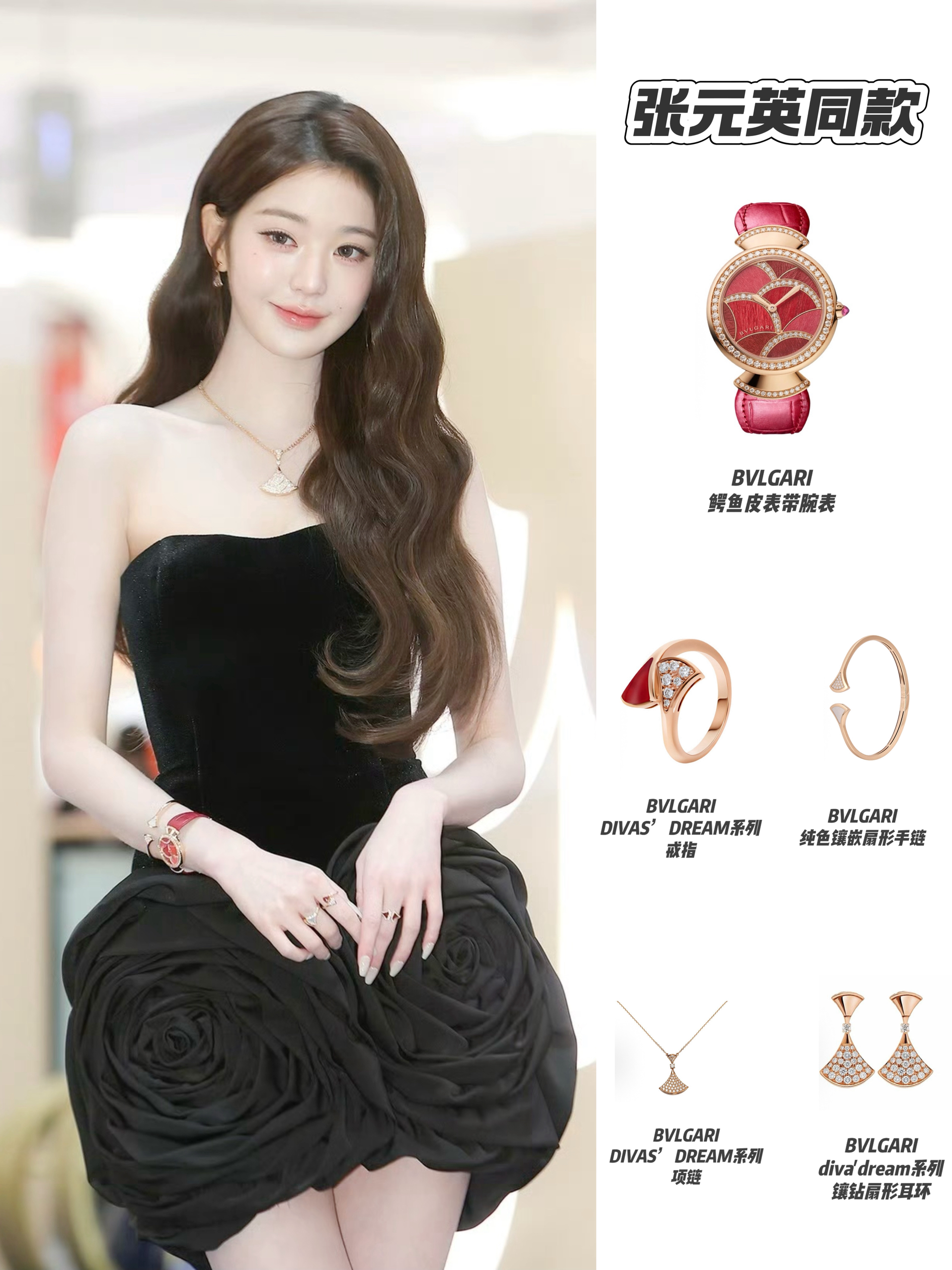 张元英出席宝格丽活动这套配饰把华丽和精致平衡得刚好~ 红色鳄鱼皮腕表是视觉焦点,暖金调带着贵气,戒指的红钻和手链的弧形设计呼应裙装的利落,项链与耳环的钻饰则给露背裙添了细碎的光,整套配饰没有抢过造型风头,反而让黑色礼裙多了优雅又明艳的贵气感。