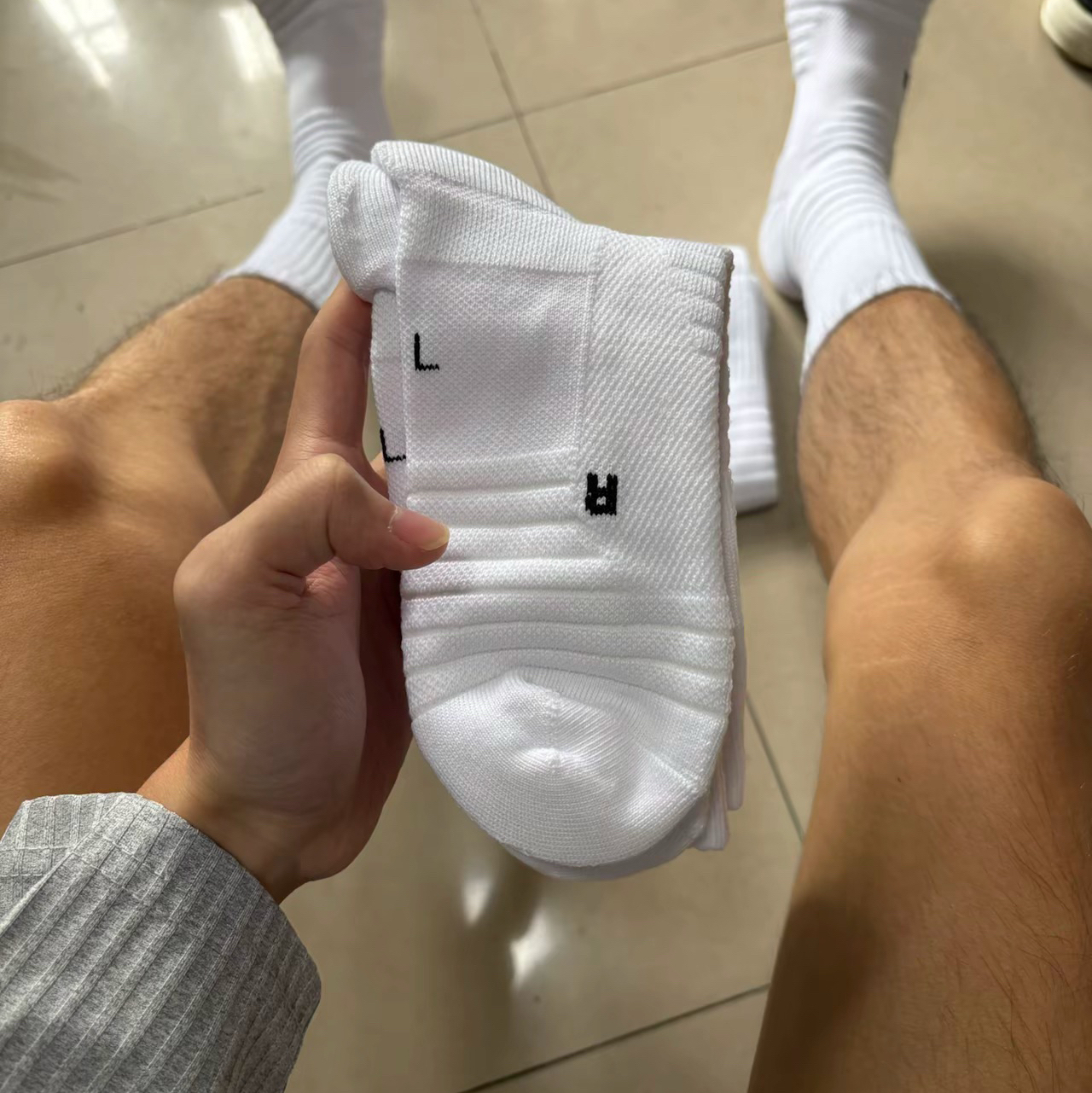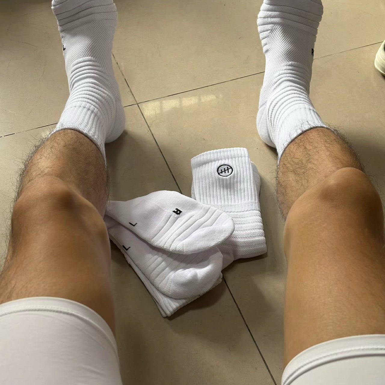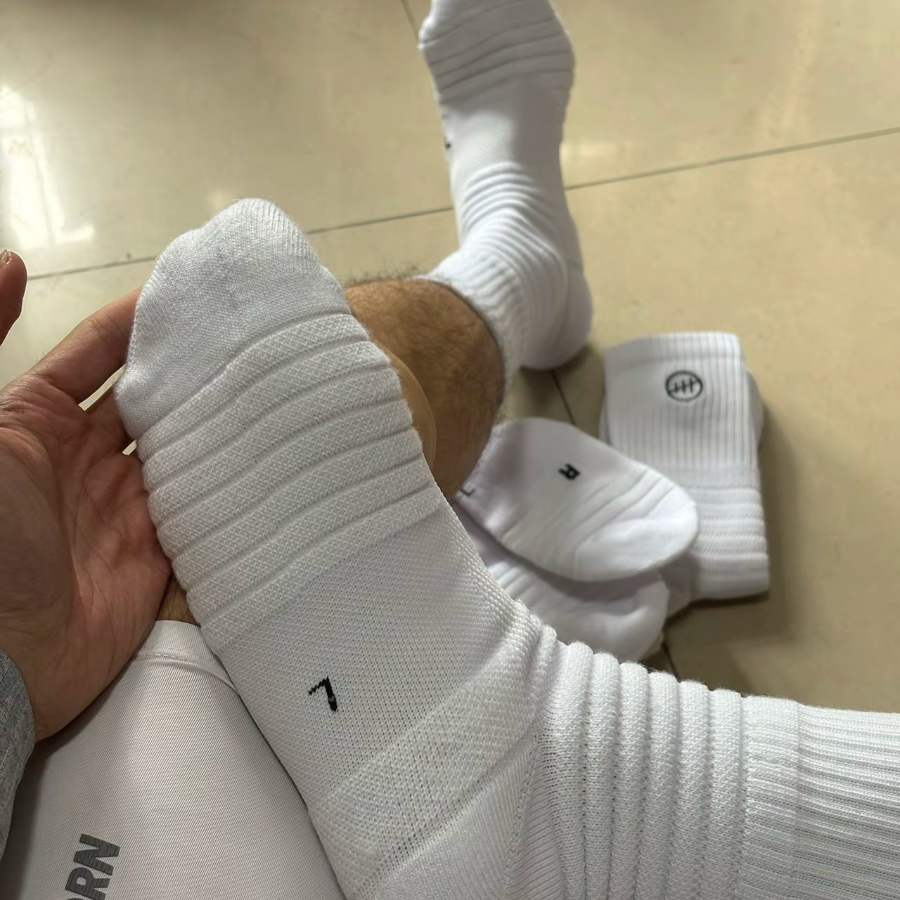 加厚的缓震区域,像脚后跟、前掌这些容易磨损和受力的地方都做了强化,打球的时候能有效缓冲落地冲击,减少脚部疲劳,就跟给脚穿了“减震弹簧”似的~😎 还有分区的压缩设计,能更好地贴合脚型,运动中牢牢锁住脚踝和小腿,防止晃动,变相突破的时候安全感拉满!🏀 袜子上的标识也很有特色,那个篮球图案的Logo,一看就很有运动感,搭配白色的简约风格,颜值在线,打球的时候穿出去绝对吸睛!👀 而且它的材质透气又...