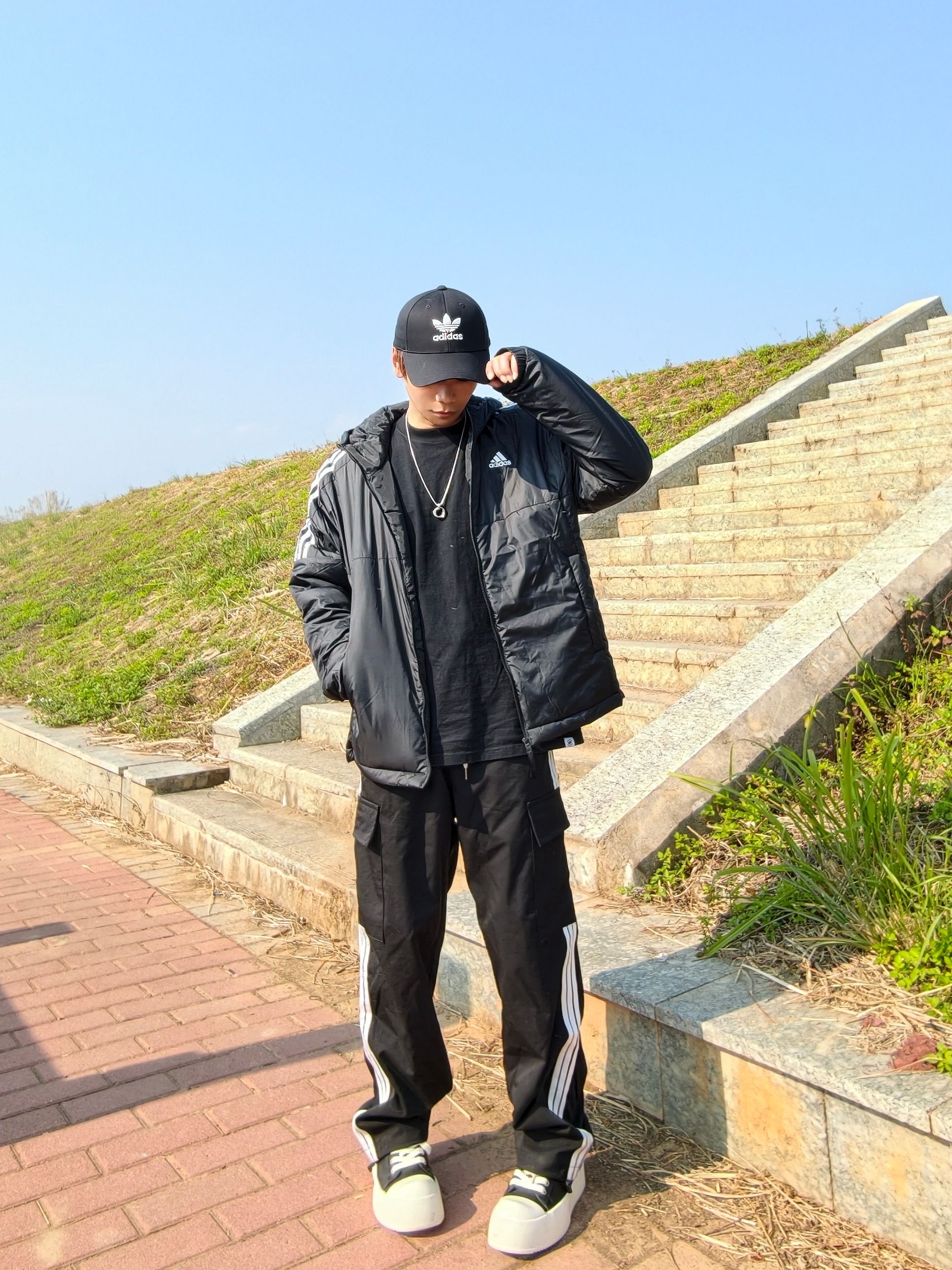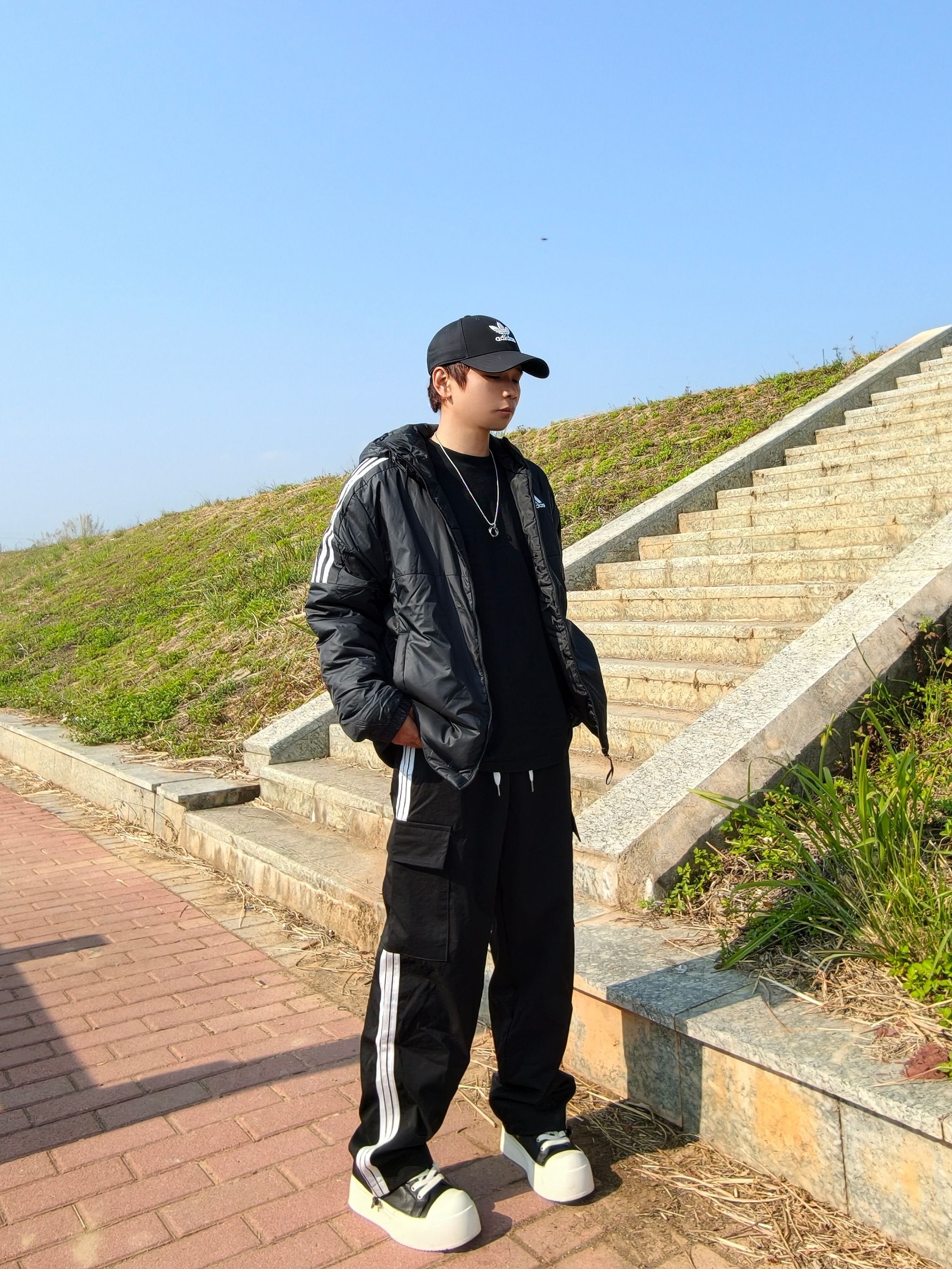 黑色系对于冬天是友好的 耐脏好穿不挑人适合男生 保暖的外套加个打底就好 简单的工装裤跟板鞋配上