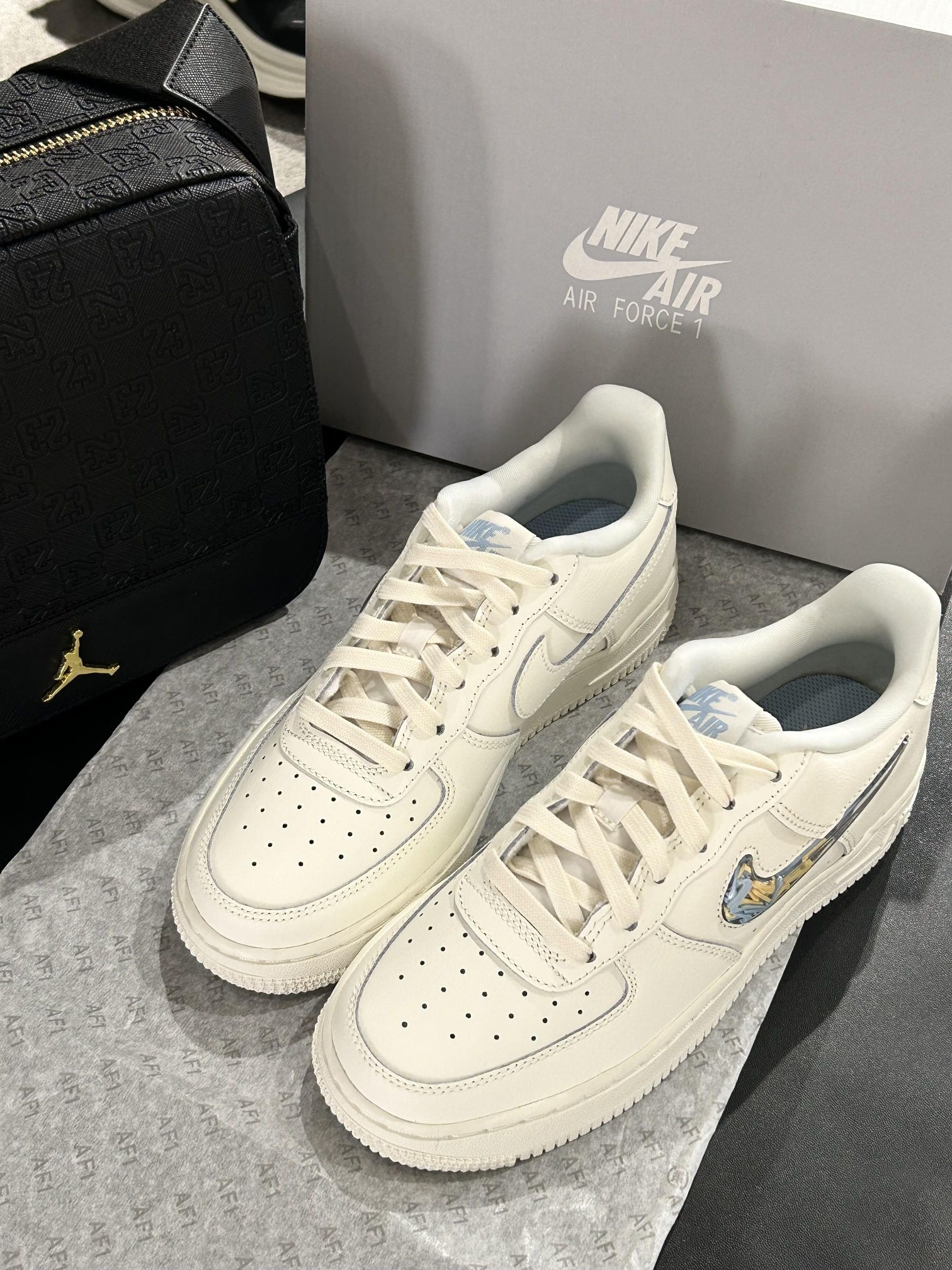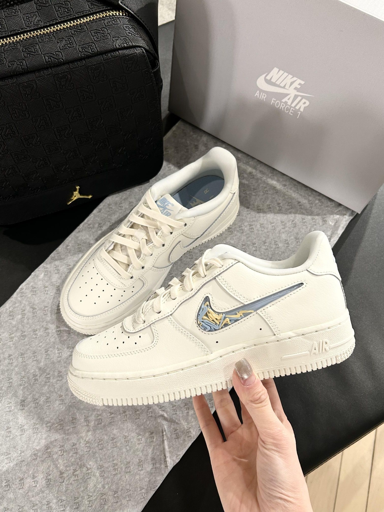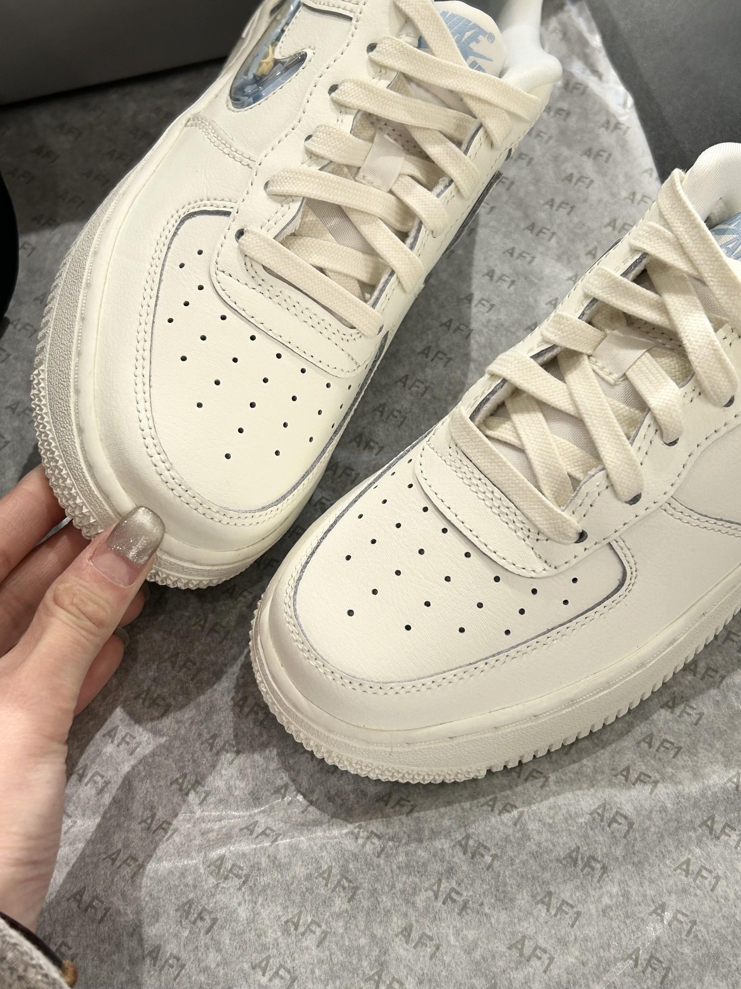 核心亮点 1. 艺术家联名巧思:奶白蓝温柔配色适配冬日氛围,标志性气泡钩内置可移动小勾,搭配镭射质感Swoosh,玩趣设计戳中细节控。 2. 甜酷百搭属性:经典AF1鞋型不挑穿搭,搭配小熊T恤甜酷感拉满,日常出街、约会通勤都吸睛,回头率直接拉满。 3. 颜值质感双优:纯白鞋身干净耐看,镭射元素增添潮酷感,温柔与个性完美平衡,是冬日鞋柜的宝藏款。 上脚感受 上脚直接被奶白蓝的温柔拿...