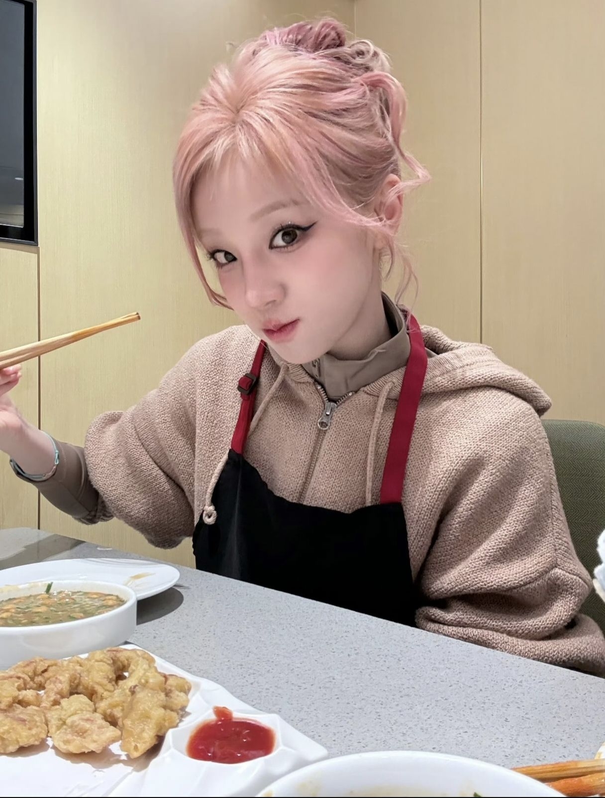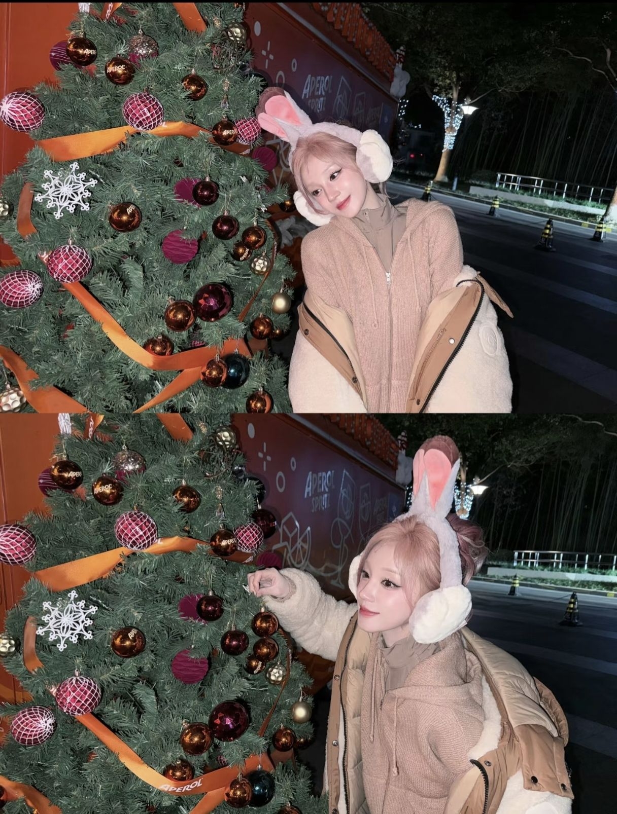 宋雨琦 卡其拼色羽绒服+连帽毛衣 穿同色系内搭+迷彩牛仔裤 再配上朱迪耳罩 像一只软萌小兔子可爱😍 暖棕调撞色自带松弛感日常出街/夜逛都适配~