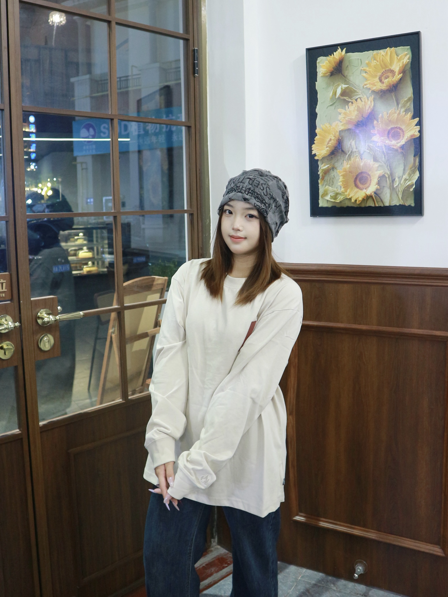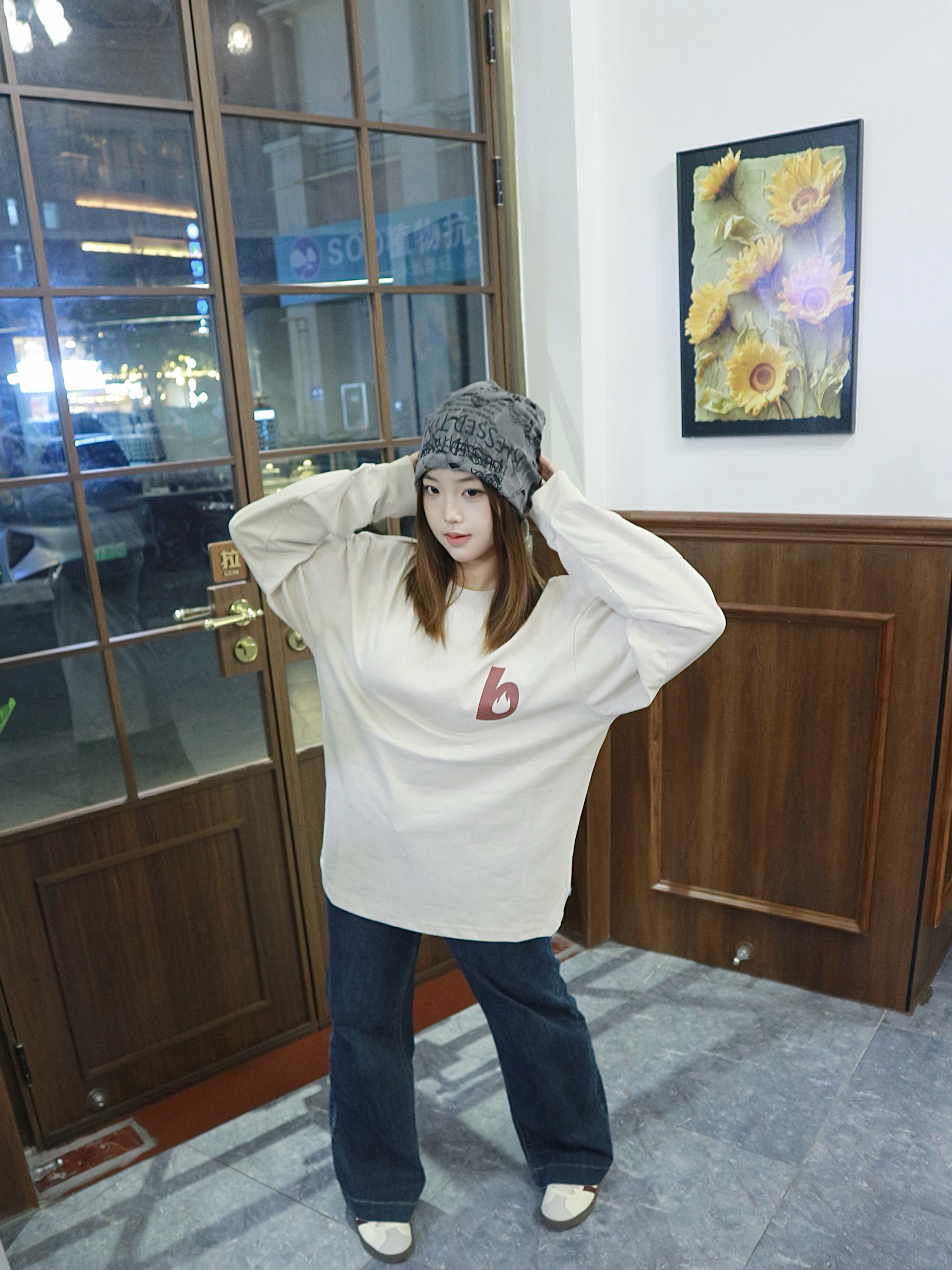 这件米白tee看着简单但超耐看! 面料是透气的棉料 软fufu的贴身穿超舒服 版型宽松落肩 红字母印花恰到好处 穿起来超有范儿呀~