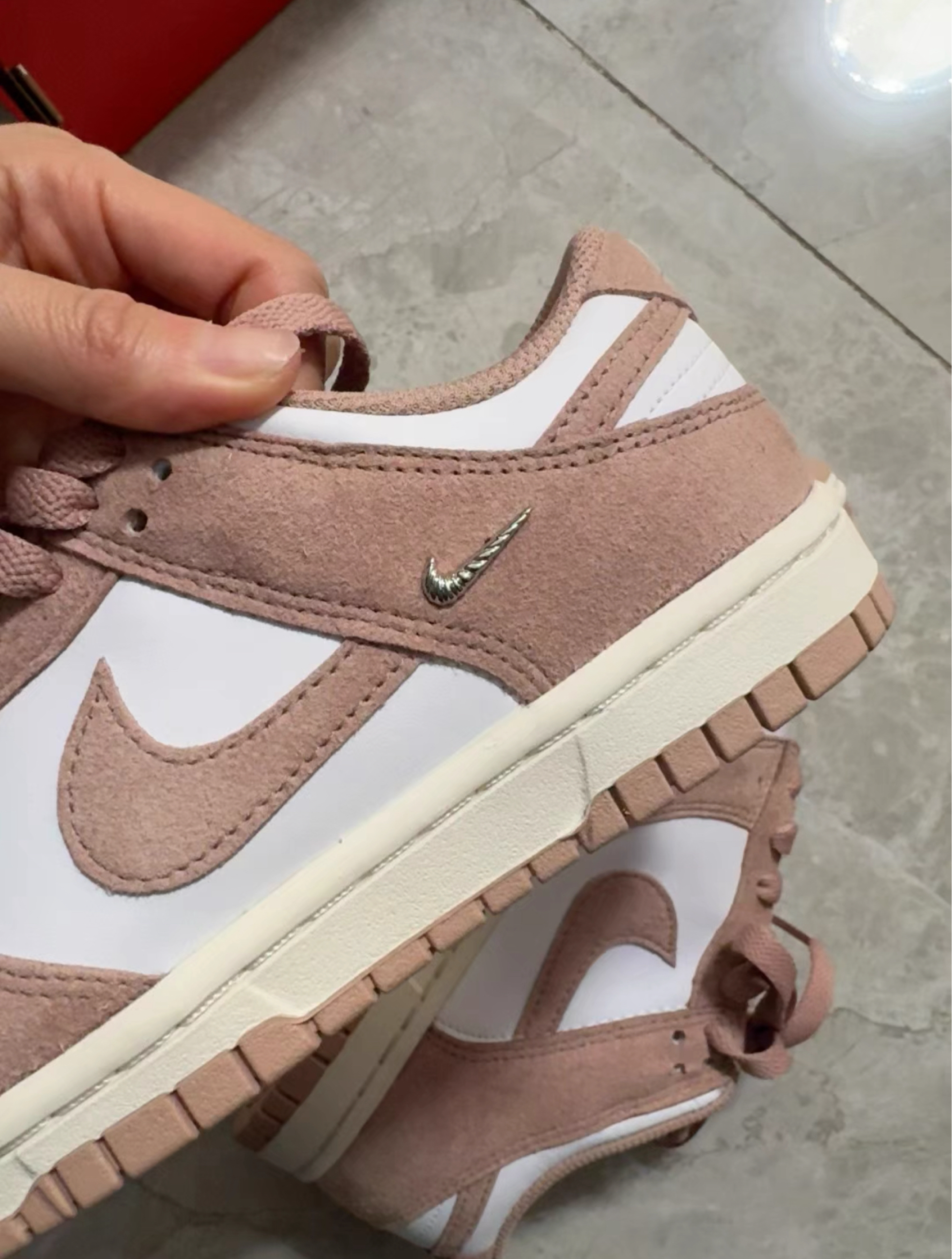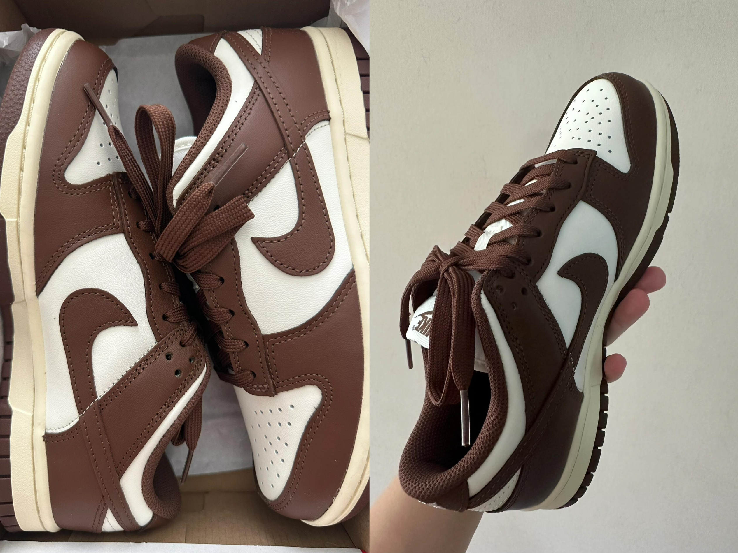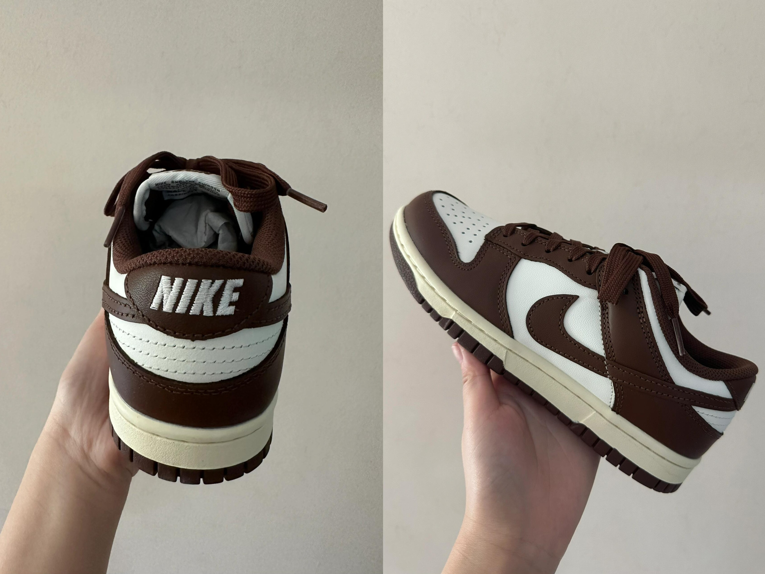 新入的Nike Dunk棕白配色真的长在我的审美上🍂 焦糖棕拼米白,满满的秋日氛围感,皮质摸起来很细腻,鞋型也很显瘦,搭卫衣、牛仔裤都超适配。上脚的包裹感不错,走路也舒服 棕色皮质容易留划痕,得小心保护,不过为了这个颜值,这点小问题完全能接受!