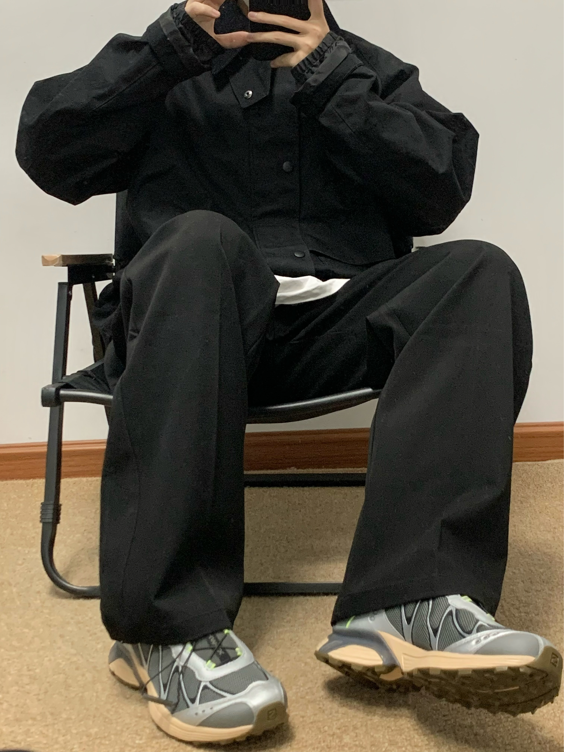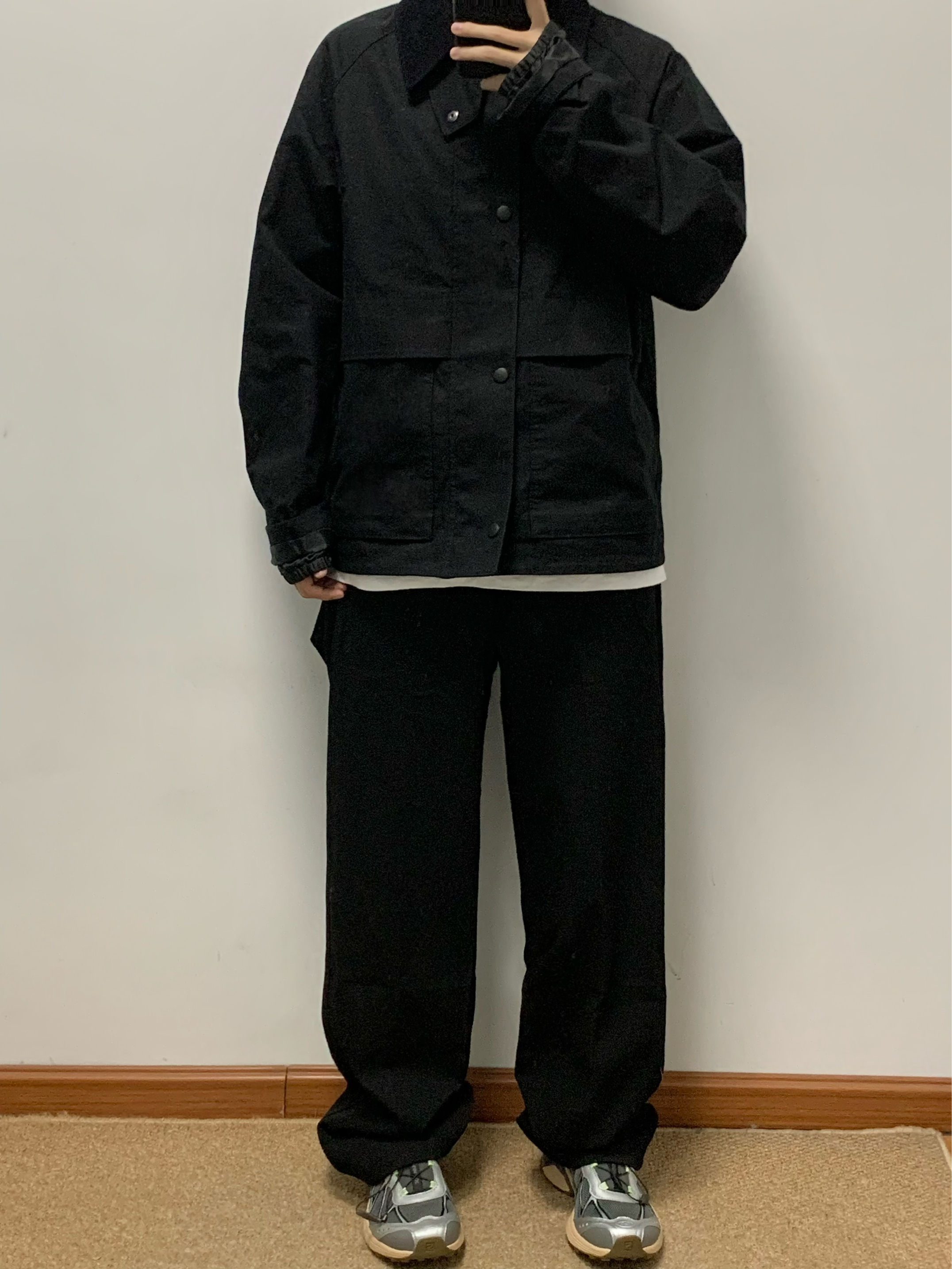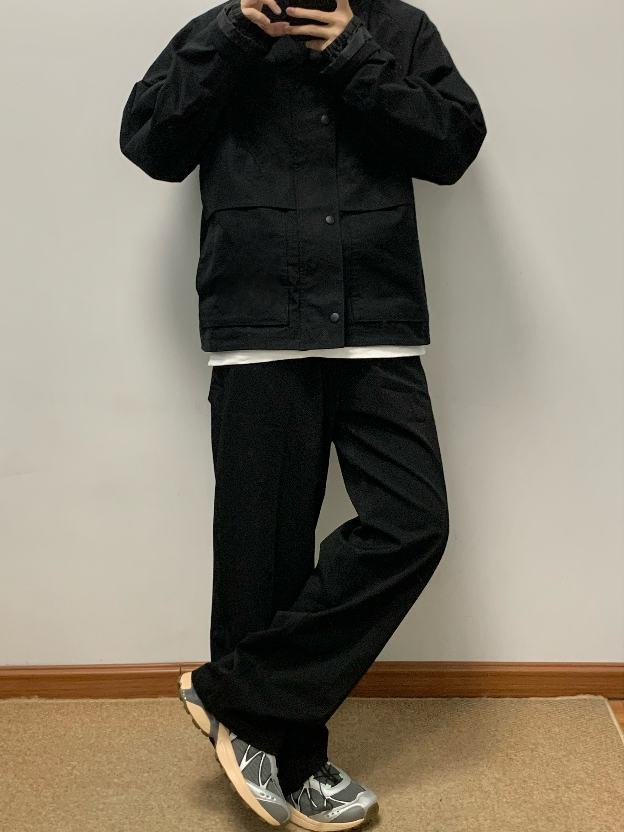 黑色夹克搭配黑色西装裤 帅酷拿捏 腰上自带腰带 方便调节腰围 宽松直筒的版型 松弛感十足 西装裤的面料 上身很有质感 秋日出游就穿这一身 包帅的! 👖:WILD LEADER