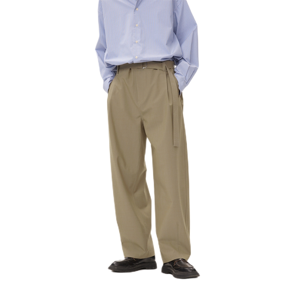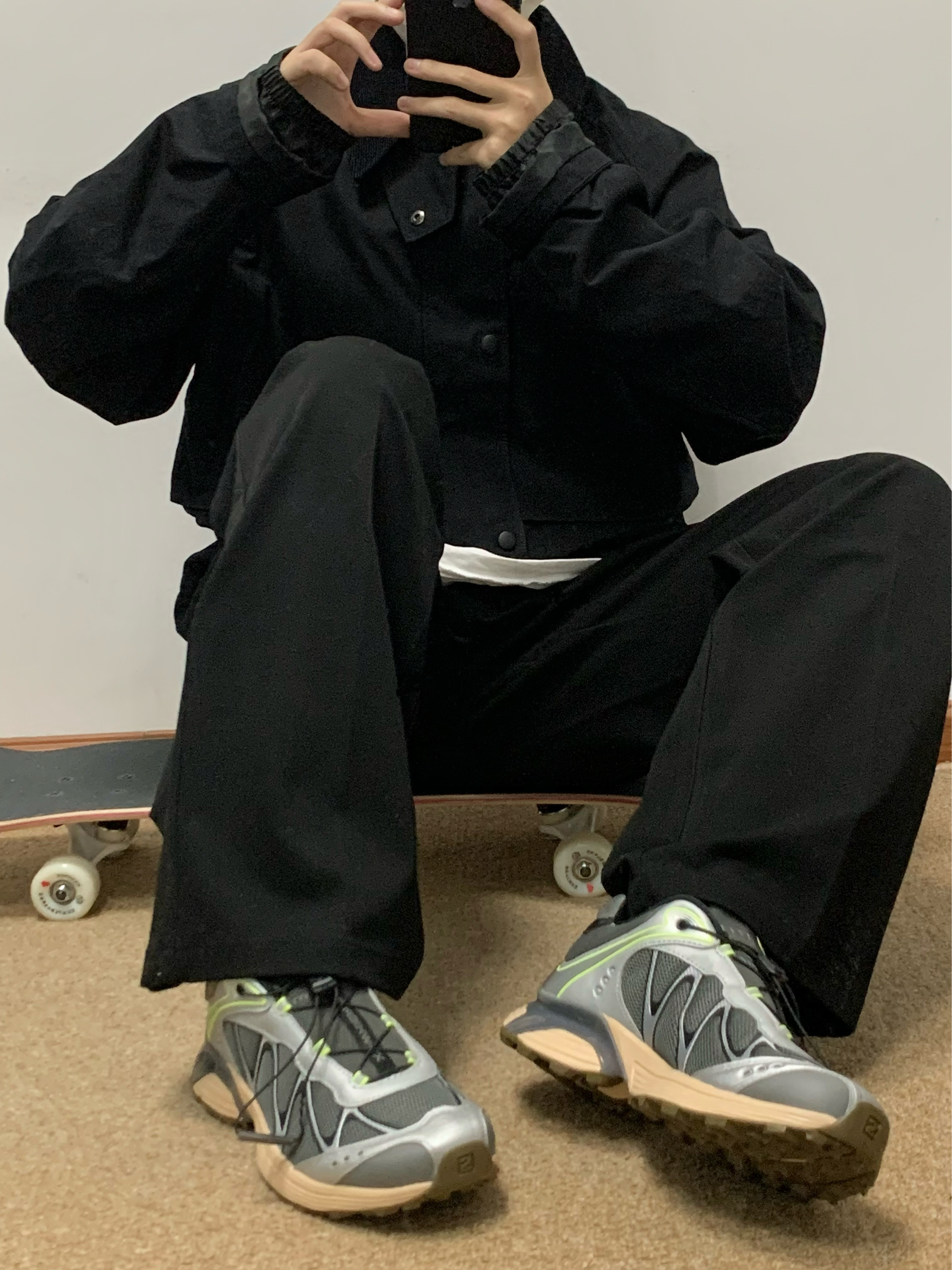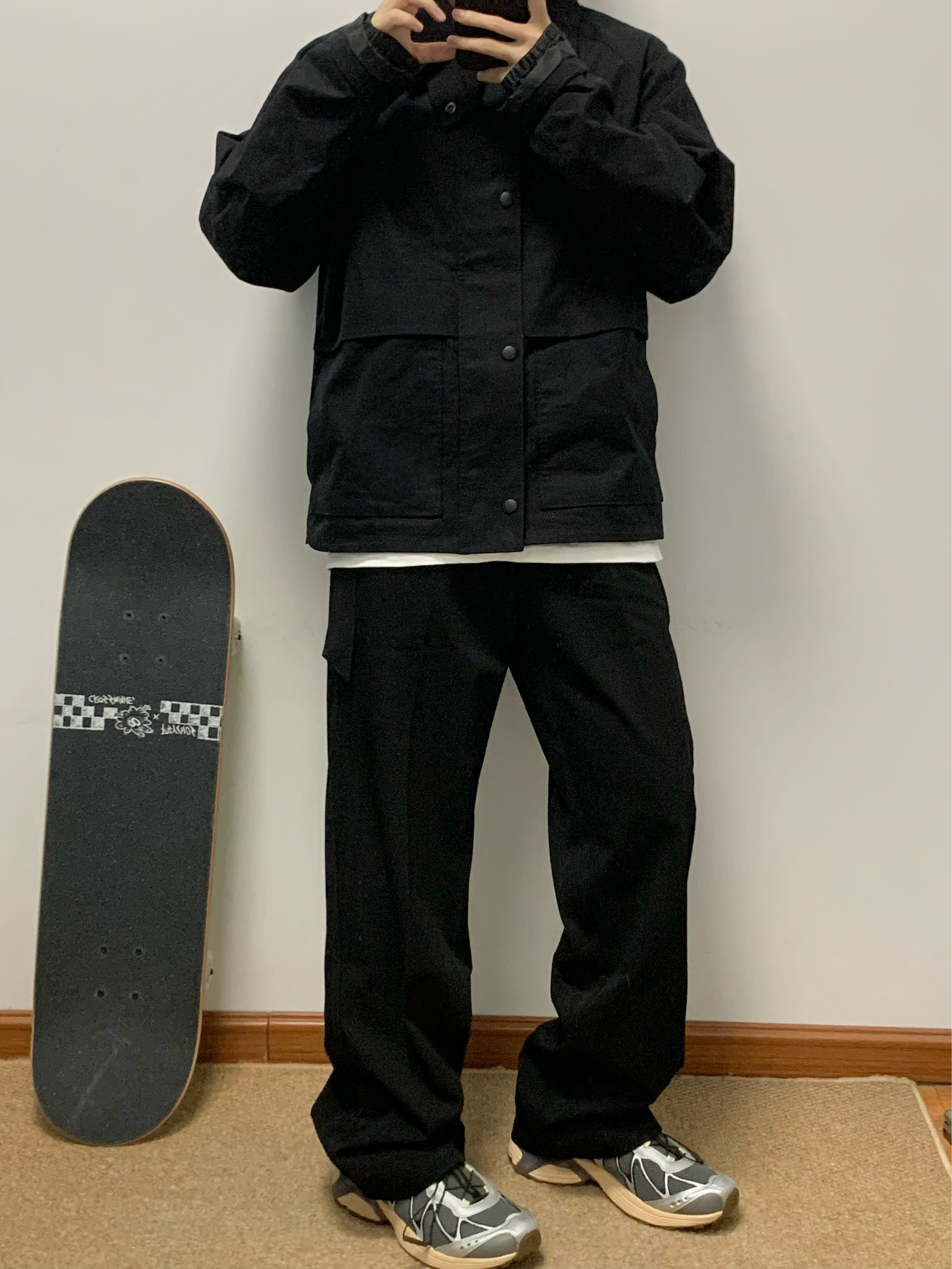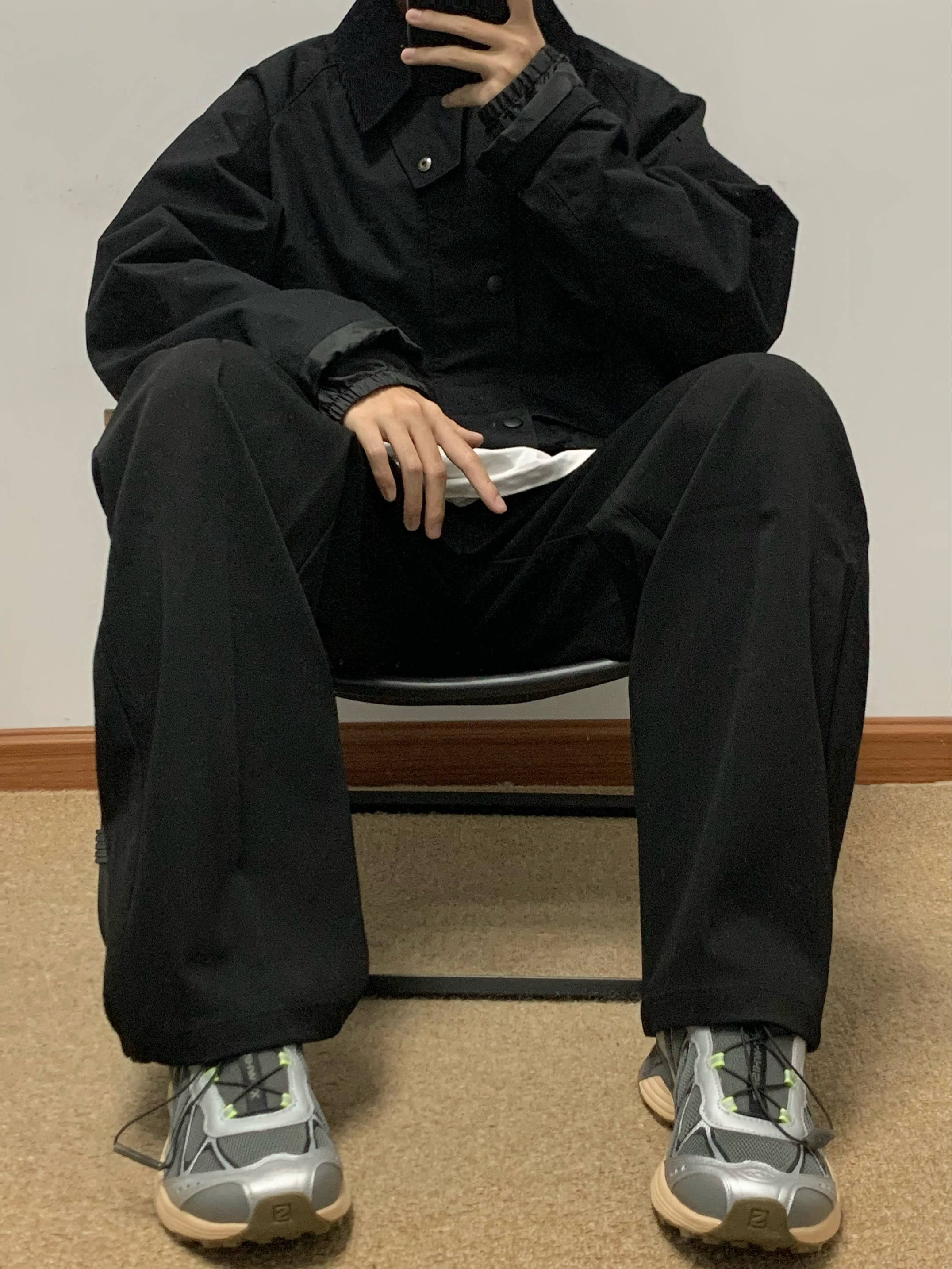 黑色夹克搭配黑色西装裤 帅酷拿捏 腰上自带腰带 方便调节腰围 宽松直筒的版型 松弛感十足 西装裤的面料 上身很有质感 秋日出游就穿这一身 包帅的! 👖:WILD LEADER