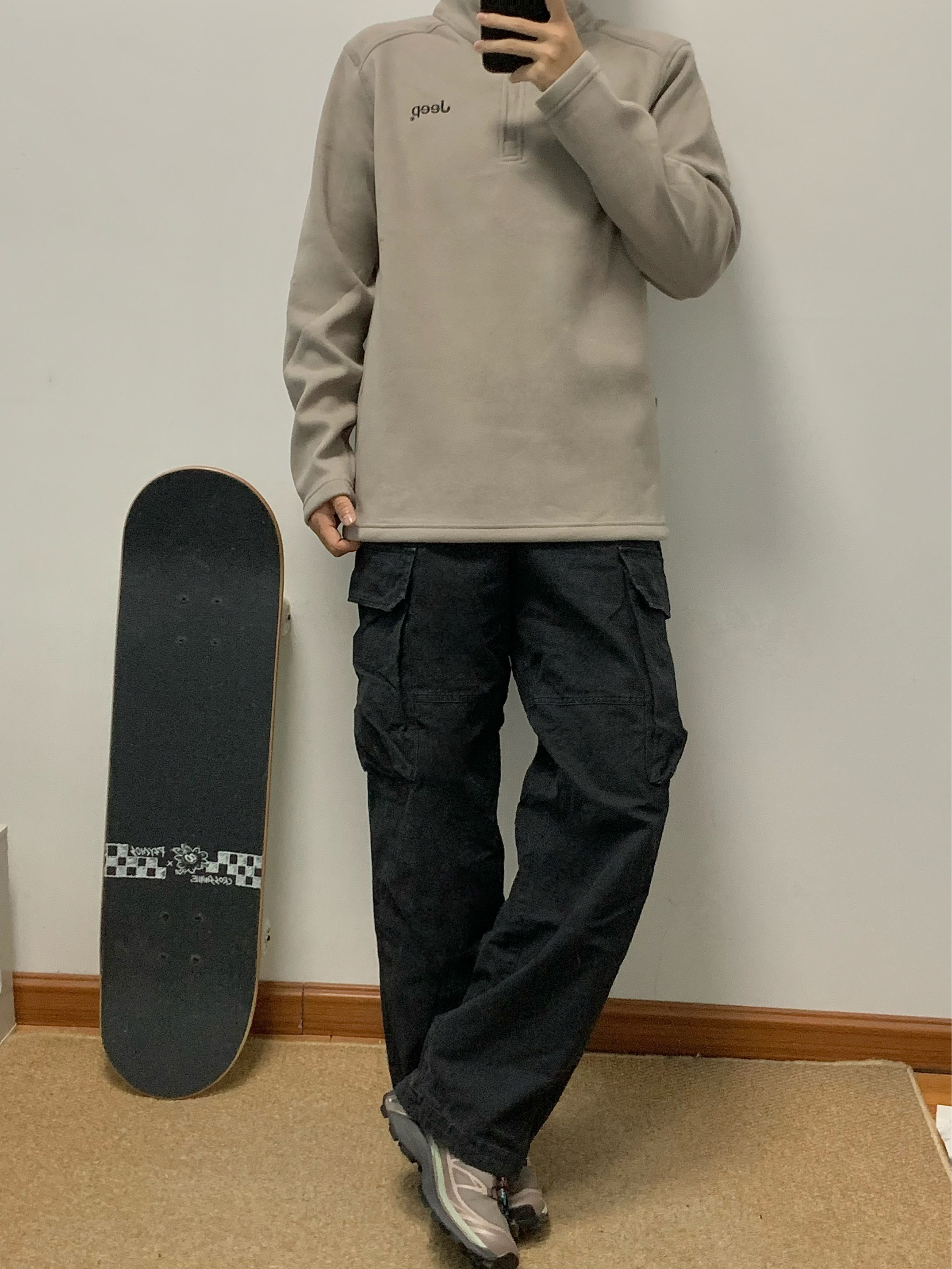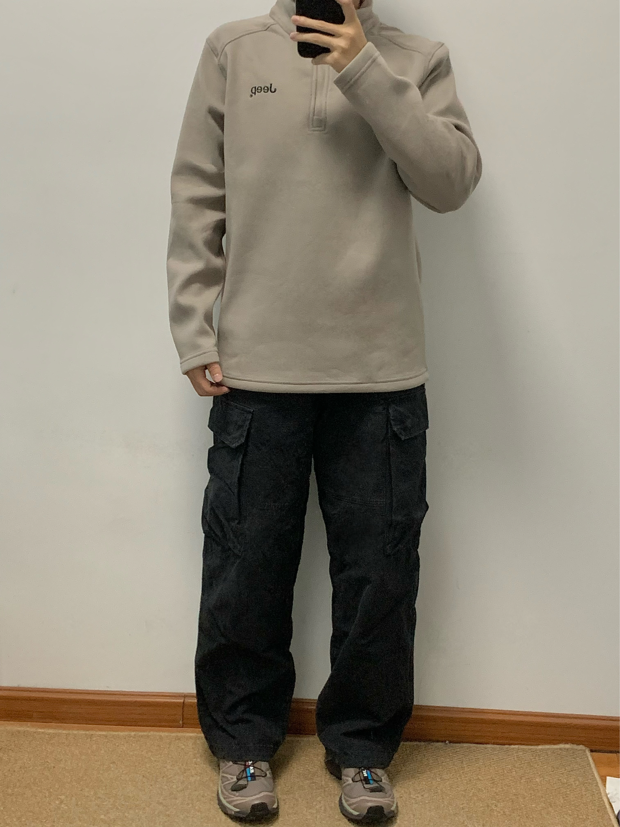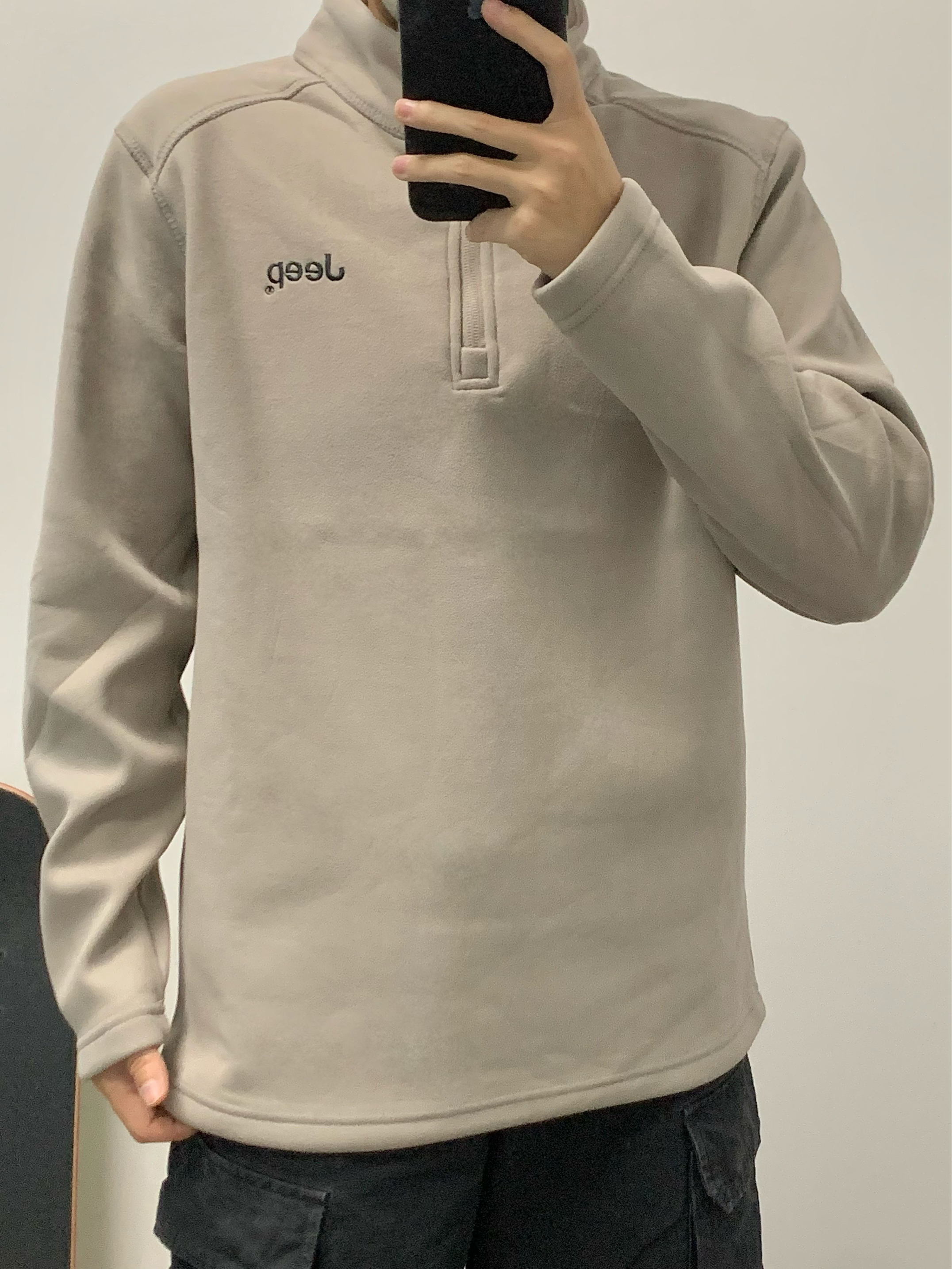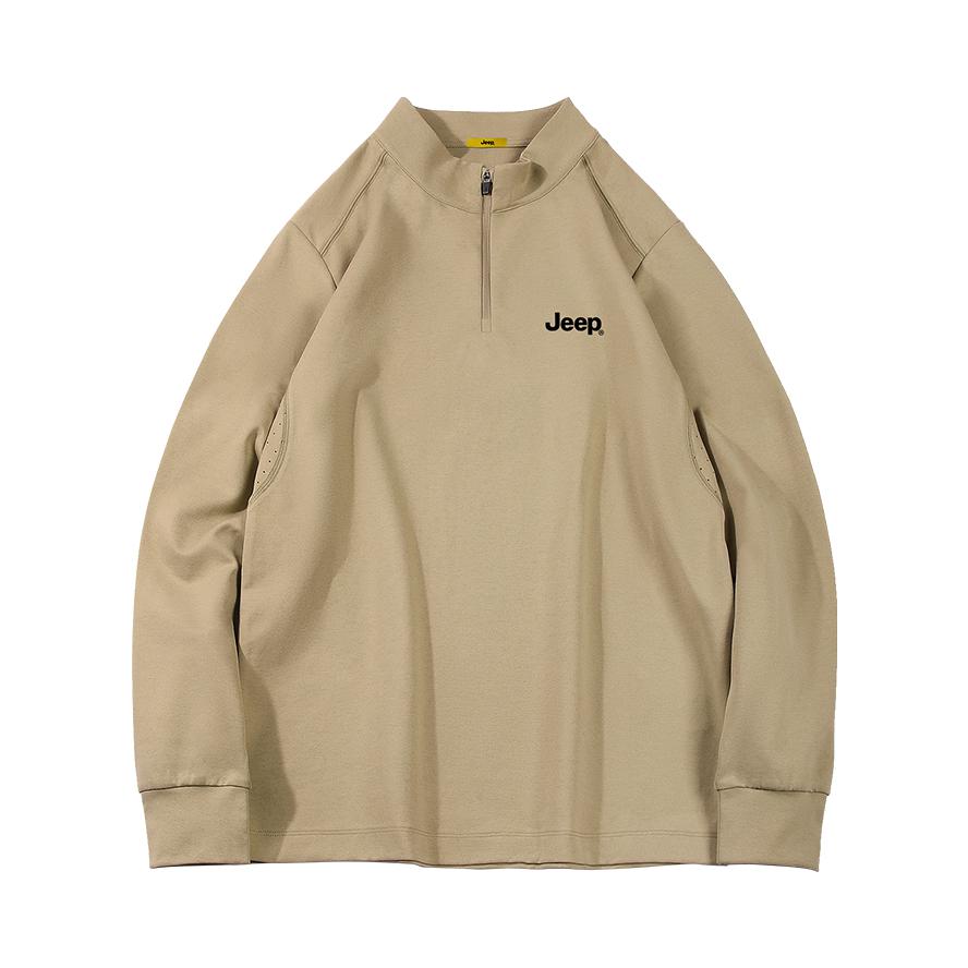杏色长袖T搭配黑色工装裤 帅酷拿捏 重磅德绒材质 贴身穿也很舒服 胸前一个品牌logo刺绣设计 简约百搭 无论是日常通勤还是户外穿都可 入秋就穿这一身 包帅的! 👔:Jeep