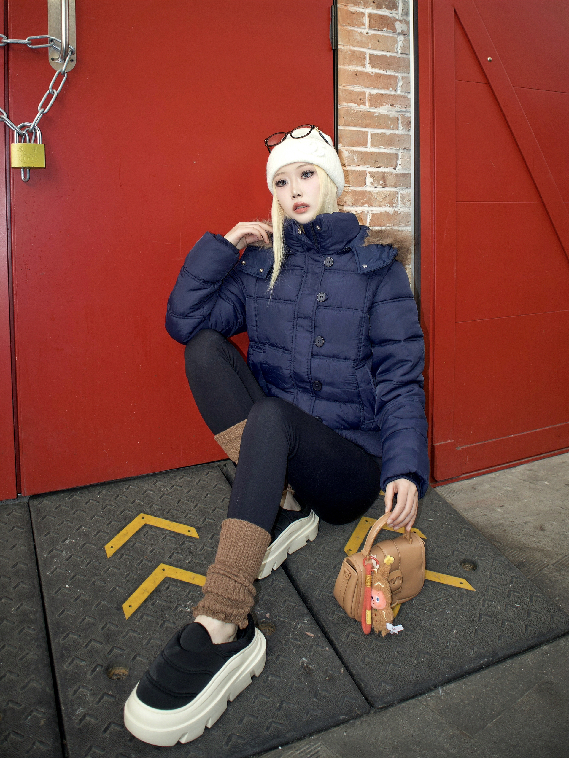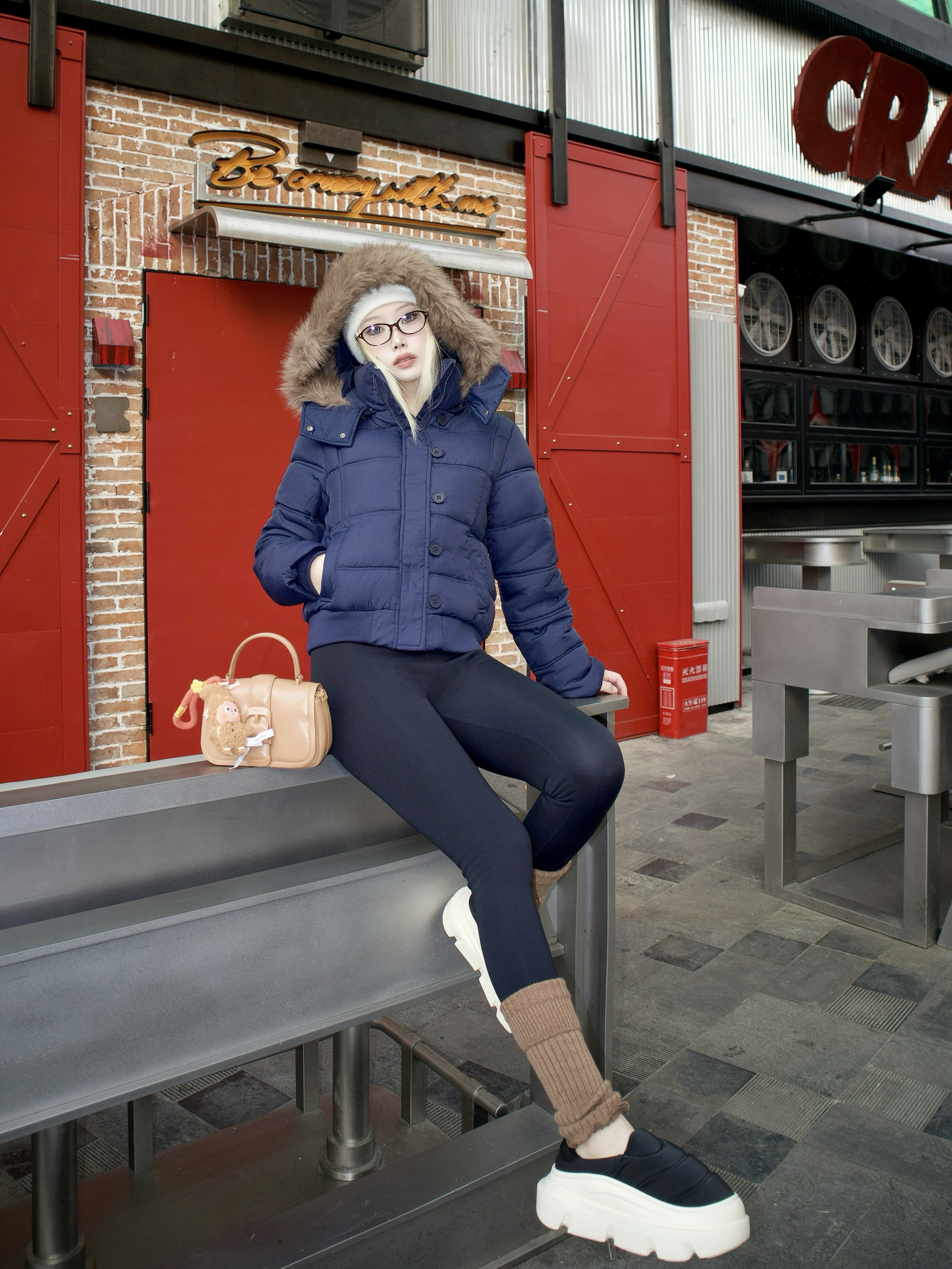 藏青短棉服妥妥菲奥娜同款 大毛领拆了像夹克 装上秒变冬日战袍 短款厚实 拉链一拉直接裹成安全感本人 🦈黑色鲨鱼裤负责稳住全身 棕色堆堆袜往上一拉 脚踝立刻有了灵魂护盾🧦 这双厚底棉拖!外穿设计直接打破次元壁 加绒内里像踩进热可可 配棕色手提包一整个和谐住 出门倒垃圾都像在拍生活杂志👜