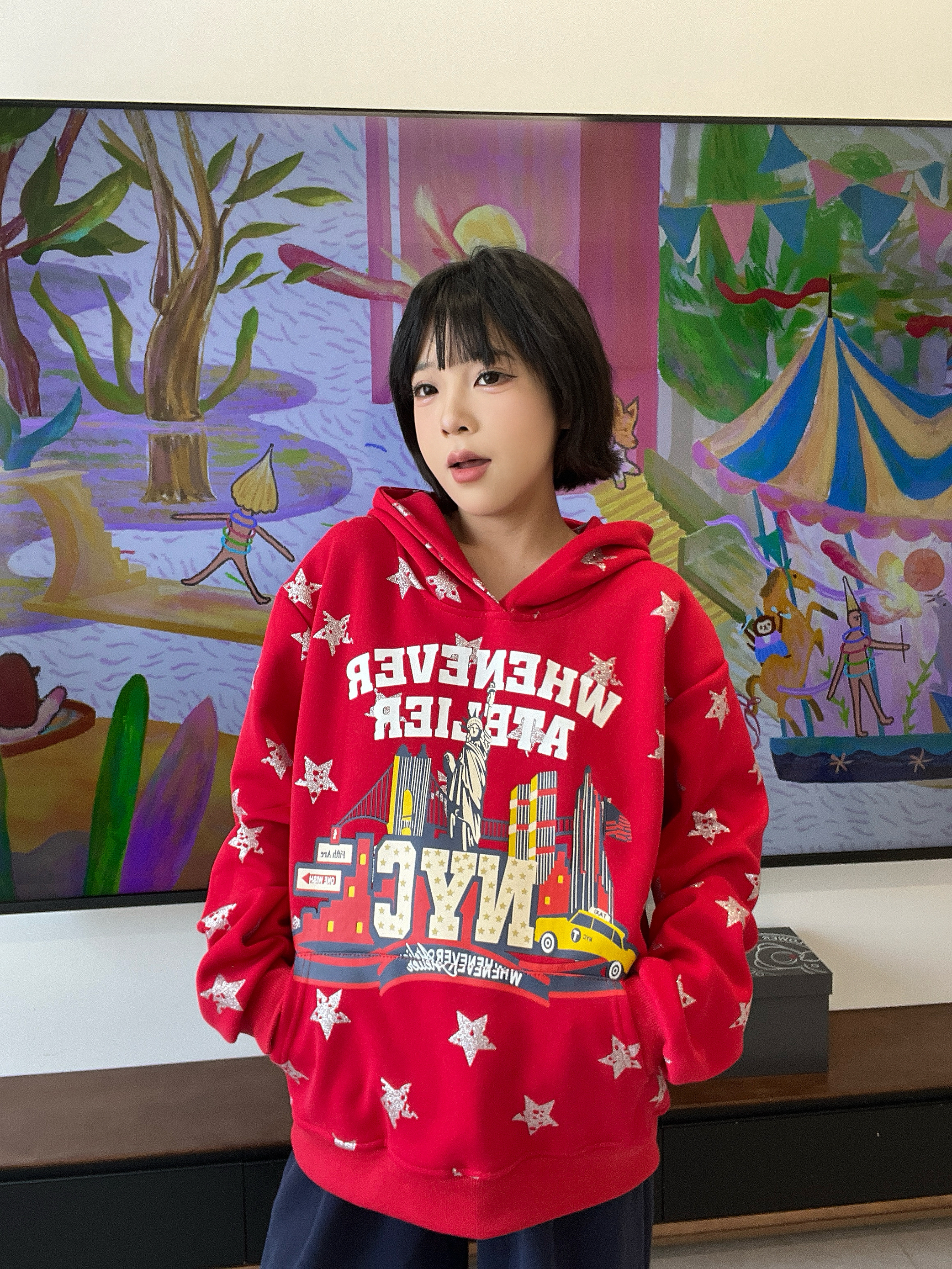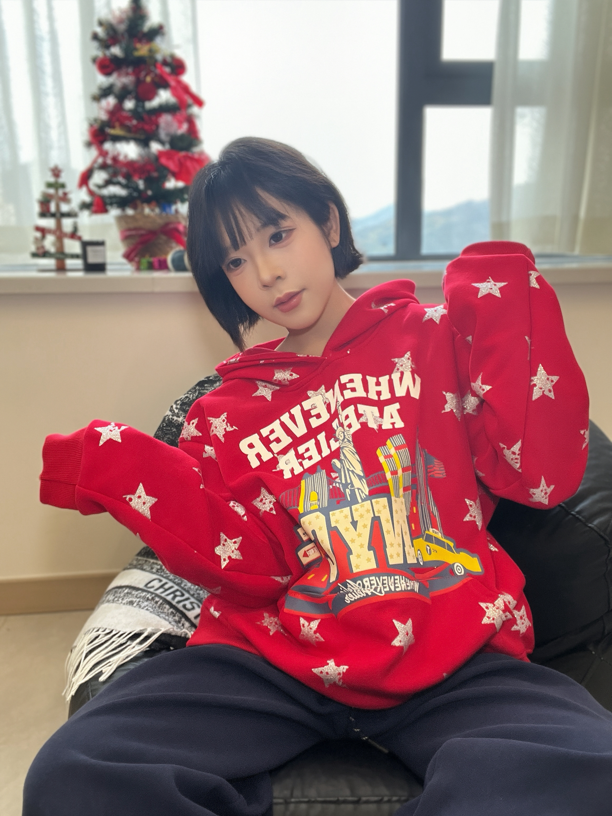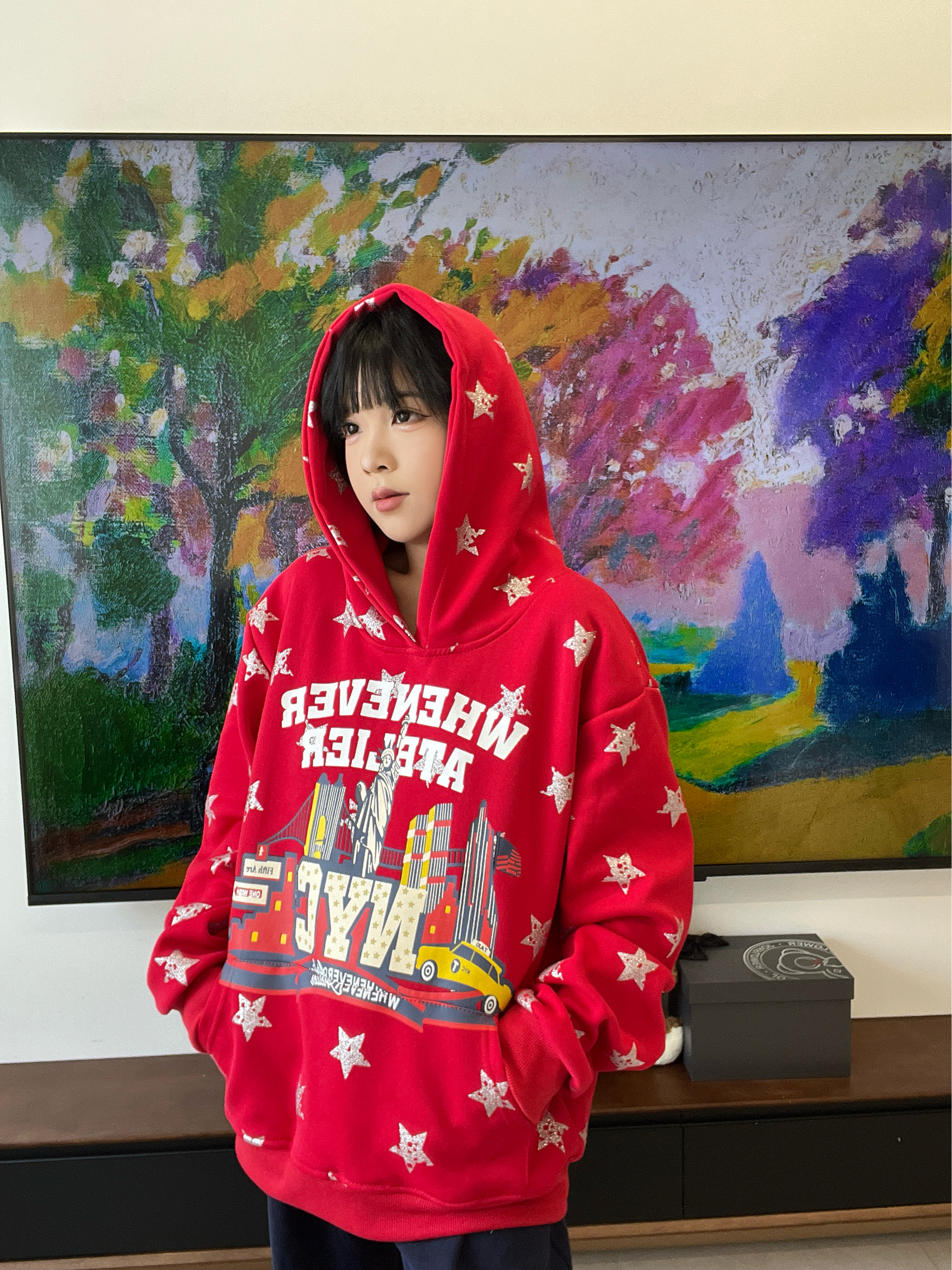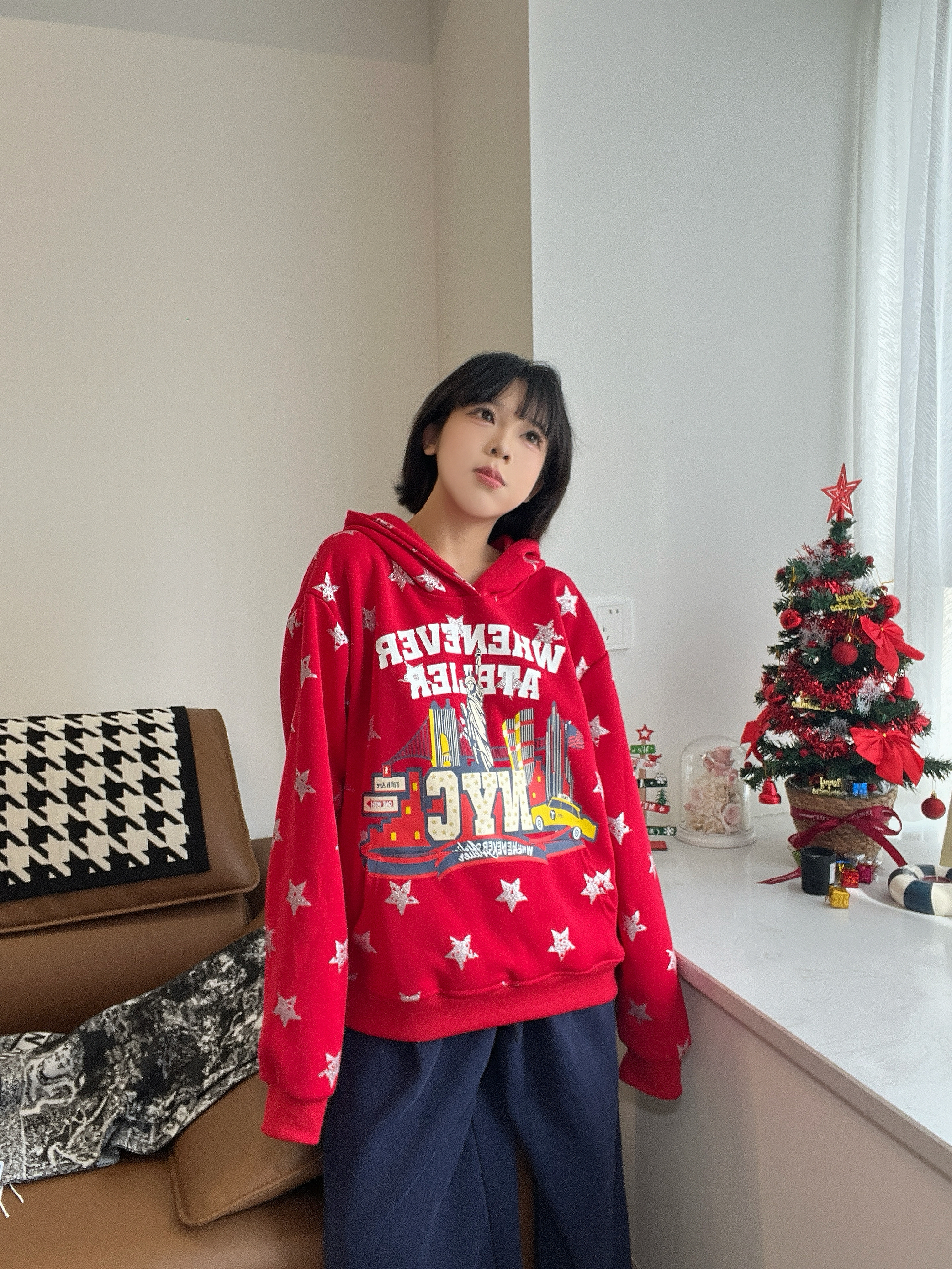 超有氛围感的红色卫衣!好元气☁️好显白!!上面的星星在灯光照射下反光起来更好看捏!! 拍大一码就是Oversize风格,连帽落肩设计显瘦慵懒时髦又随性,有型不软塌 不起球! 好看又好穿,圣诞过年穿它拍照,超喜庆捏🤩红色吸睛亮眼,美腻~