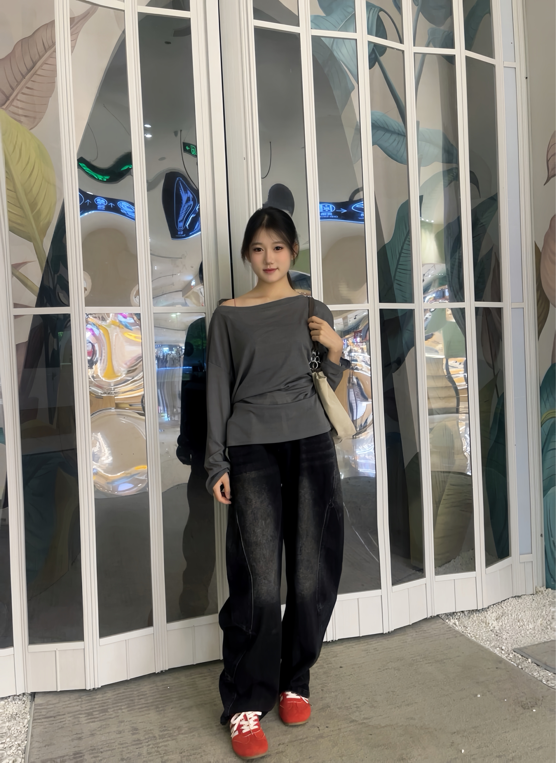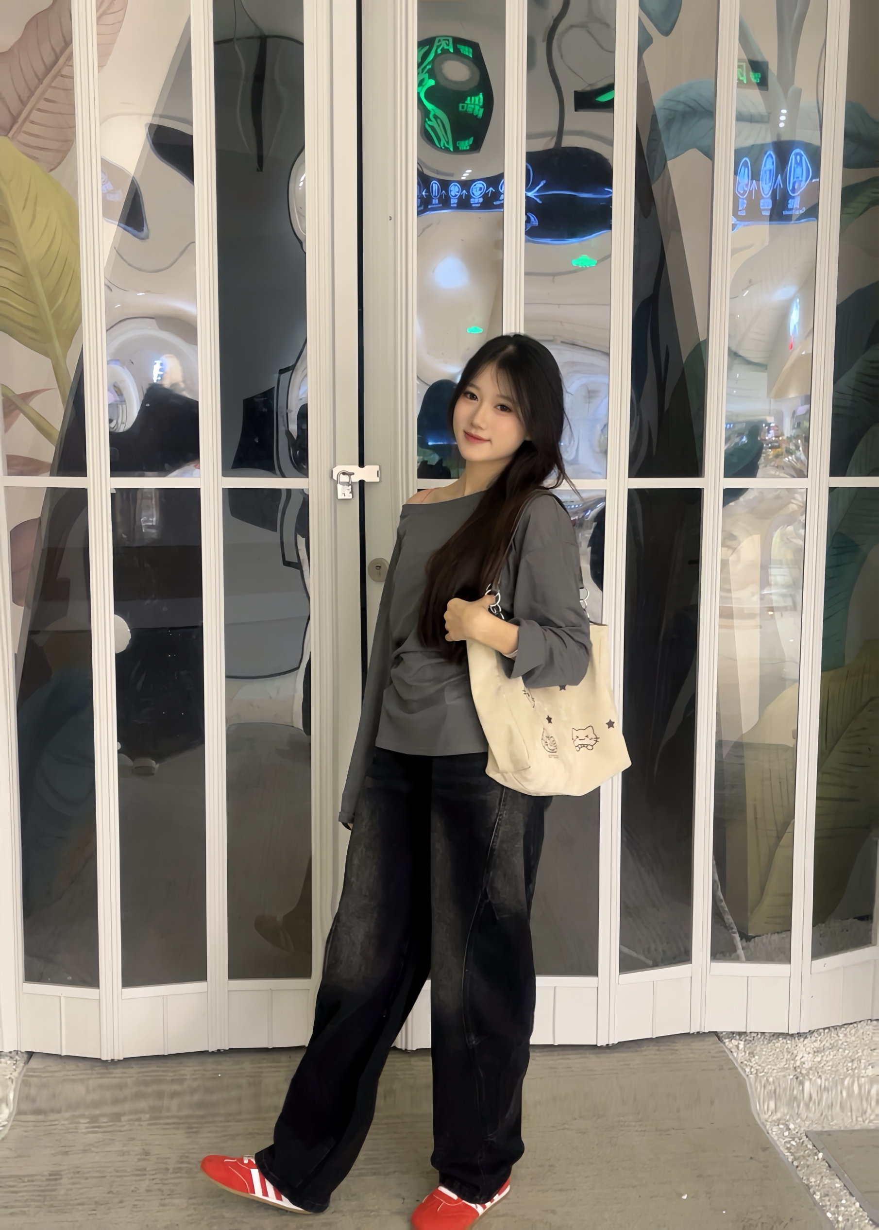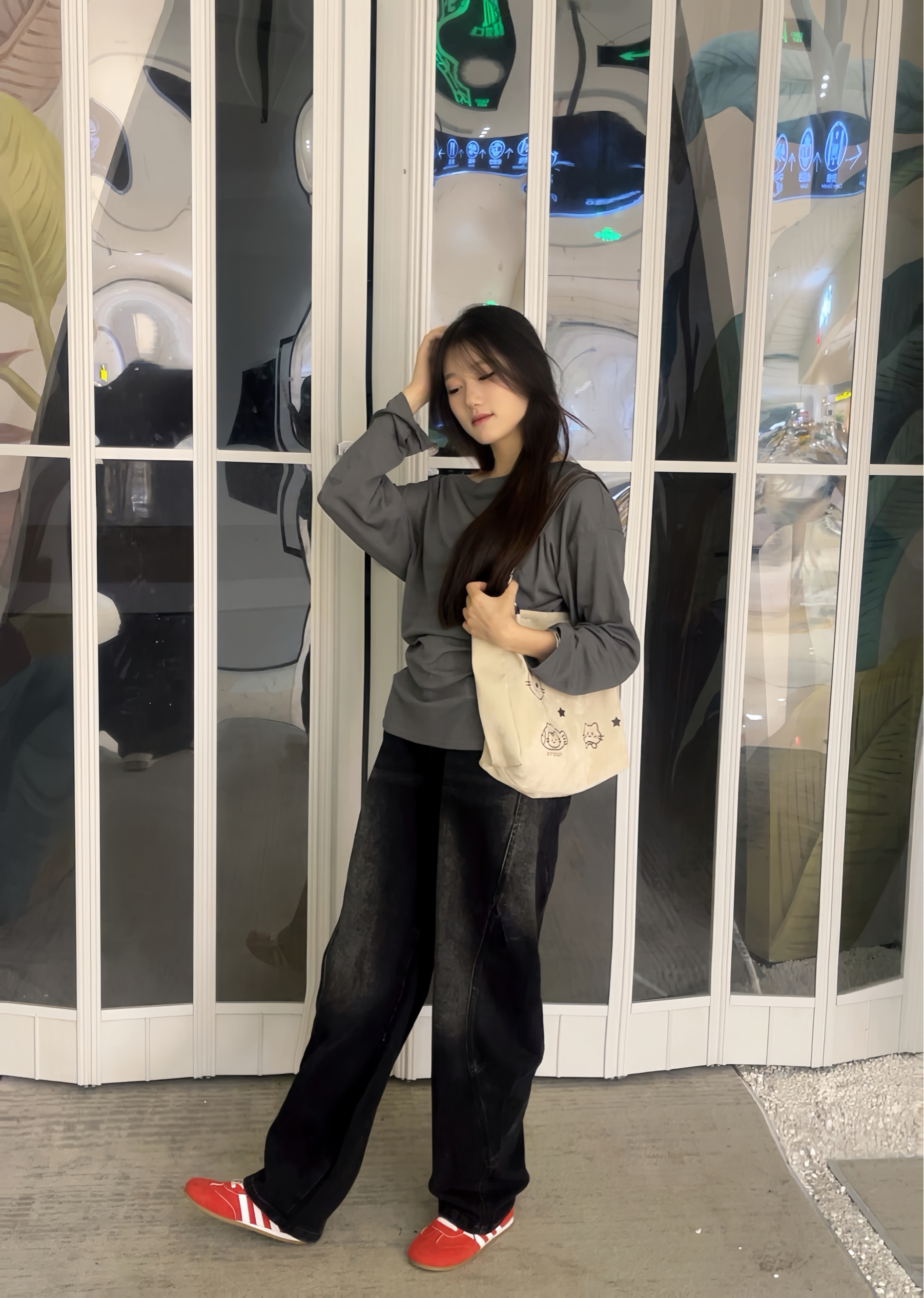 158 92斤这条黑灰色渐变阔腿牛仔裤太合我心意了!🥳 版型是慵懒的弯刀裤型,裤腿的渐变做旧设计超有层次感,不会显得单调。 面料软挺有度,穿上完全不贴腿,垂坠感也超棒,对腿型的修饰效果绝了,梨形身材也能轻松驾驭,走路时裤腿晃荡的慵懒感拉满。😻😍 搭配简约的灰色露肩上衣,再用红鞋点缀,休闲中带着设计感,出门穿回头率超高~🥹