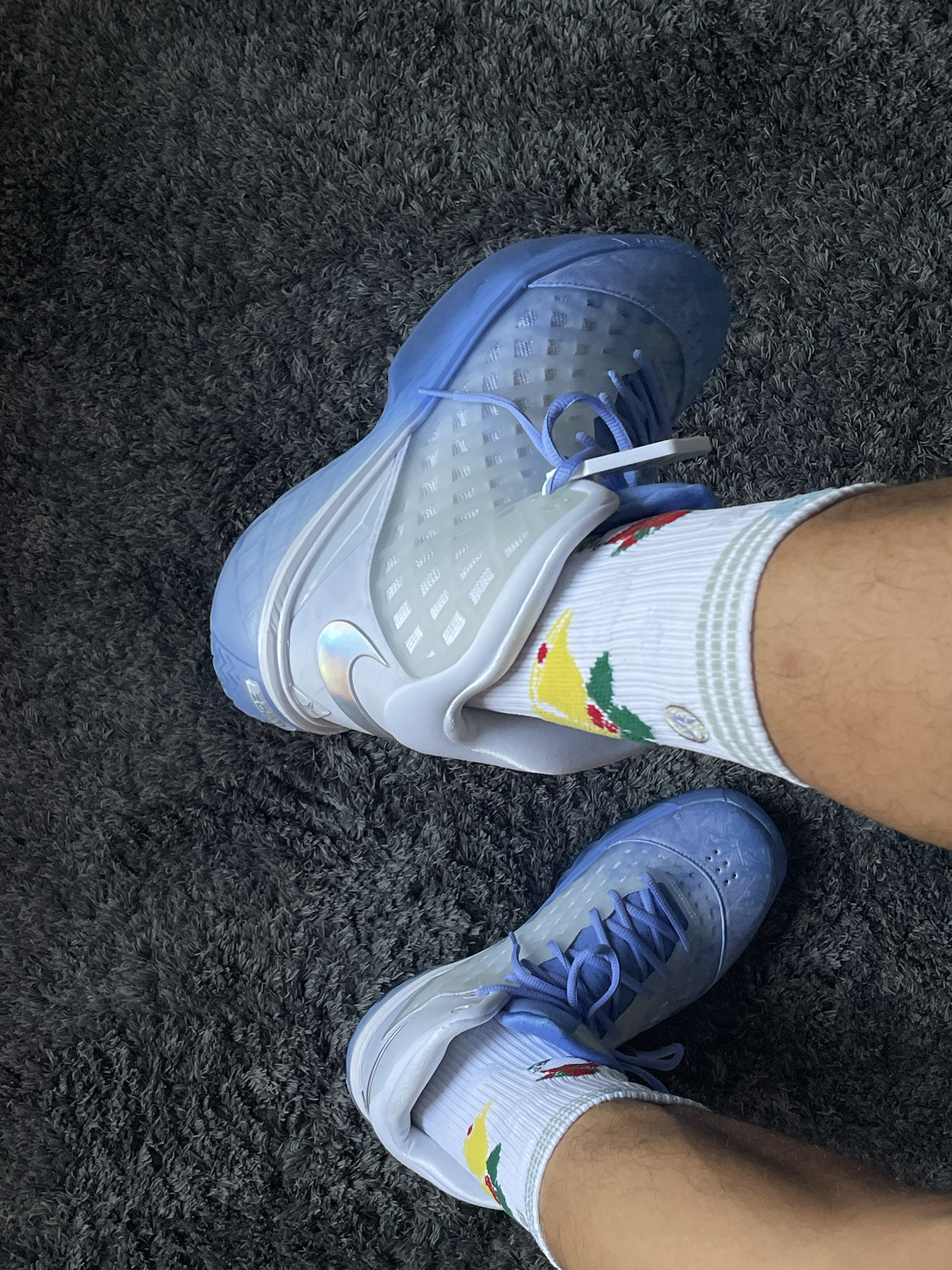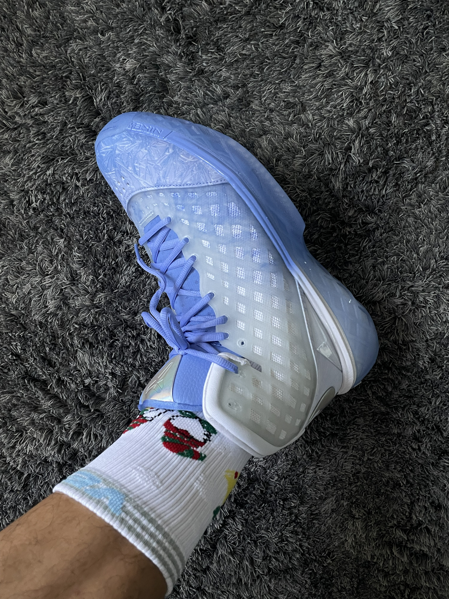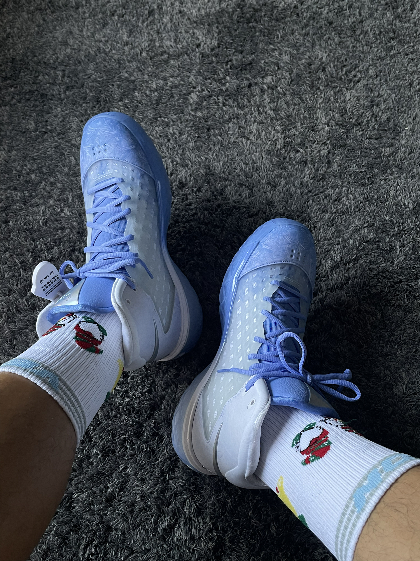 去年圣诞上脚了红红火火的kobe9🎄,今年试试这款冰蓝色的kobe3!这次搭配维动 VEIDOORN 的圣诞系列,上面的铃铛和胖胖圣诞老人真的蛮可爱,一上脚氛围感就来了! 圣诞系列🧦整体的厚度还可以,个人感觉比隼系列要厚,跟恶魔系列差不多的厚度,搭配买了大一码kobe3,系好鞋带后刚刚好,包裹不错,整体还是非常紧实的,没有出现勒脚的情况。这样搭配参加圣诞大战,你们觉得怎么样? #维动圣诞...